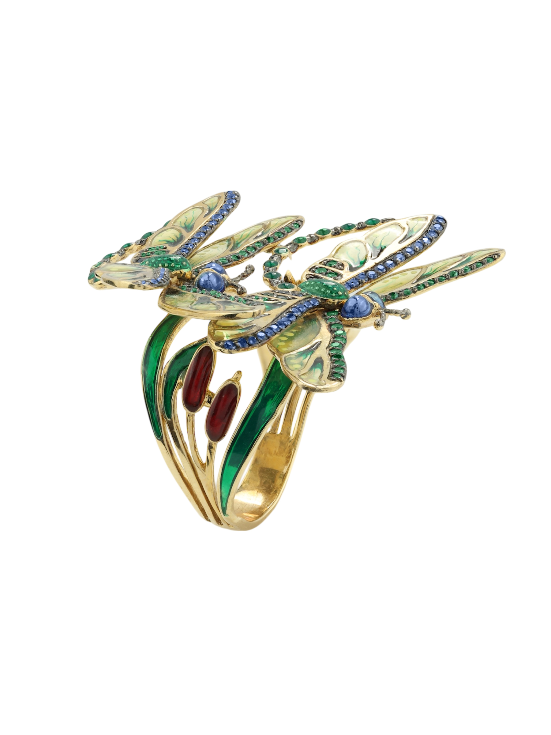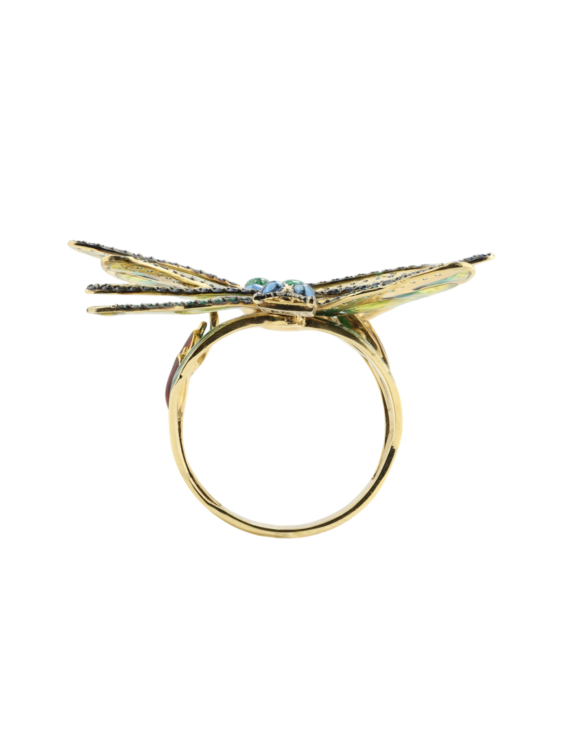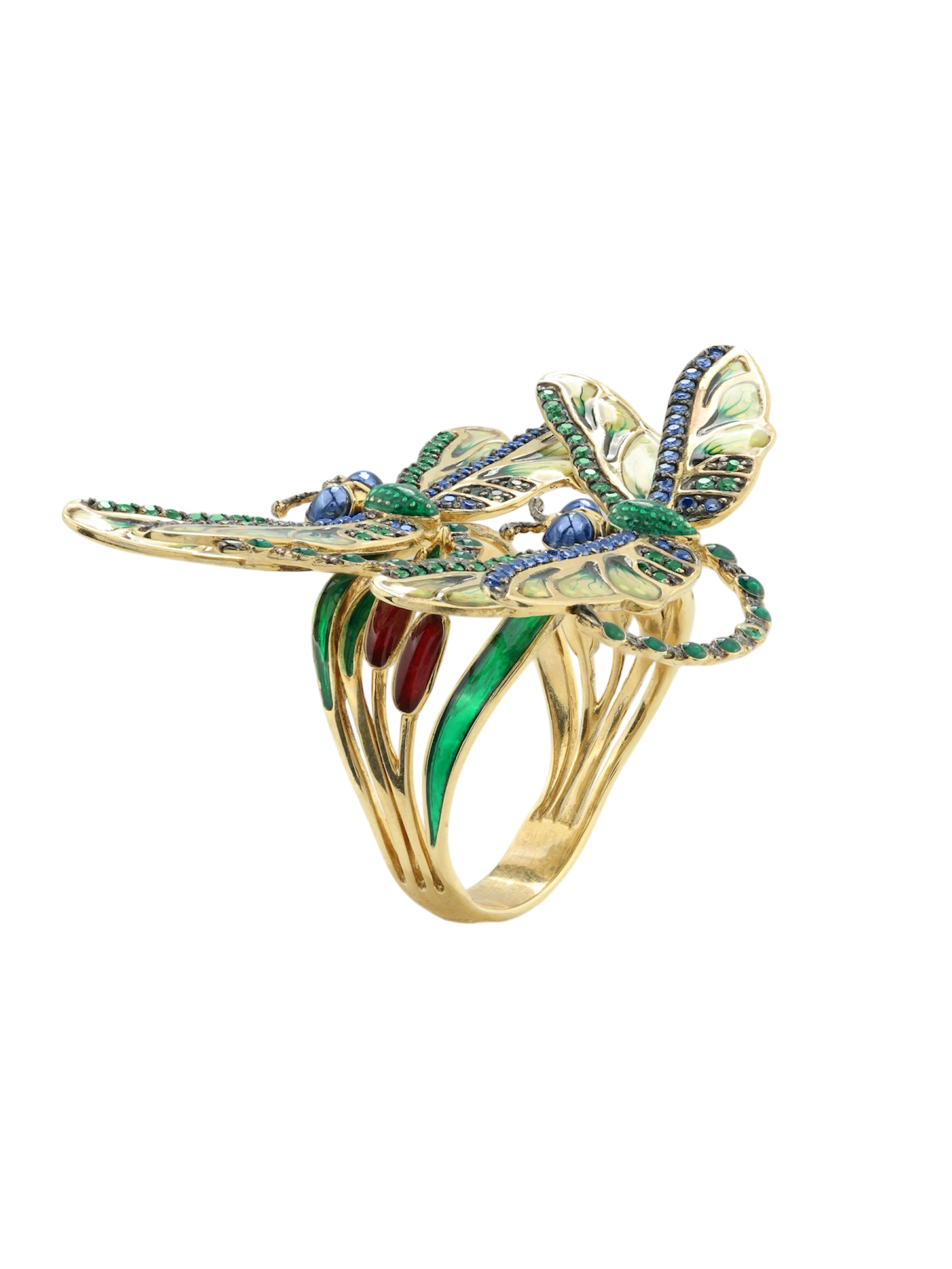 Кольцо из лимонного золота c сапфиром, изумрудом и эмалью