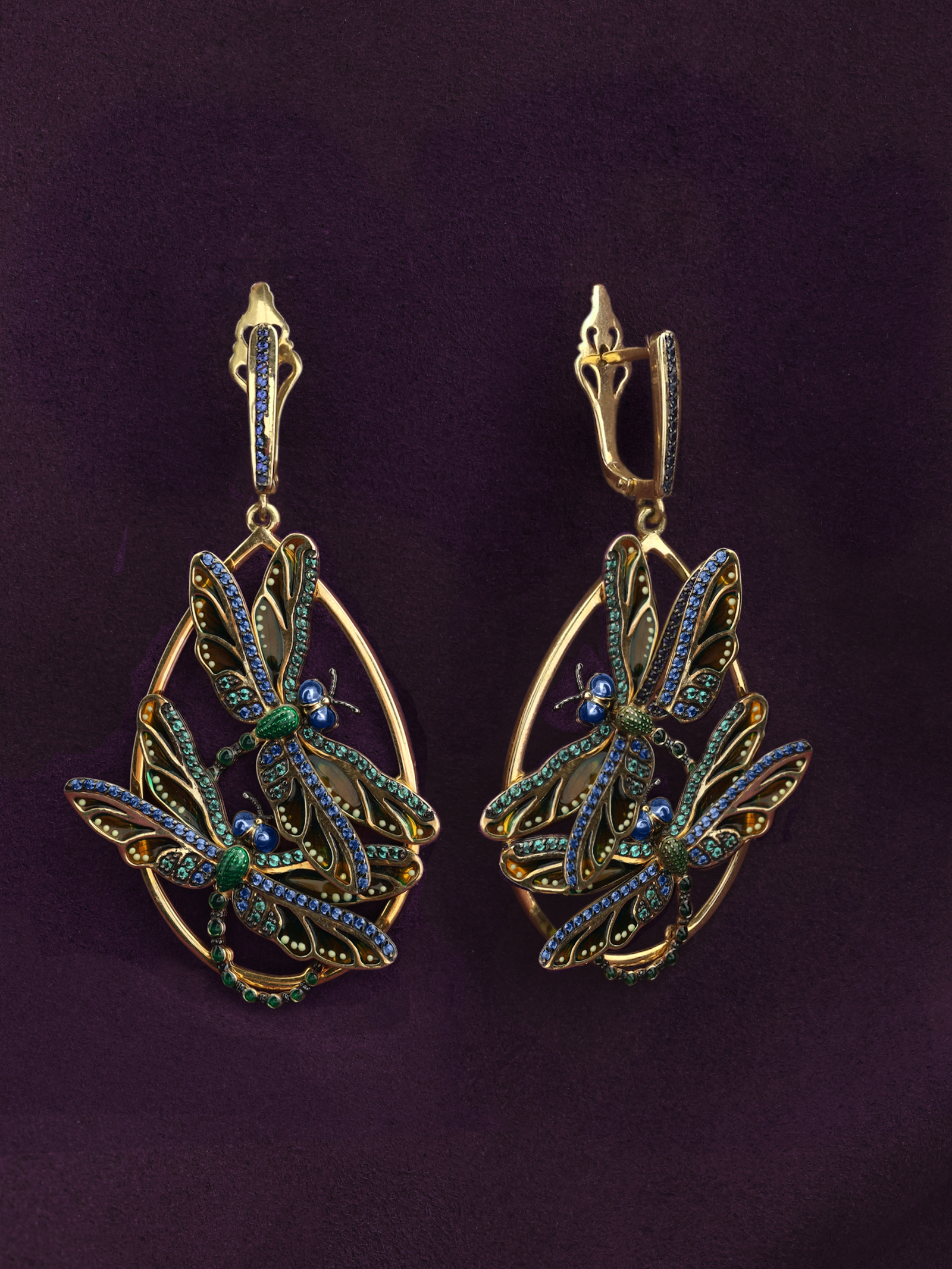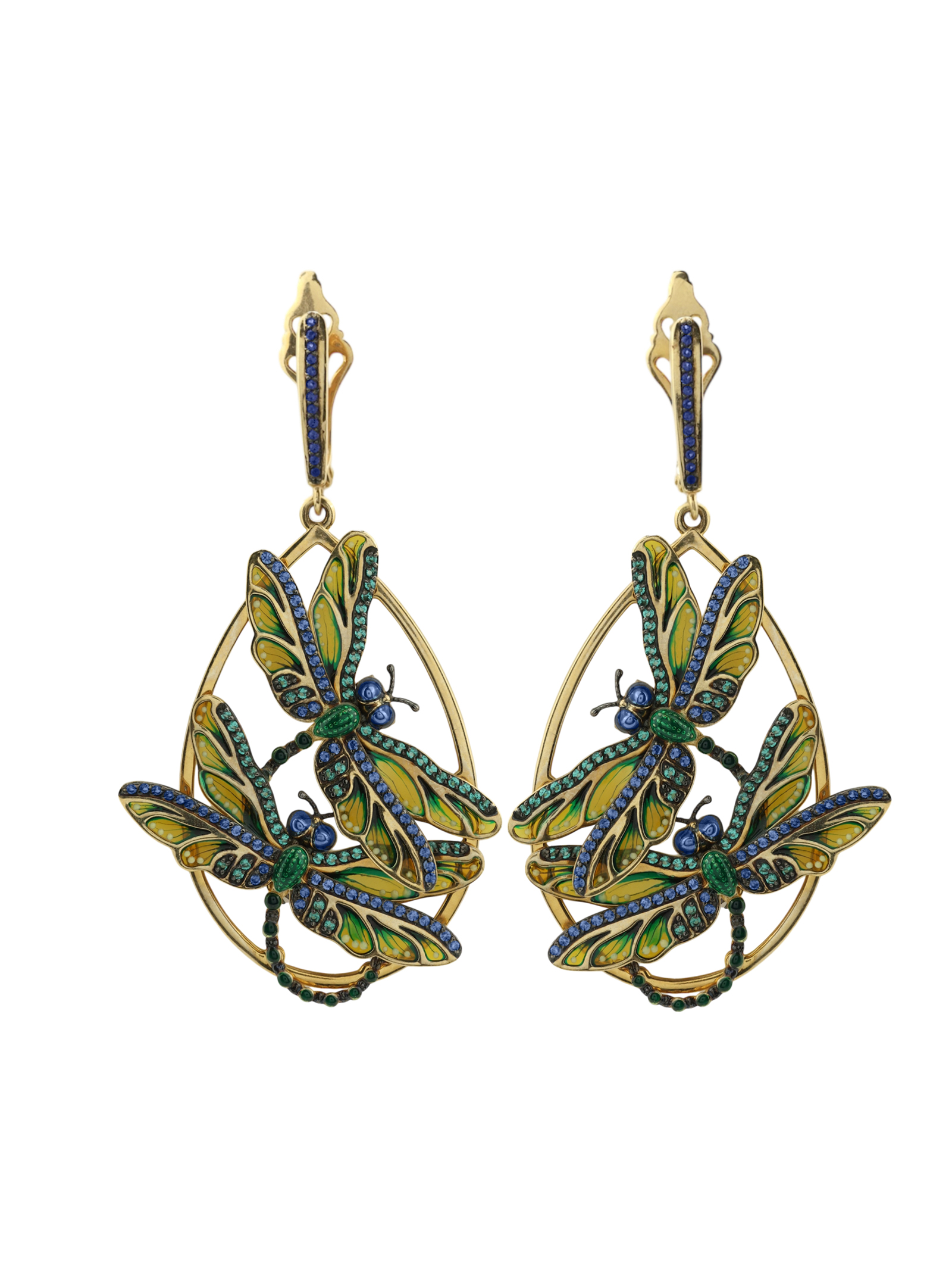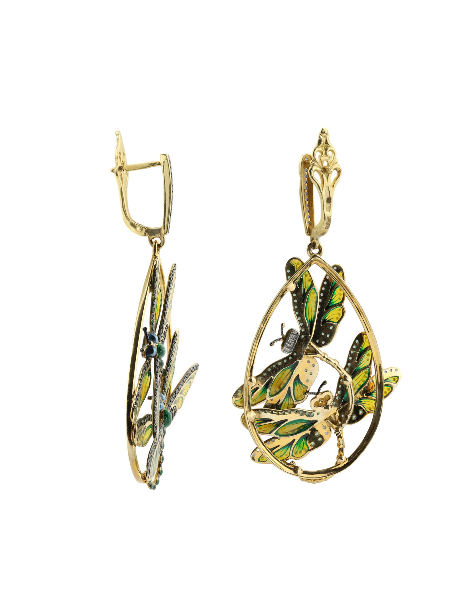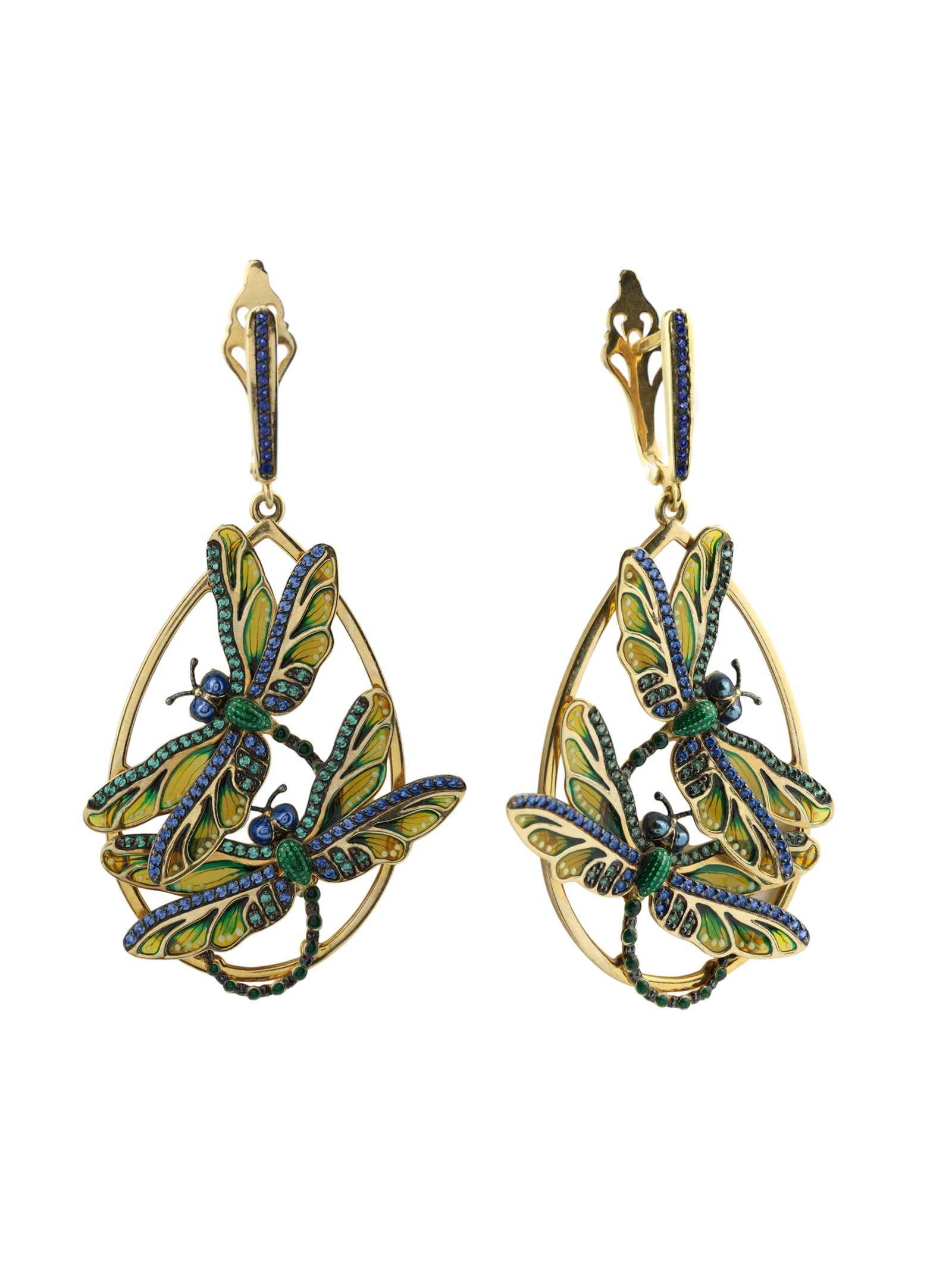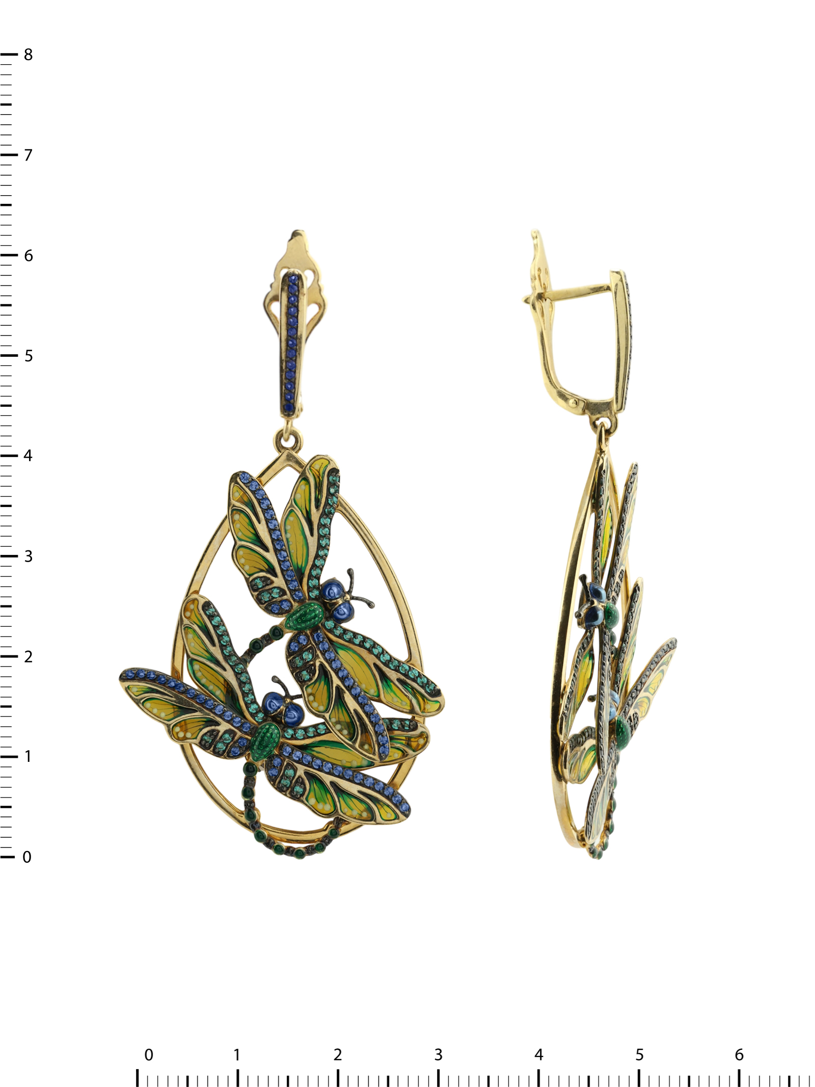 Серьги из лимонного золота c сапфиром, изумрудом и эмалью