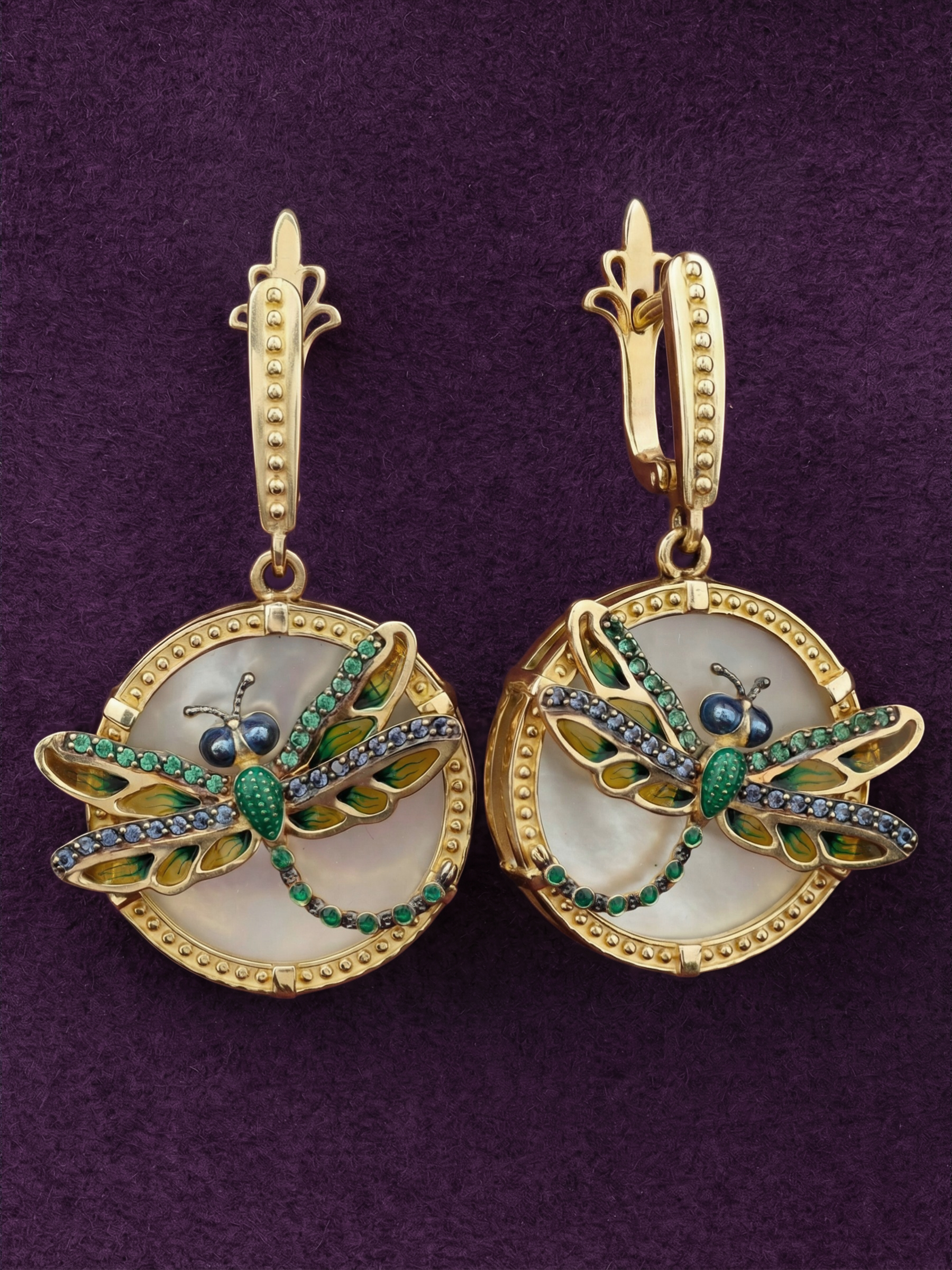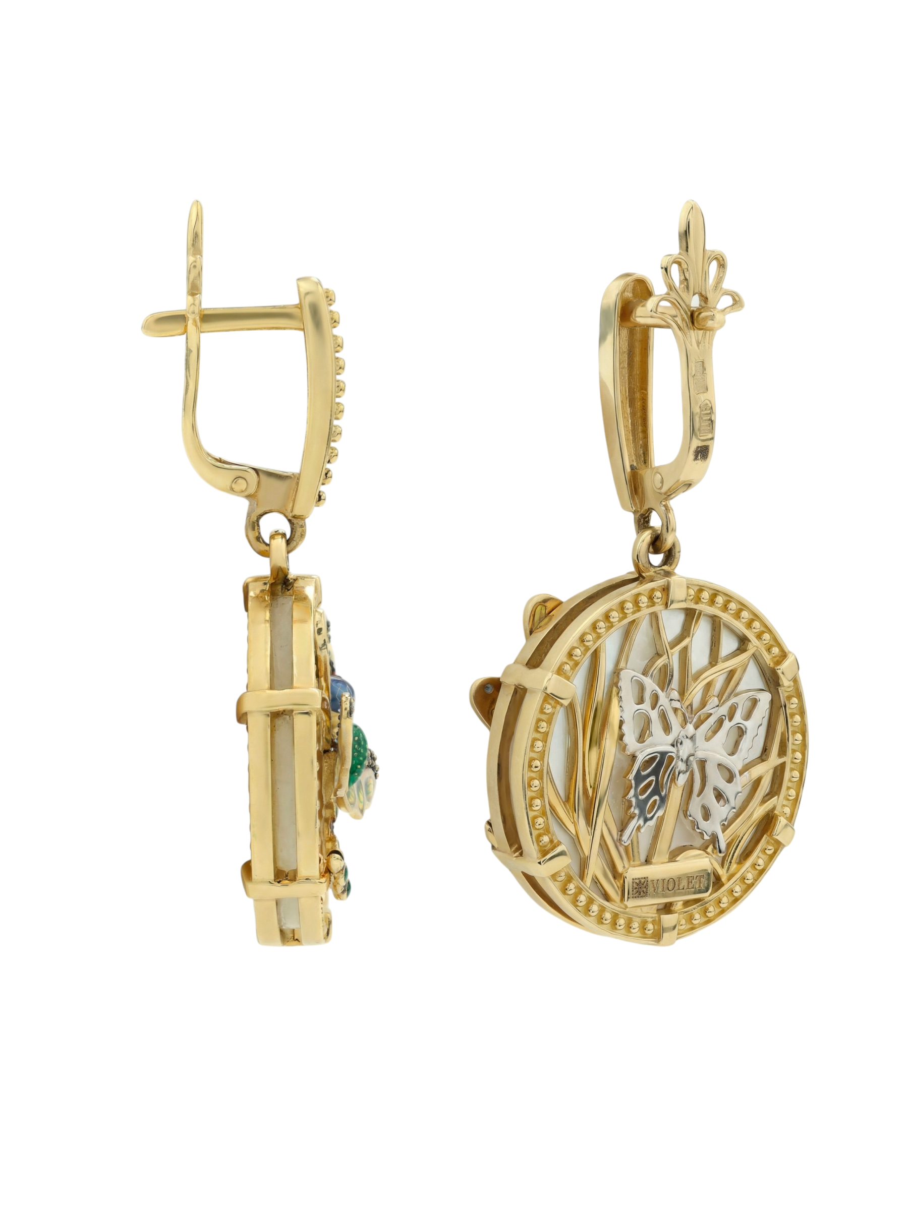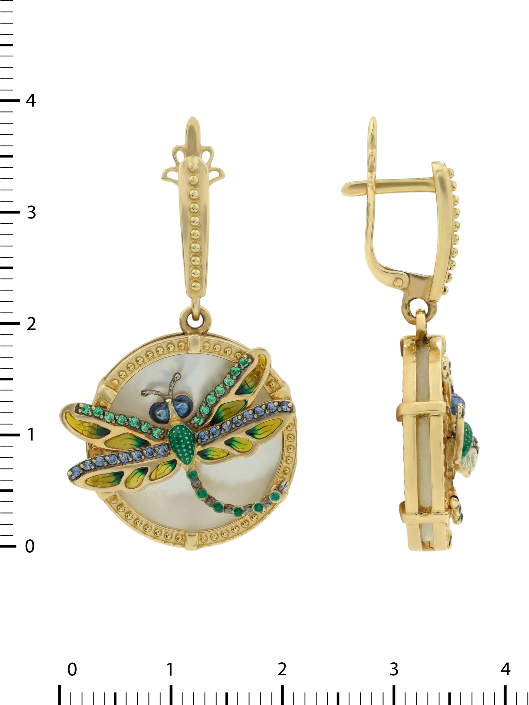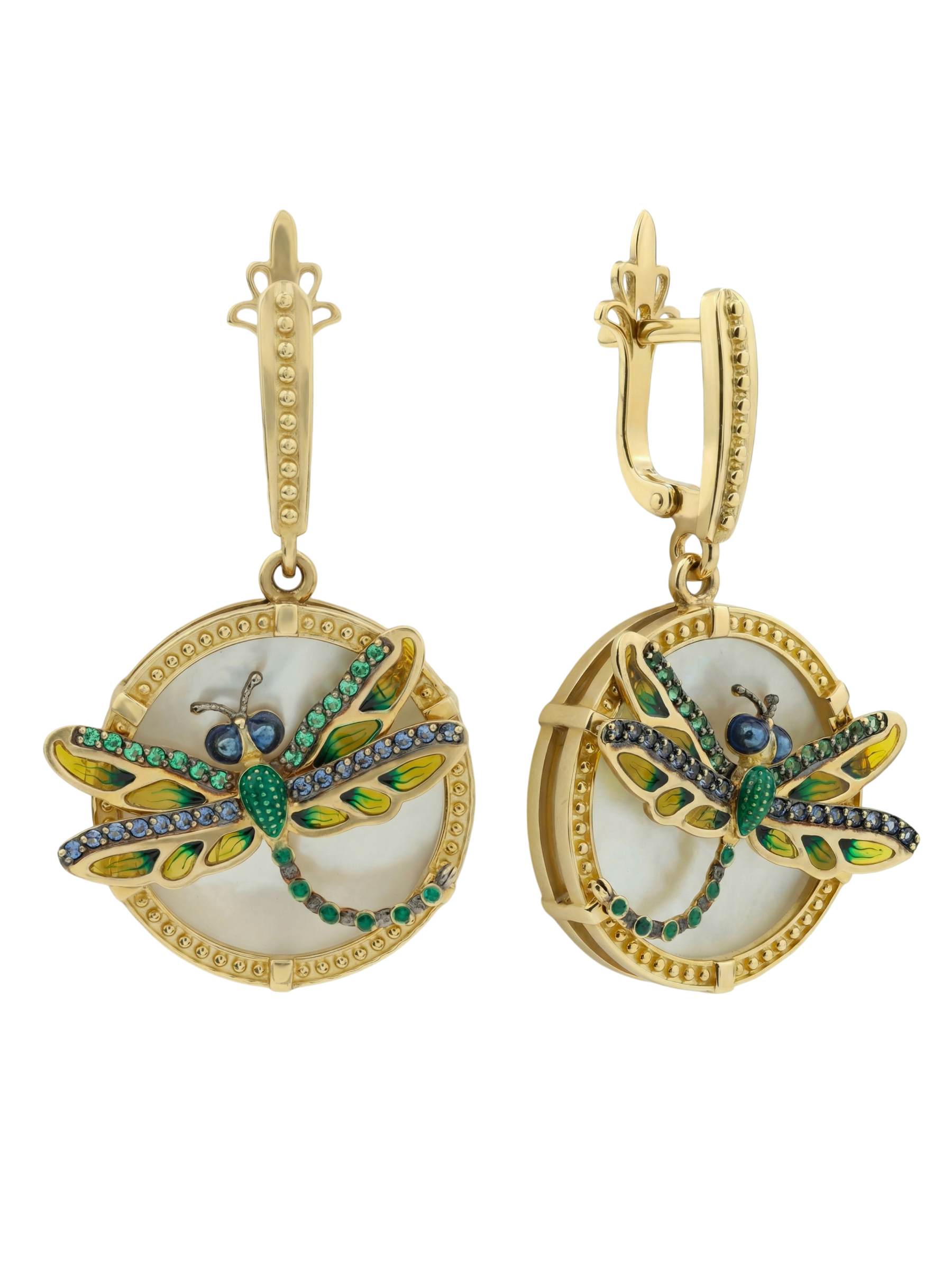Серьги из лимонного золота c сапфиром, изумрудом, эмалью и перламутром