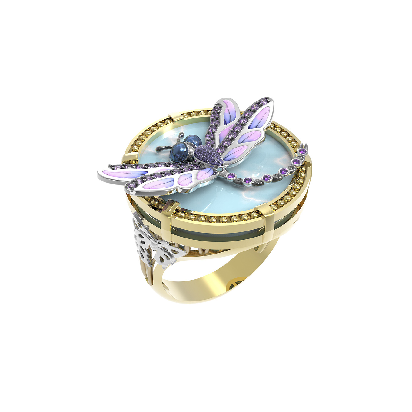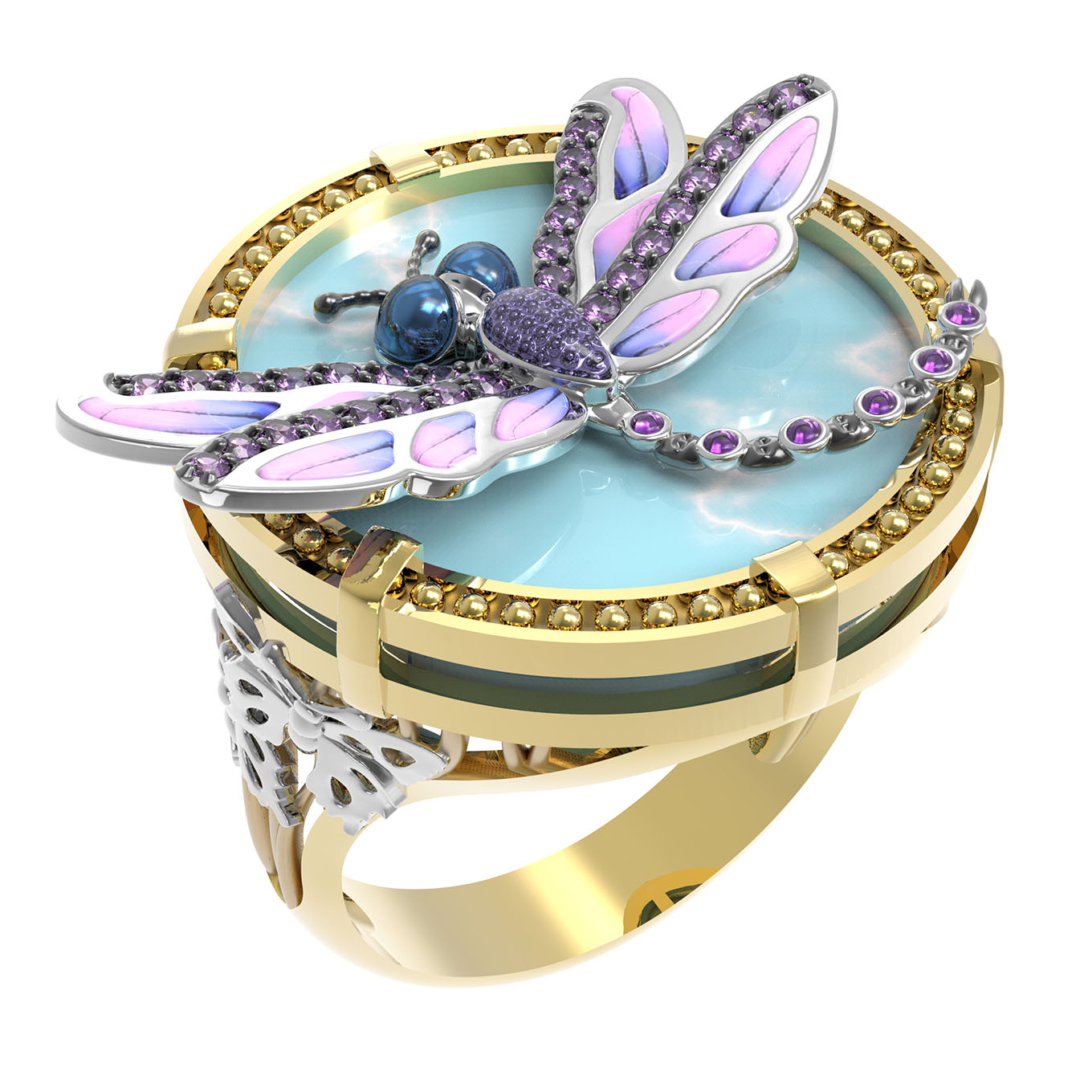 Кольцо из лимонного золота c бирюзой, аметистом и эмалью