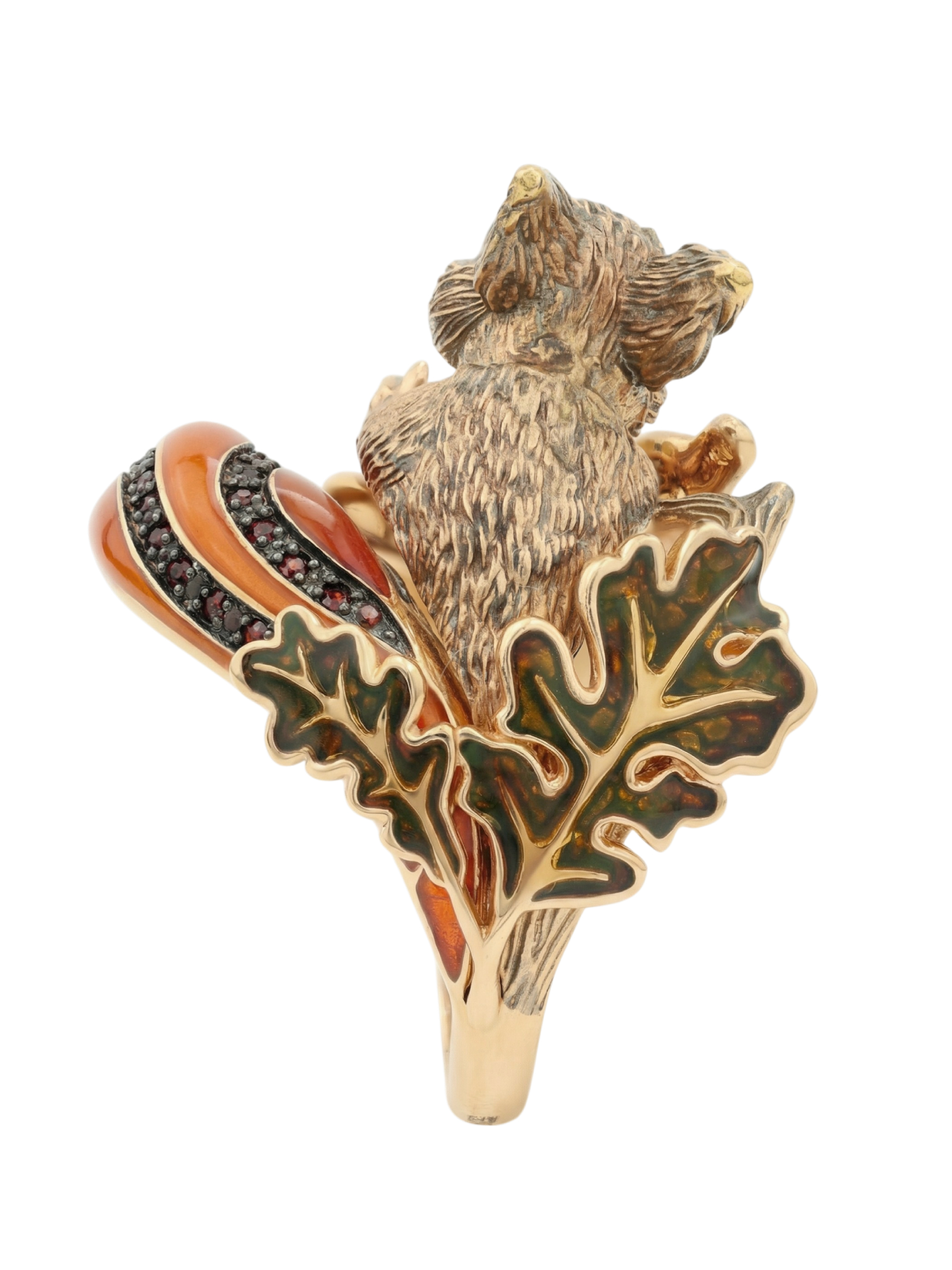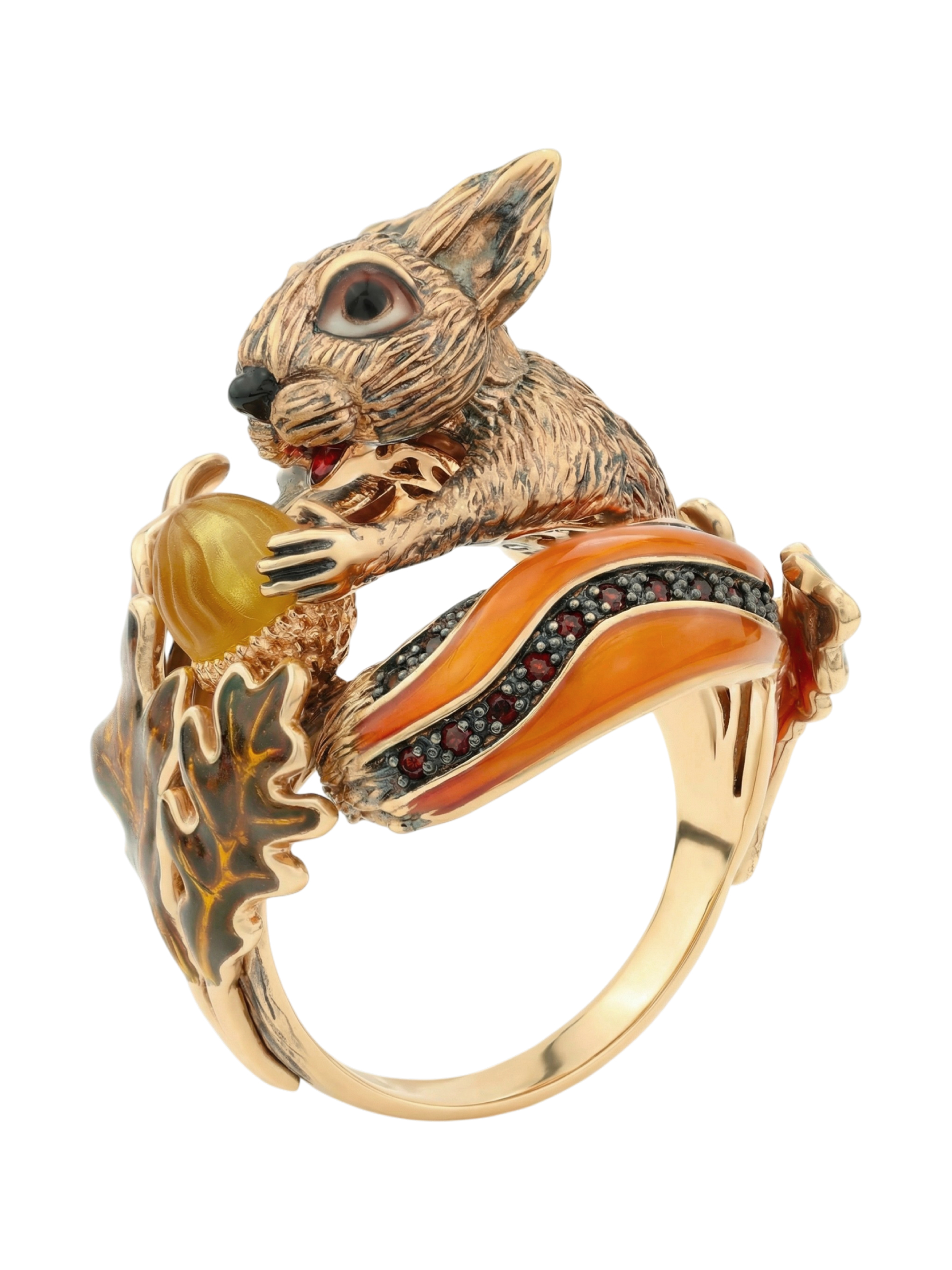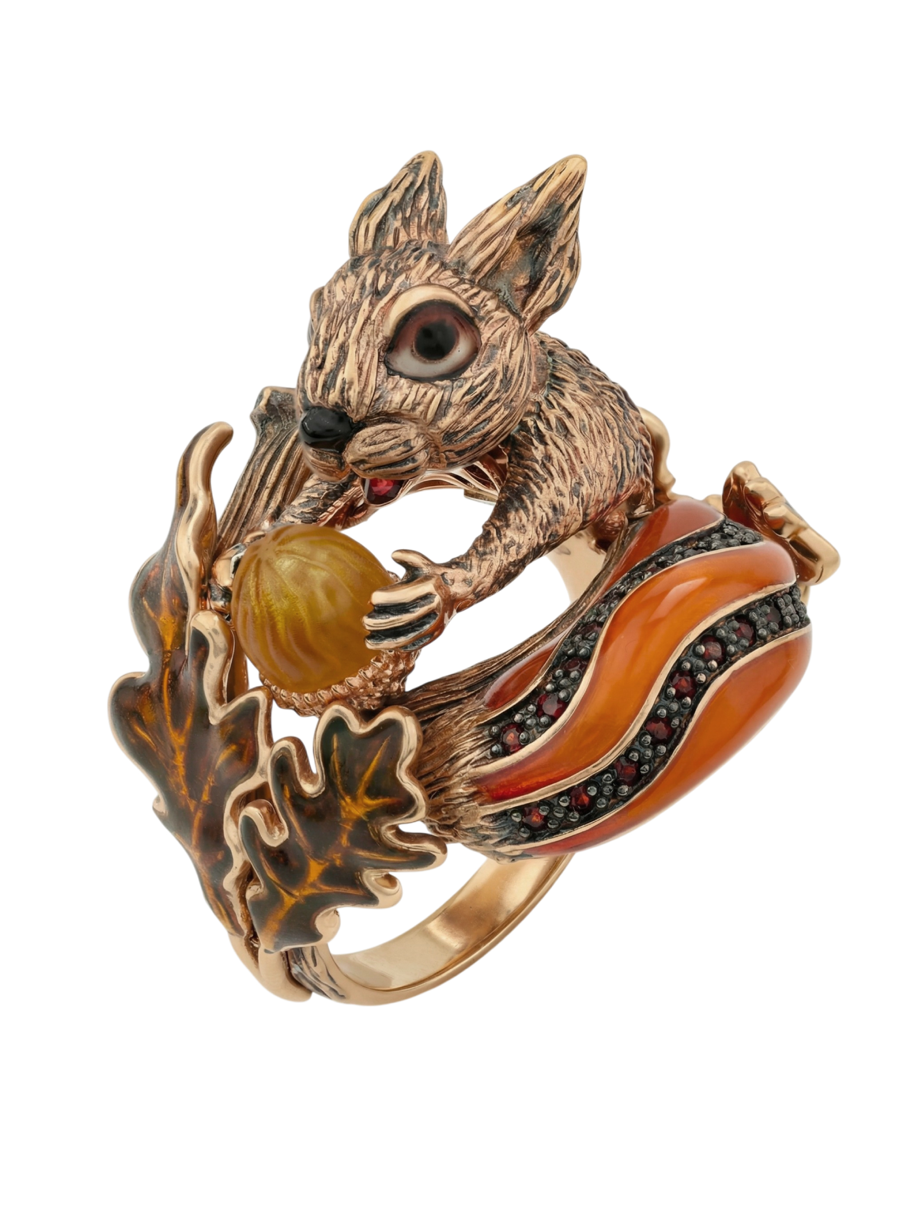 Кольцо из золота c эмалью, гранатом и янтарём