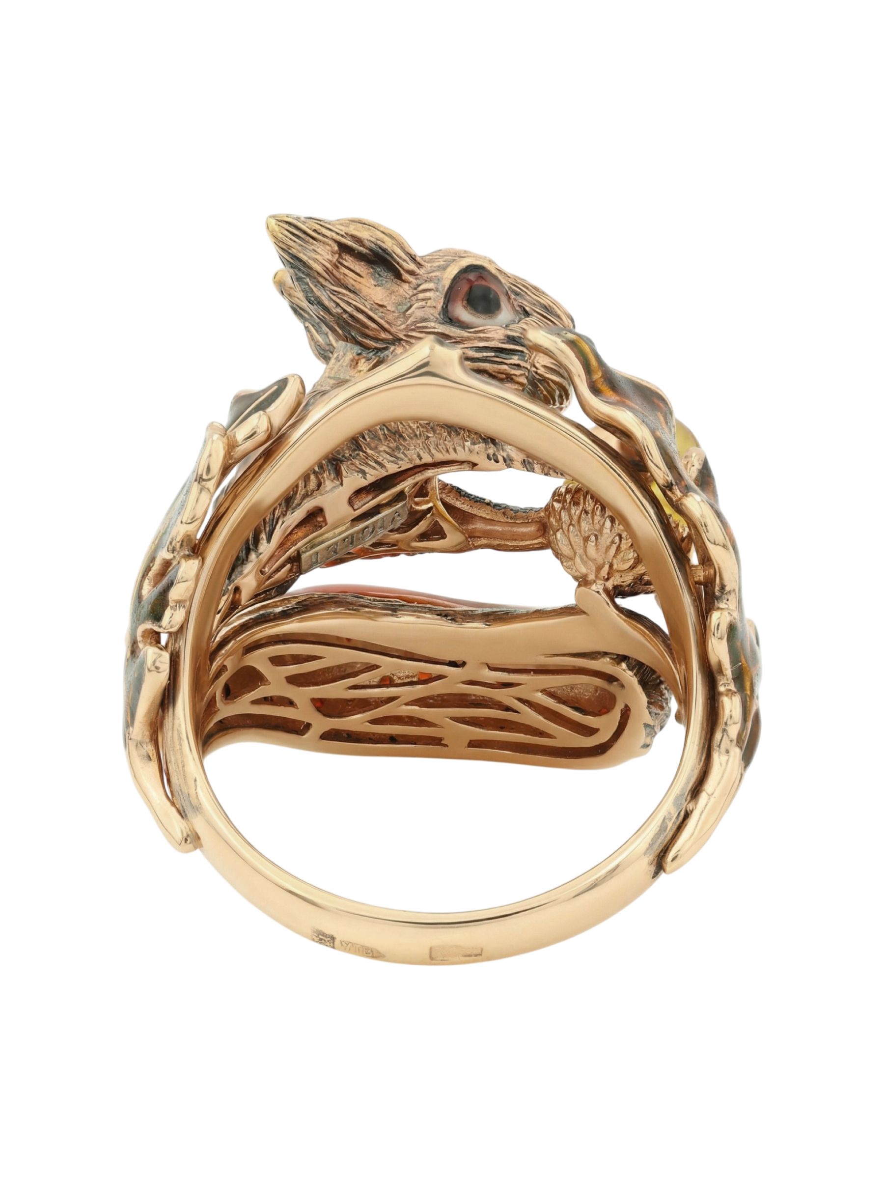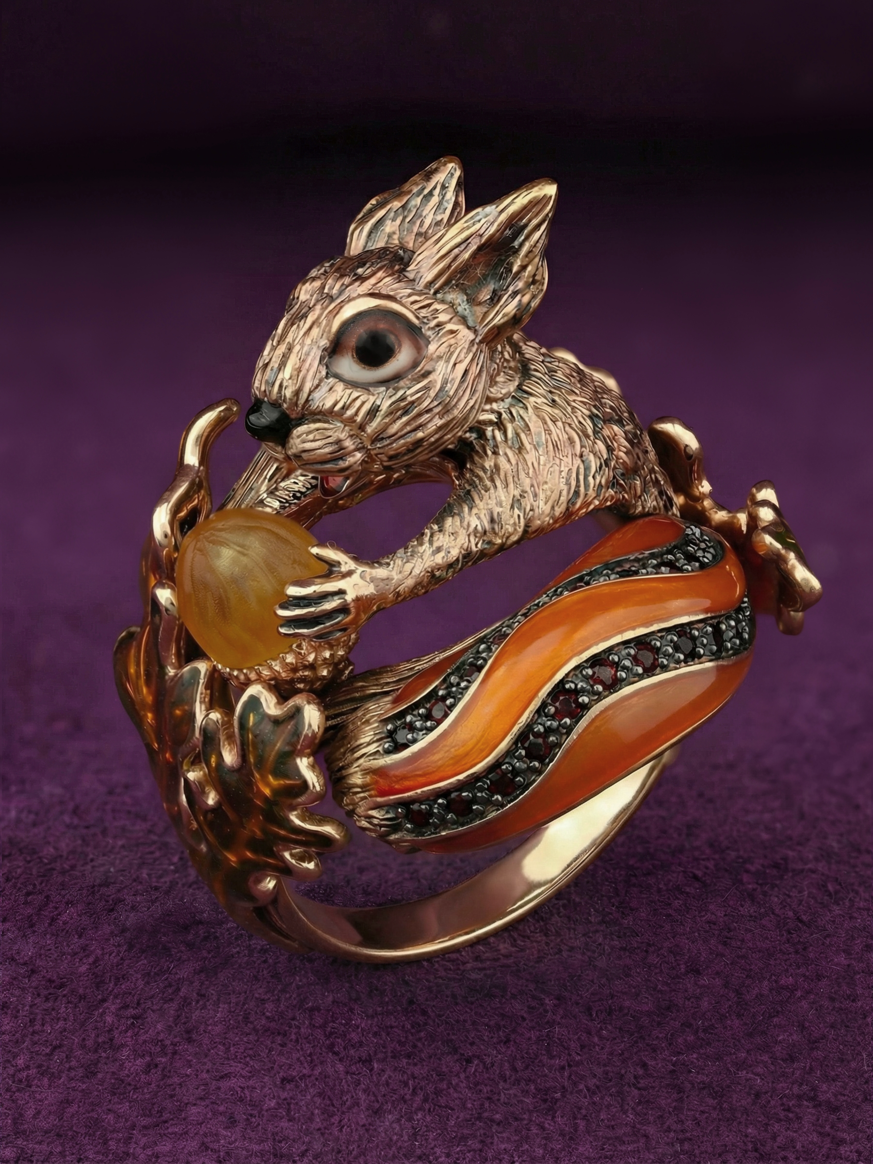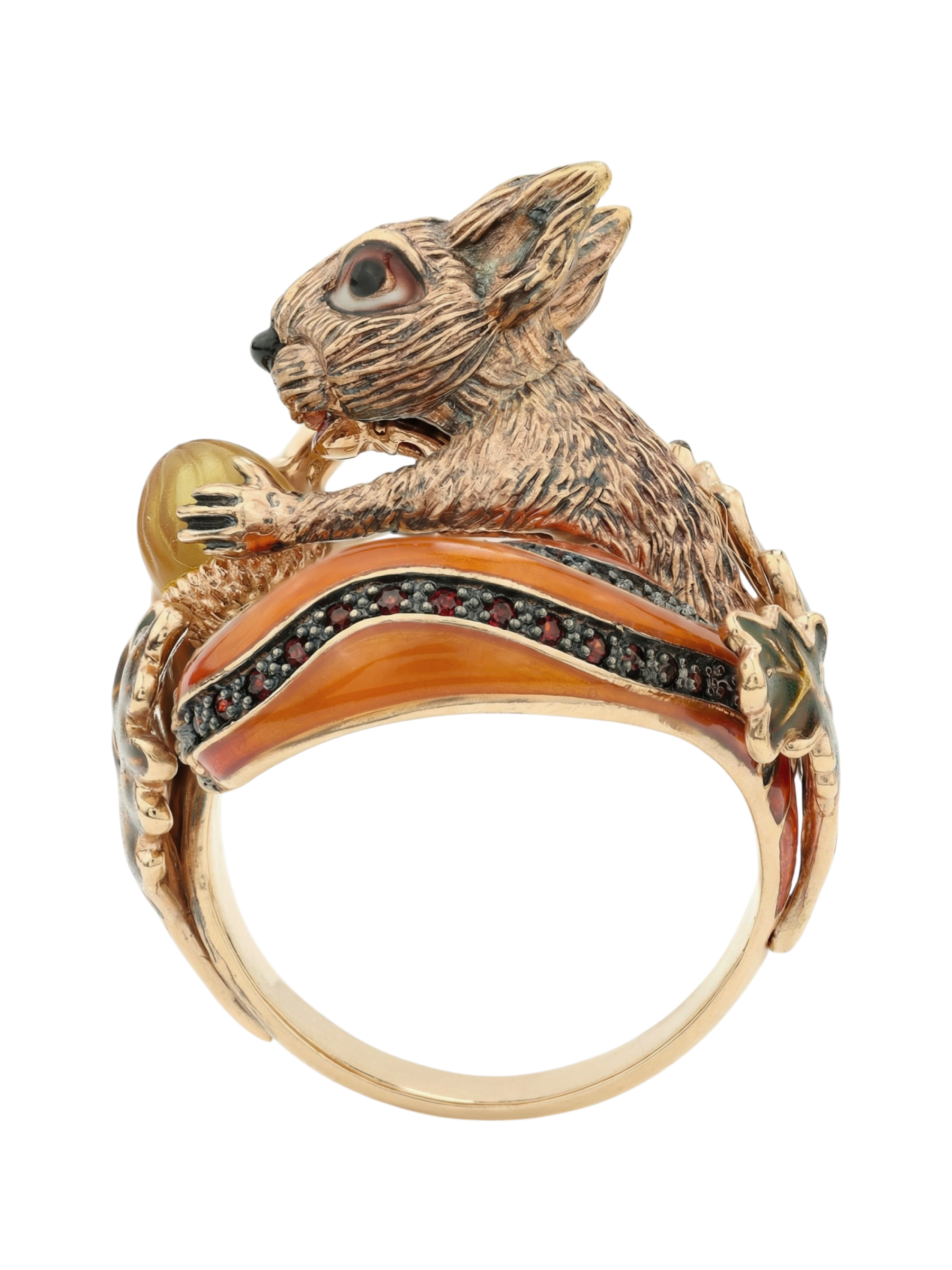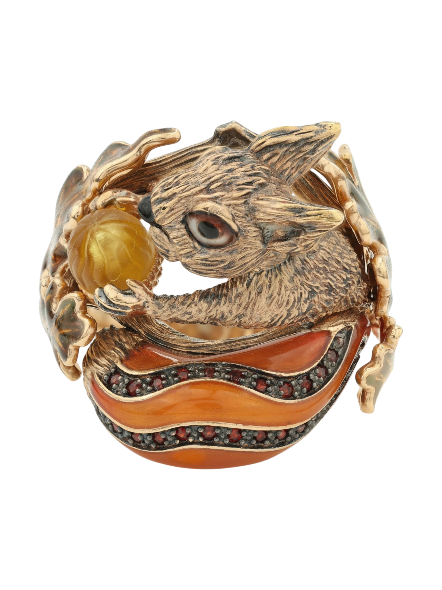 Кольцо из золота c эмалью, гранатом и янтарём