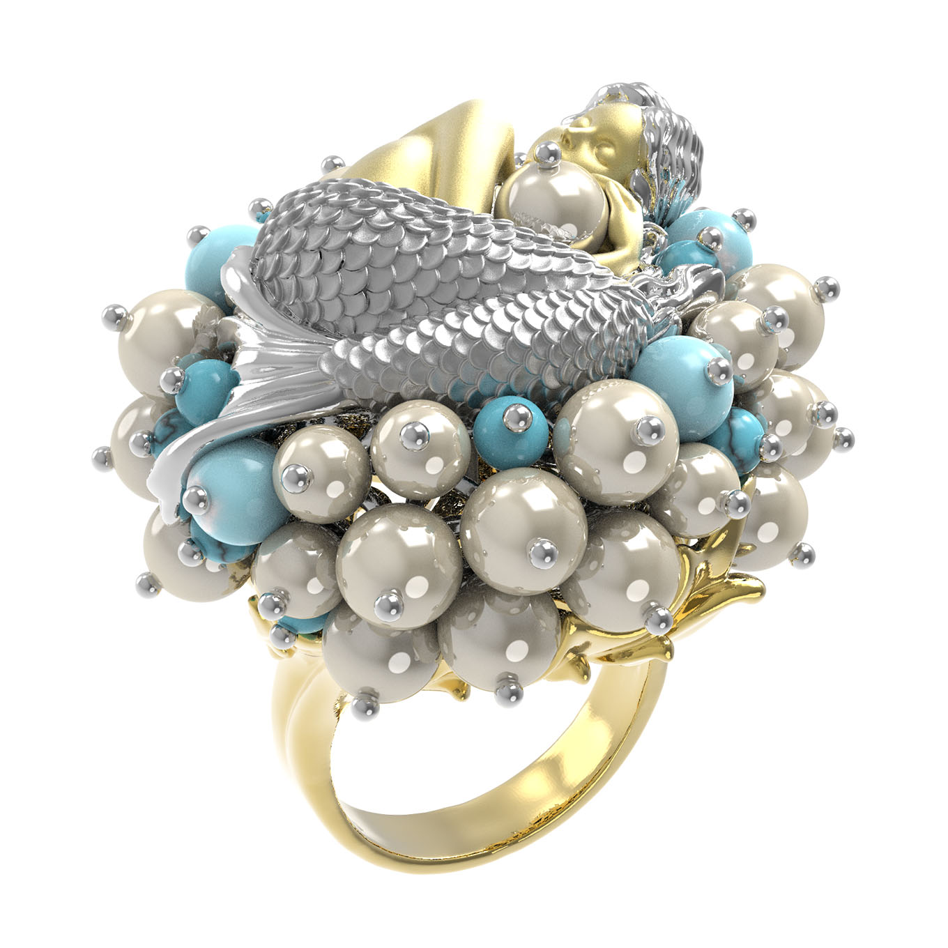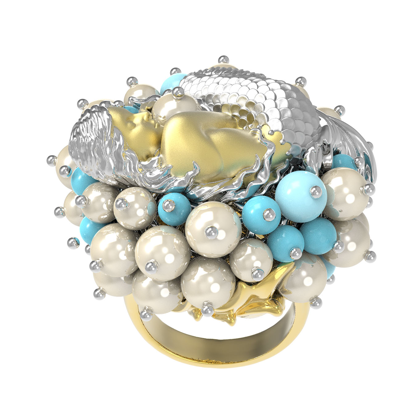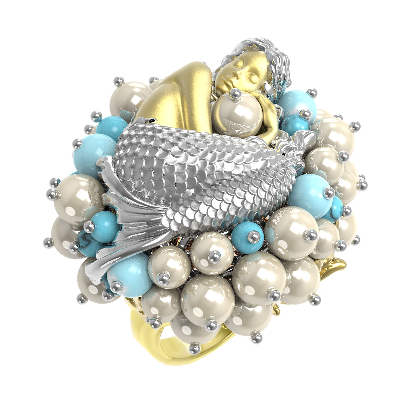 Кольцо из лимонного золота c жемчугом и бирюзой