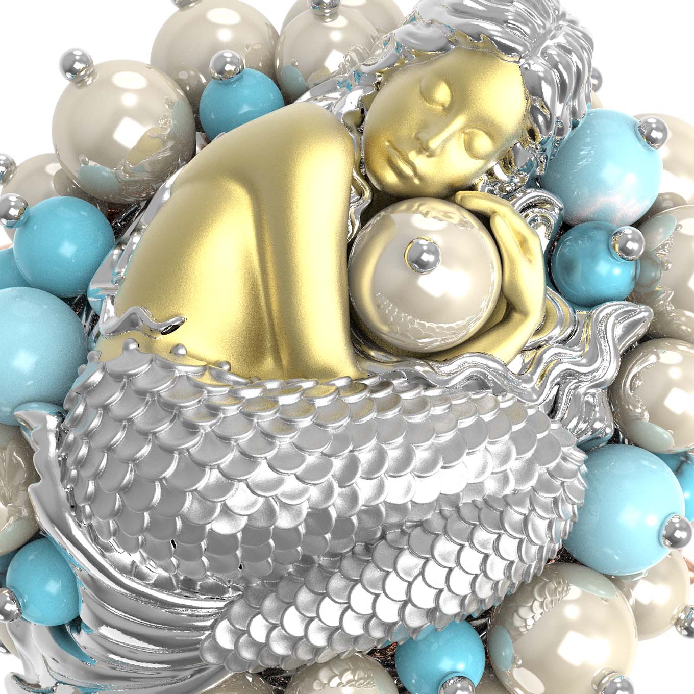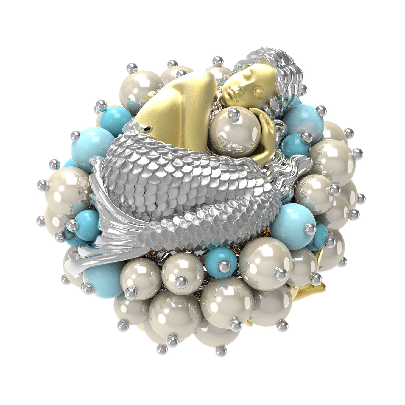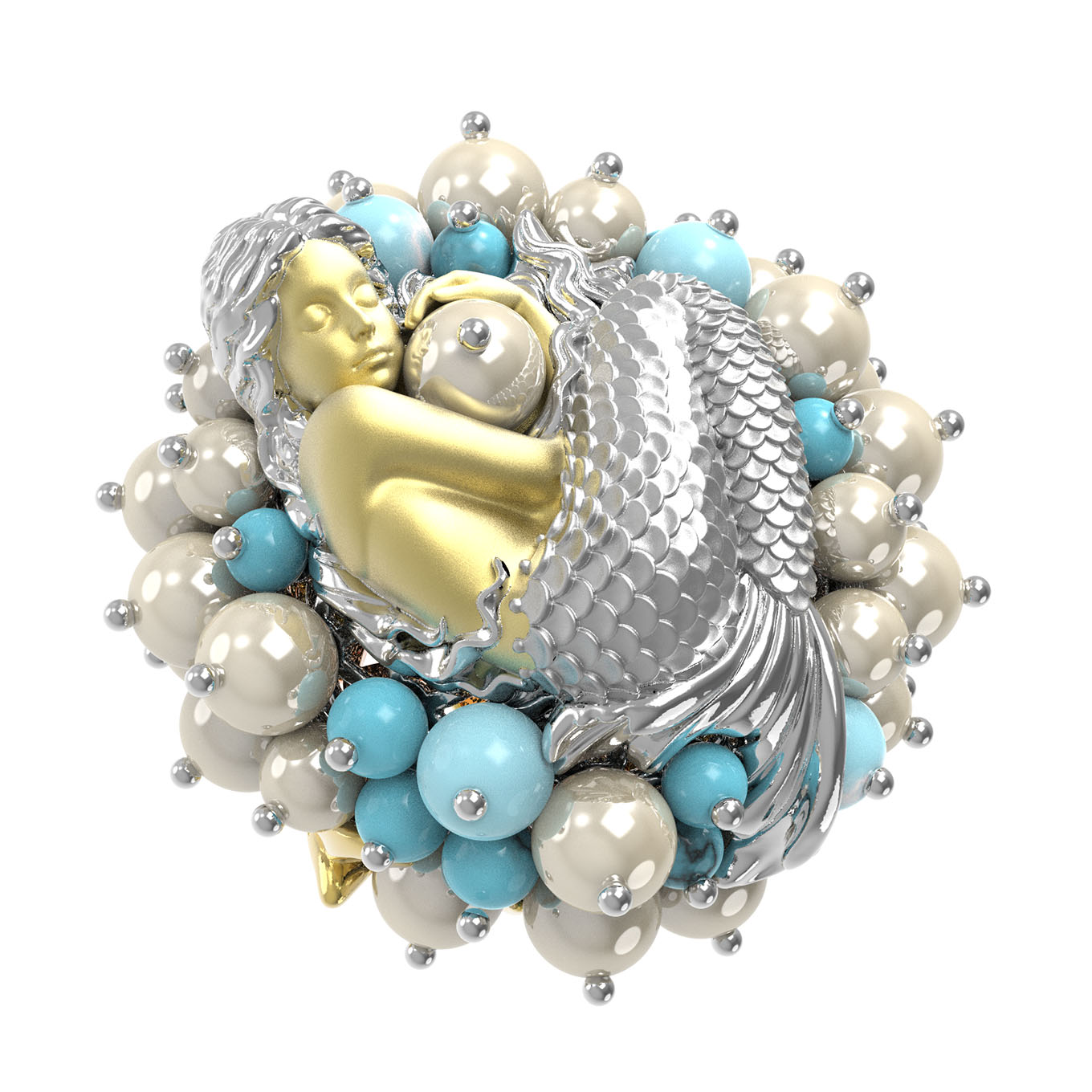 Кольцо из лимонного золота c жемчугом и бирюзой