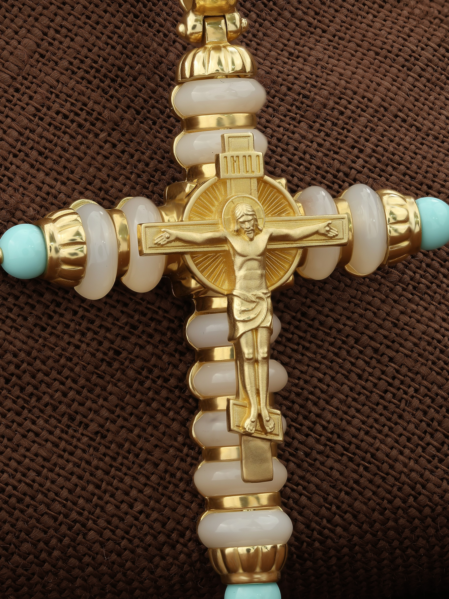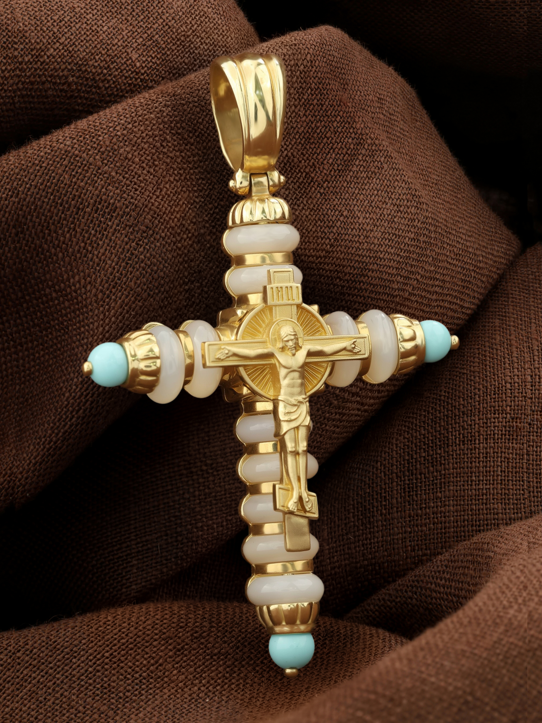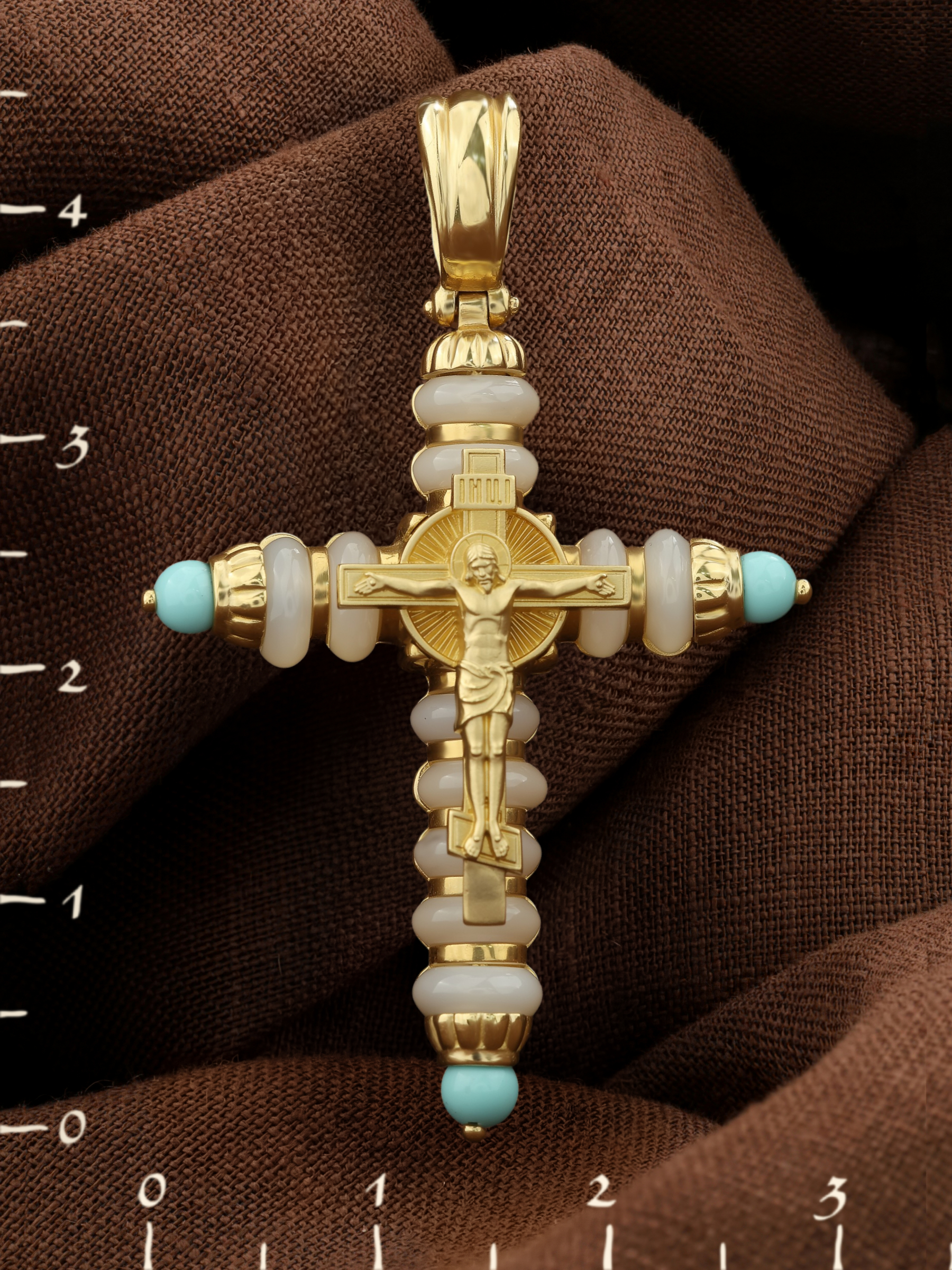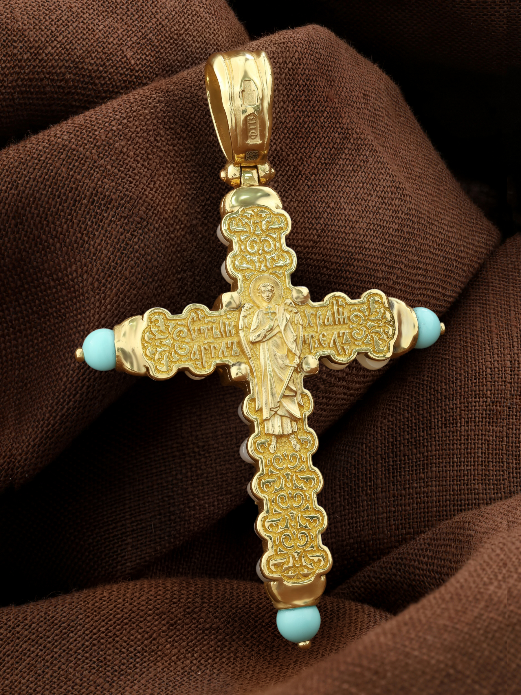 На лицевой стороне креста изображено Распятие Господа и Спасителя нашего Иисуса Христа, отдавшего Себя на смерть для искупления грехов мира. Крест является символом жертвенной любви Всеблагого Бога к падшим людям, всепобеждающим духовным оружием христиан, основанием и средоточием церковной жизни. Над вершиной Распятия помещена надпись «Царь Славы». На верхней перекладине расположена надпись «IНЦI». Она символизирует титло — табличку, на которой, согласно Евангелию, было начертано: Иисус Назорей, Царь Иудейский. Надпись «IC» «ХC»», означает Иисус Христос, помещаются на разных сторонах поперечной перекладины креста. Ниже помещена надпись «НИКА», что означает «победитель».