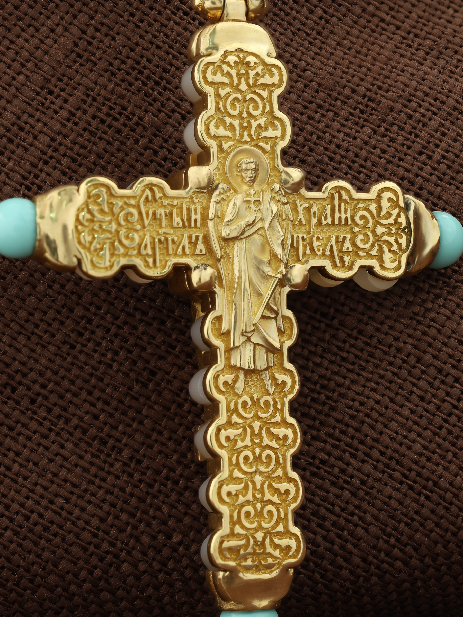 На оборотной стороне креста изображен святой Ангел-Хранитель в виде прекрасного юноши держащего в правой руке крест, а в левой — сферу. Ангел-Хранитель — это Ангел приставляемый Богом к человеку при крещении для охраны и помощи в добрых делах. Невидимо пребывая при нас постоянно, он, руководствуя нас ко спасению, не только по нашему желанию таинственно наставляет нас на все доброе и полезное, не только возносит наши молитвы к Богу, но еще и сам от себя охраняют и защищают нас от врагов видимых и невидимых, ходатайствует за нас пред Богом.