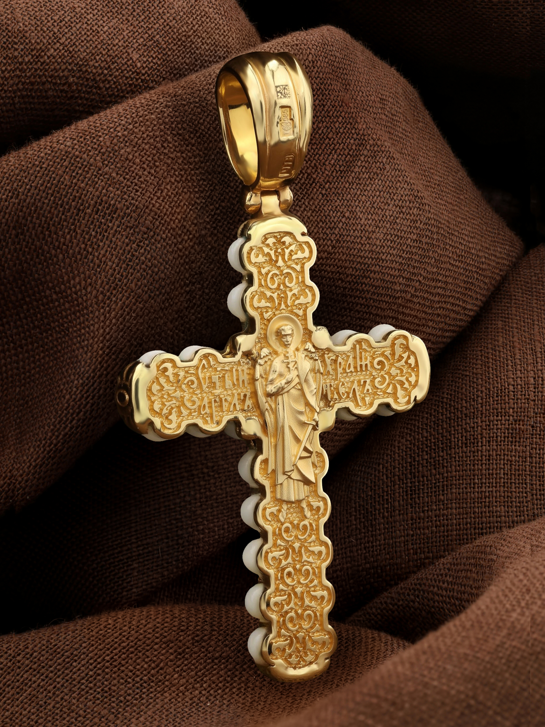 На оборотной стороне креста изображен святой Ангел-Хранитель в виде прекрасного юноши держащего в правой руке крест, а в левой — сферу. Ангел-Хранитель — это Ангел приставляемый Богом к человеку при крещении для охраны и помощи в добрых делах. Невидимо пребывая при нас постоянно, он, руководствуя нас ко спасению, не только по нашему желанию таинственно наставляет нас на все доброе и полезное, не только возносит наши молитвы к Богу, но еще и сам от себя охраняют и защищают нас от врагов видимых и невидимых, ходатайствует за нас пред Богом.