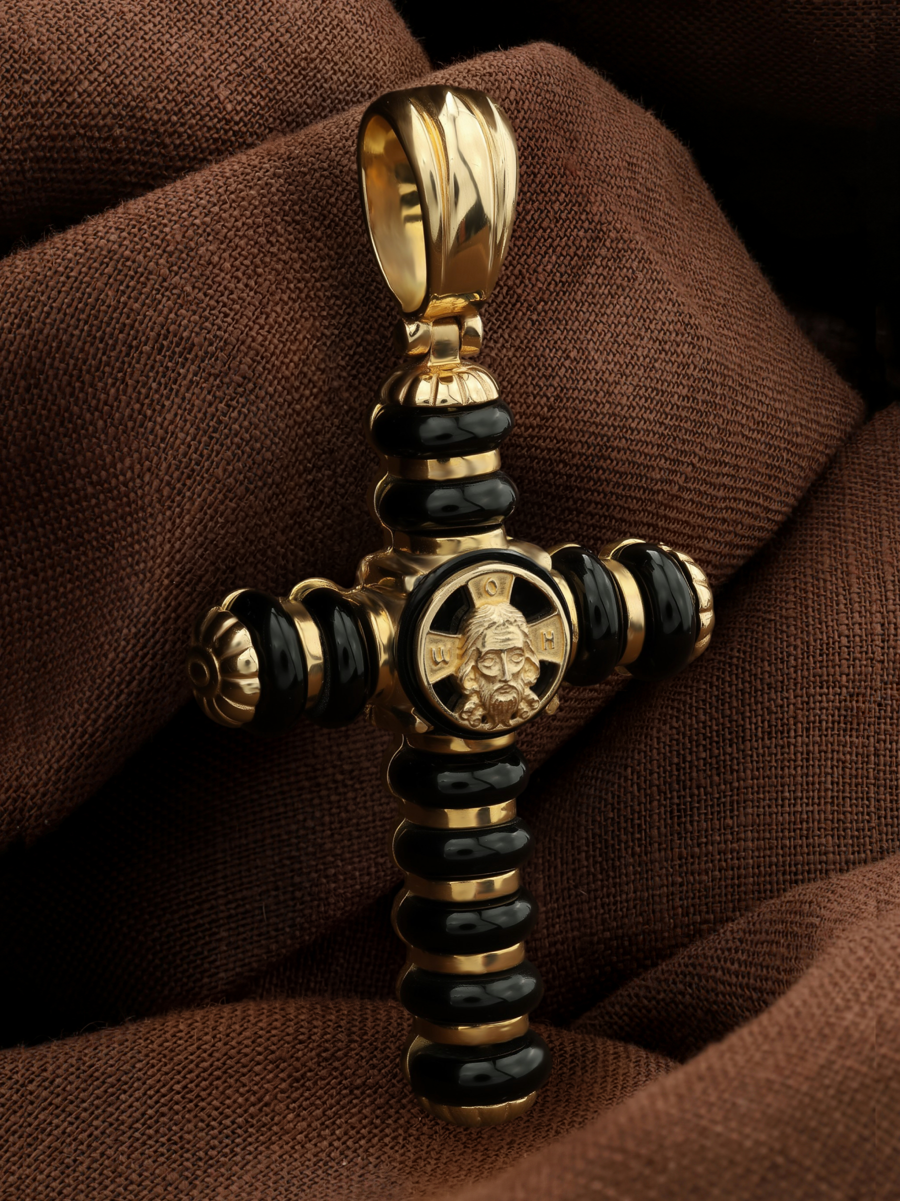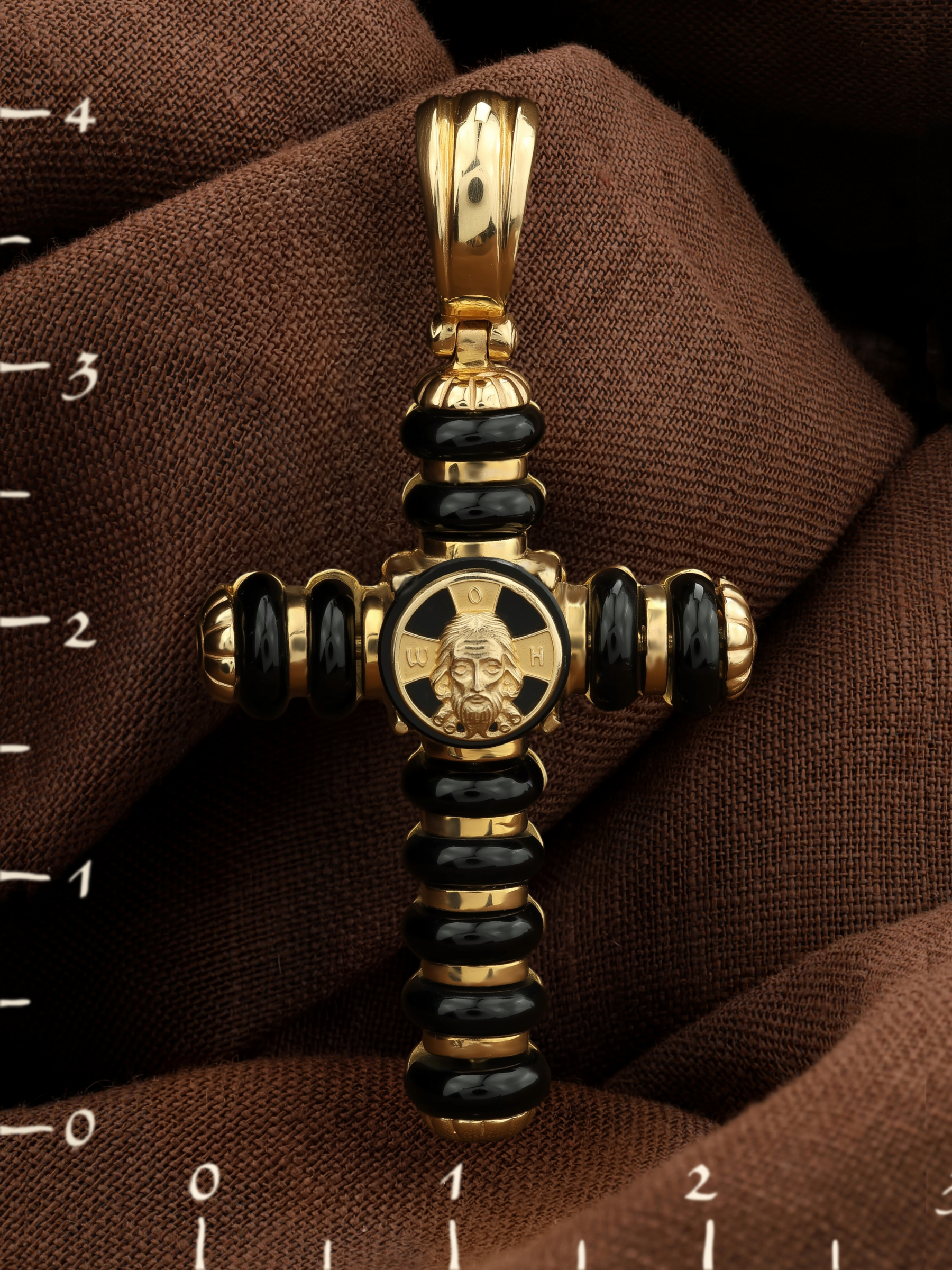 В центральной части лицевой стороны креста изображен Спас Нерукотворный — образ Господа и Спасителя нашего Иисуса Христа, чудесно отпечатавшийся на плате, котором Христос вытер свой лик. Согласно Преданию, изложенному в Четьи Минее, Авгарь V Ухама, больной проказой, послал ко Христу своего архивария Ханнана (Ананию) с письмо, в котором просил Христа прийти в Едессу и исцелить его. Ханнан же был художником, и Авгарь поручил ему, если Спаситель не сможет прийти, то написать хотя бы Его образ и принести ему. Видя, что Ханнан хочет сделать Его портрет, Христос потребовал воды, умылся, вытер Свой лик платом, и на этом плате отпечатался Его образ. Спаситель передал этот плат Ханнану с повелением отнести с ответным письмом пославшему его. Получив портрет, Авгарь исцелился от главного своего недуга, но лицо его оставалось еще поврежденным. После Пятидесятницы в Едессу пошёл святой апостол Фаддей, один из 70-ти, закончил исцеление Авгаря и обратил его в христианство. Авгарь прикрепил образ к доске и поместил в нише над городскими воротами, убрав оттуда находившегося там идола.