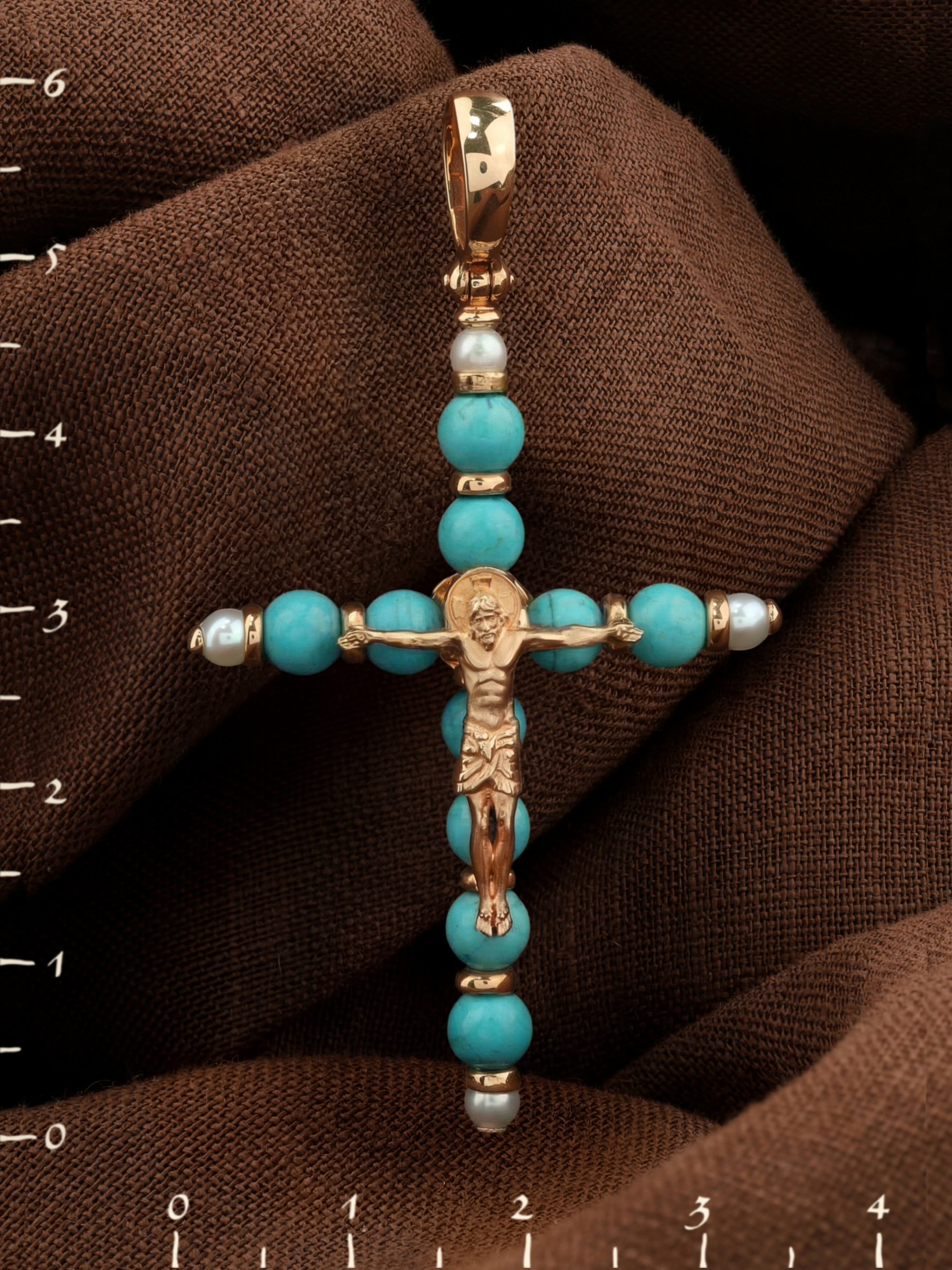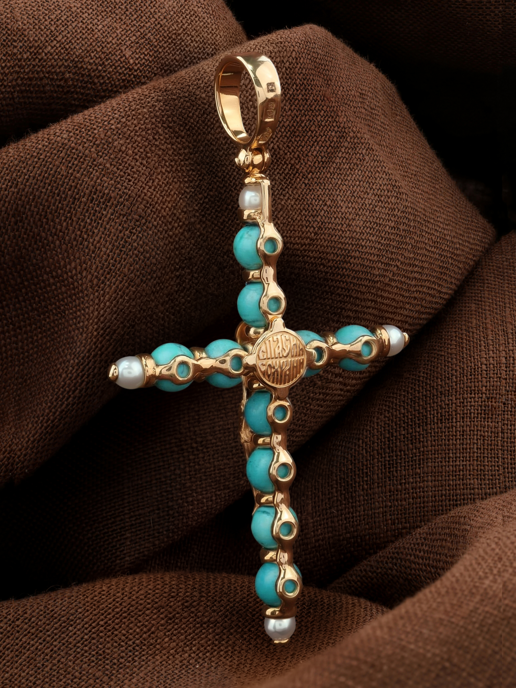 Крест из золота c жемчугом и бирюзой