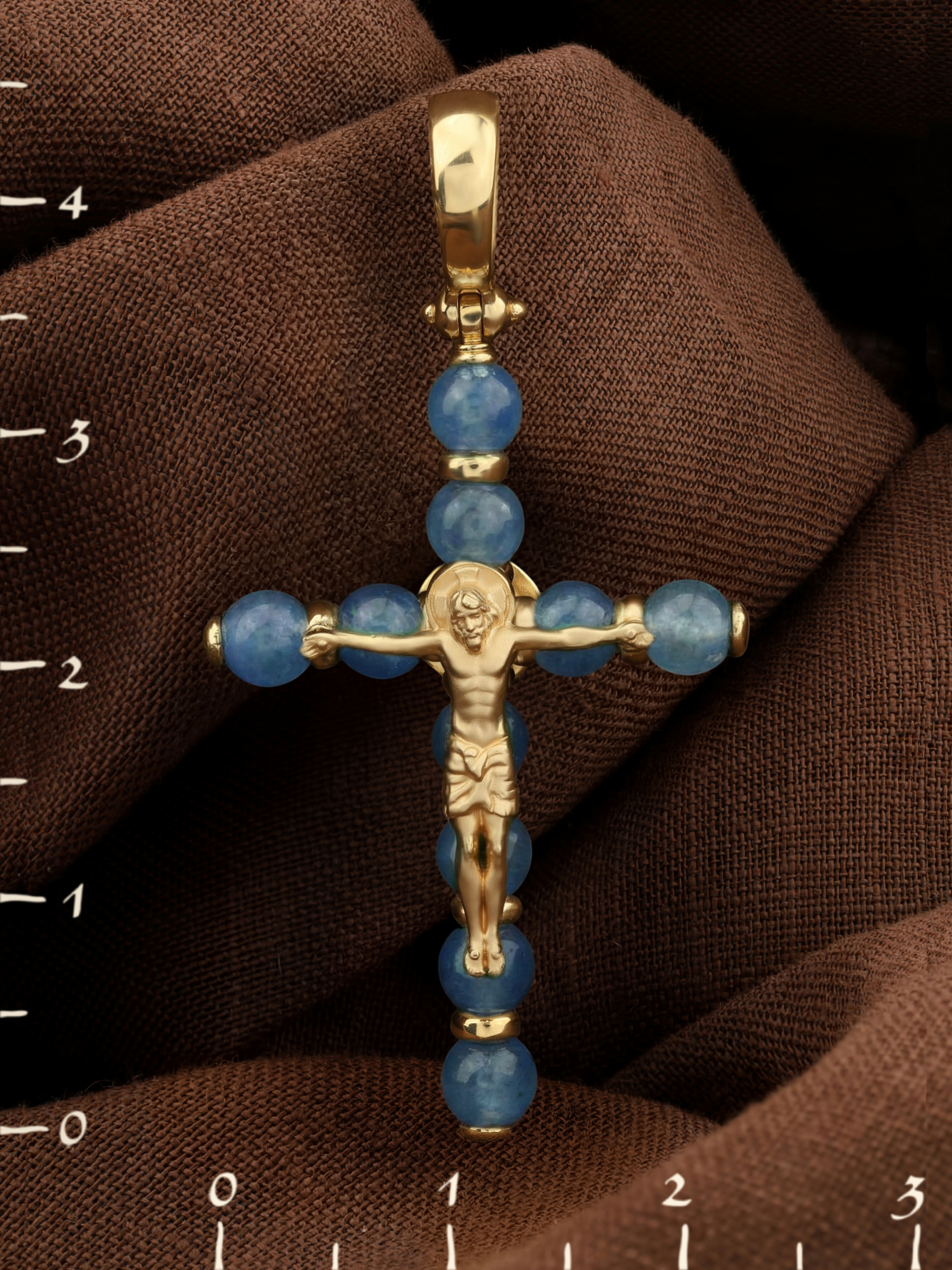 На лицевой стороне креста изображено Распятие Господа и Спасителя нашего Иисуса Христа. Своими крестными страданиями Господь смыл наши грехи, покрыл наш долг перед Богом или, на языке Писания, нас «искупил». В Голгофе сокрыта непостижимая тайна бесконечной правды и любви Бога. Крест стал символом победы добра над злом, жизни над смертью, напоминанием бесконечной Божьей любви, предметом радости. Воплотившийся Сын Божий Своею кровью освятил крест и сделал его проводником Своей благодати, источником освящения верующих. На верхней табличке, выше головы Иисуса, расположена надпись, составленная Понтием Пилатом — «IНЦI». Она означает «Иисус Назорей, Царь Иудейский». Надпись «IC» «ХC», означает Иисус Христос, помещаются на разных сторонах поперечной перекладины креста. Христос в Своей Божественной любви, над которой смерть не властна и которая, страдая, и не страдает в обычном смысле, простирает к людям со Креста Свои объятия, в которые призывается и привлекается весь мир. Поэтому Тело Его не висит, а торжественно покоится на Кресте.