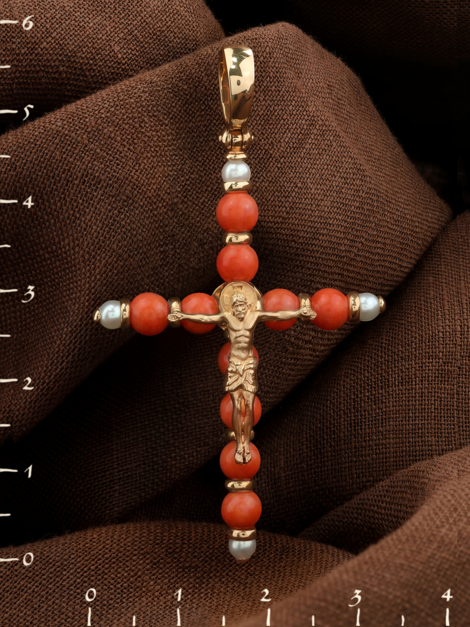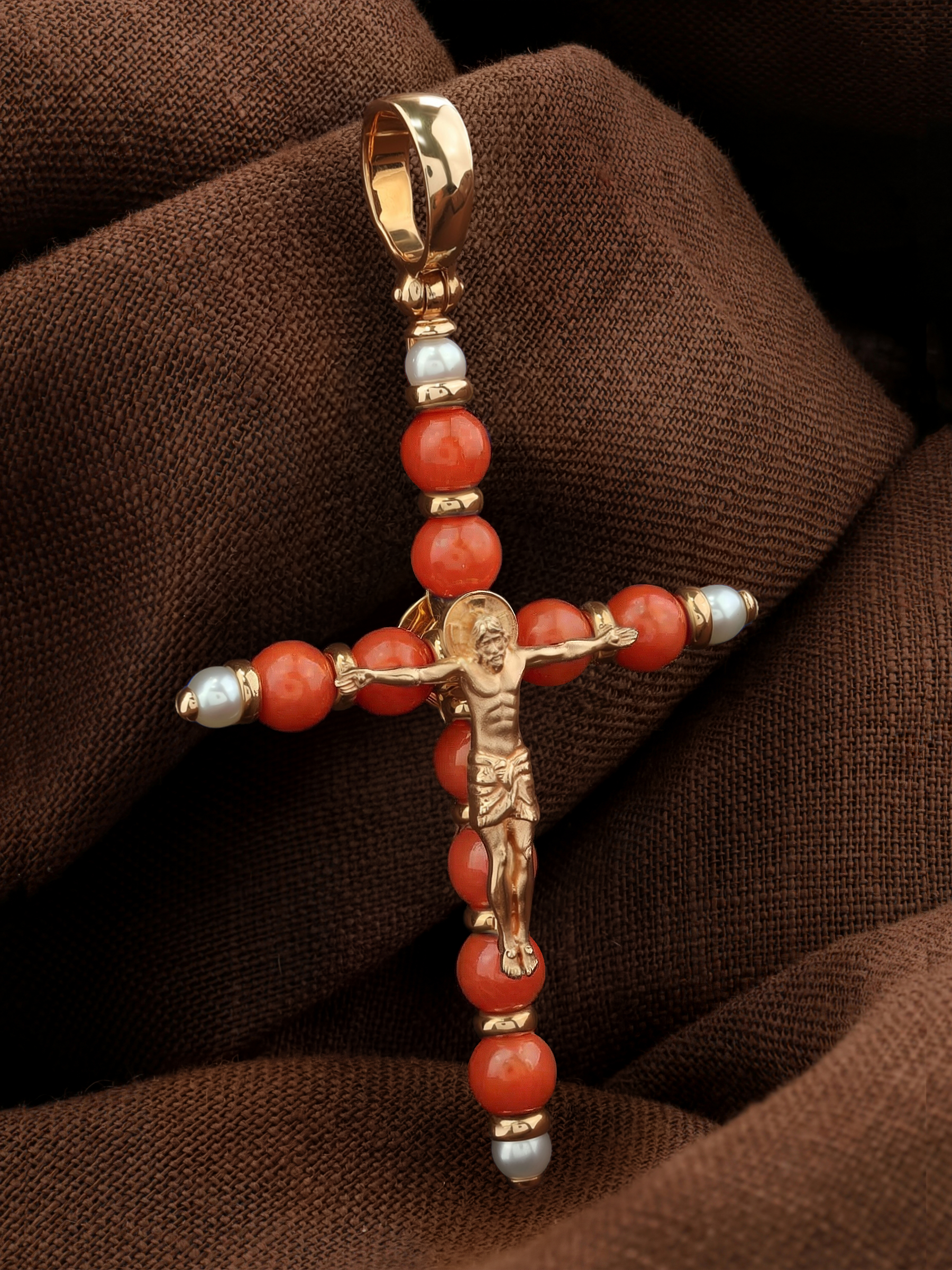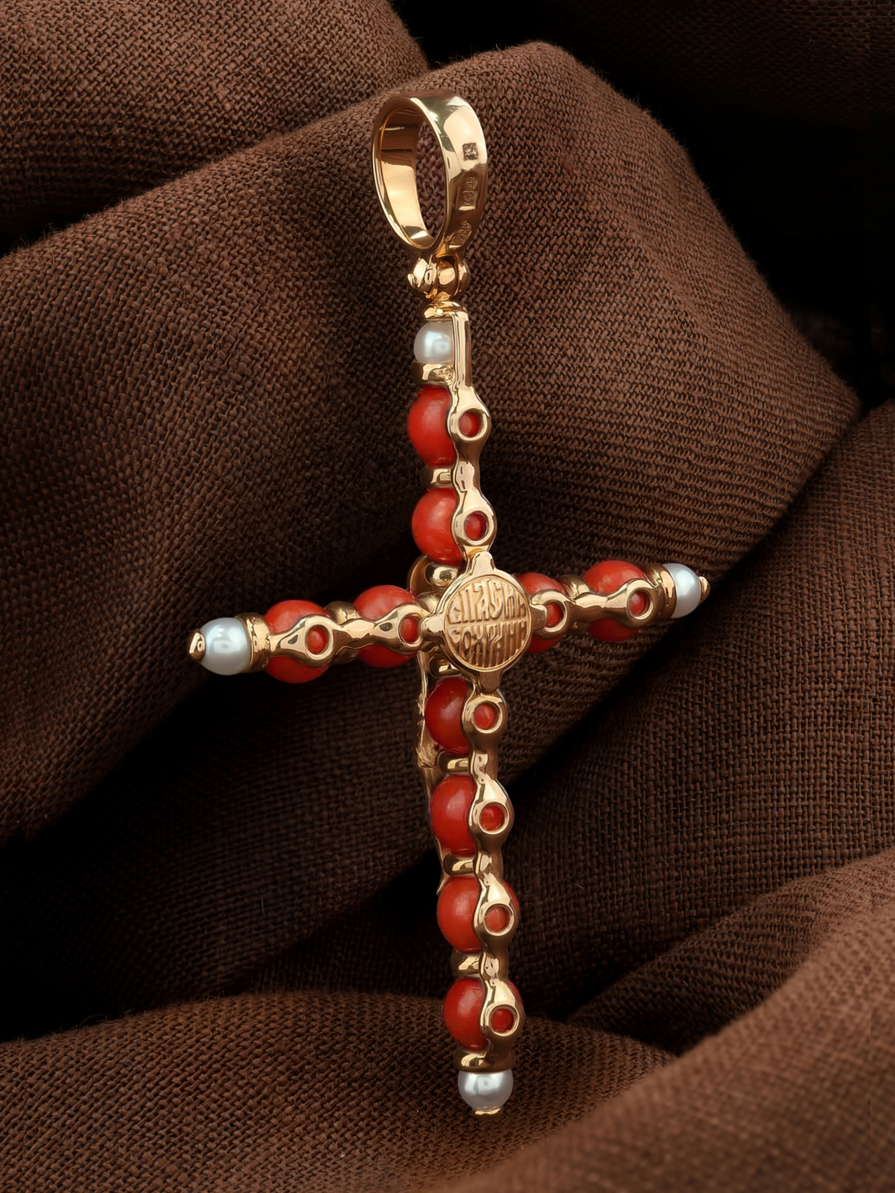 Крест из золота c жемчугом и кораллом