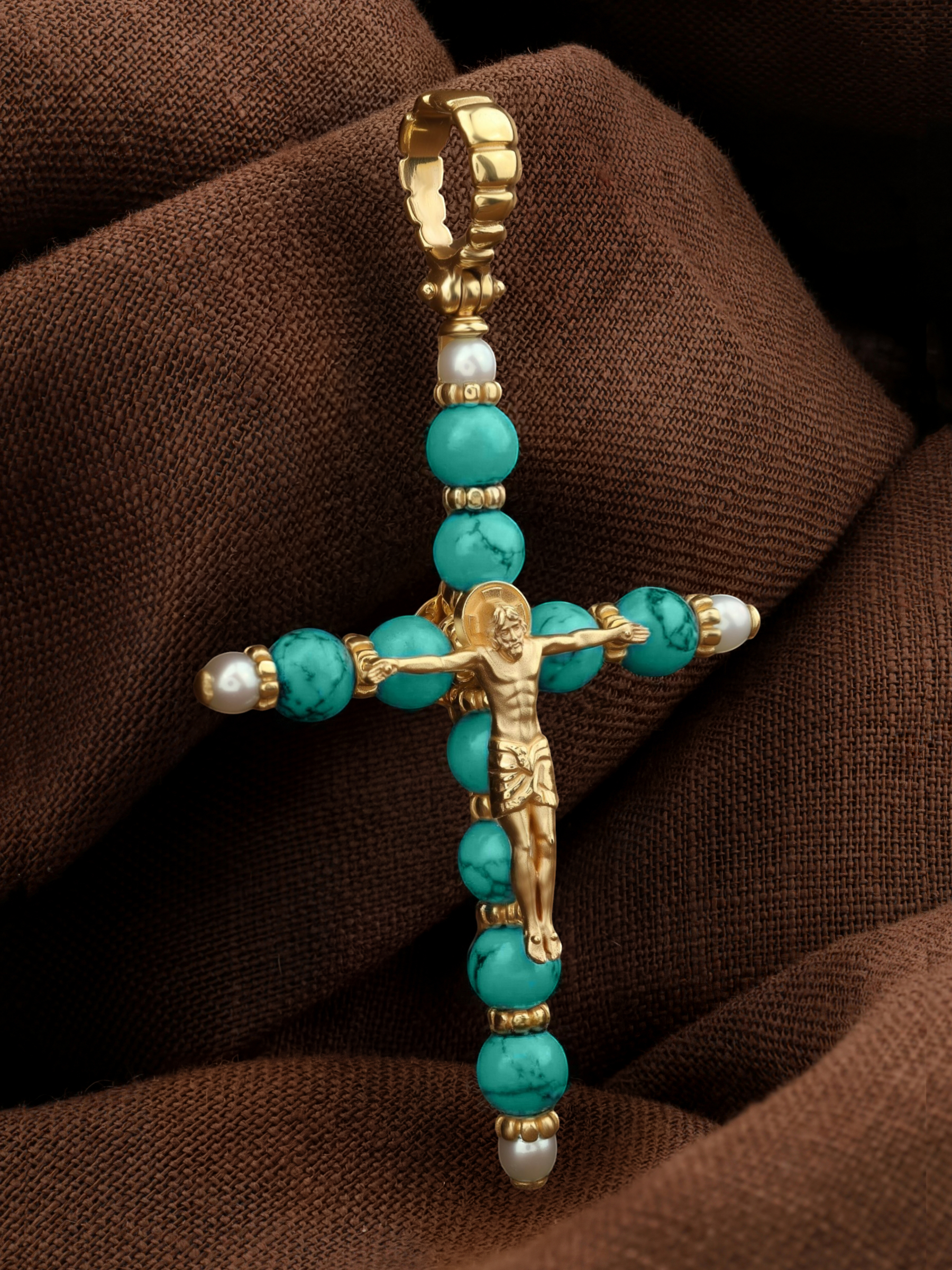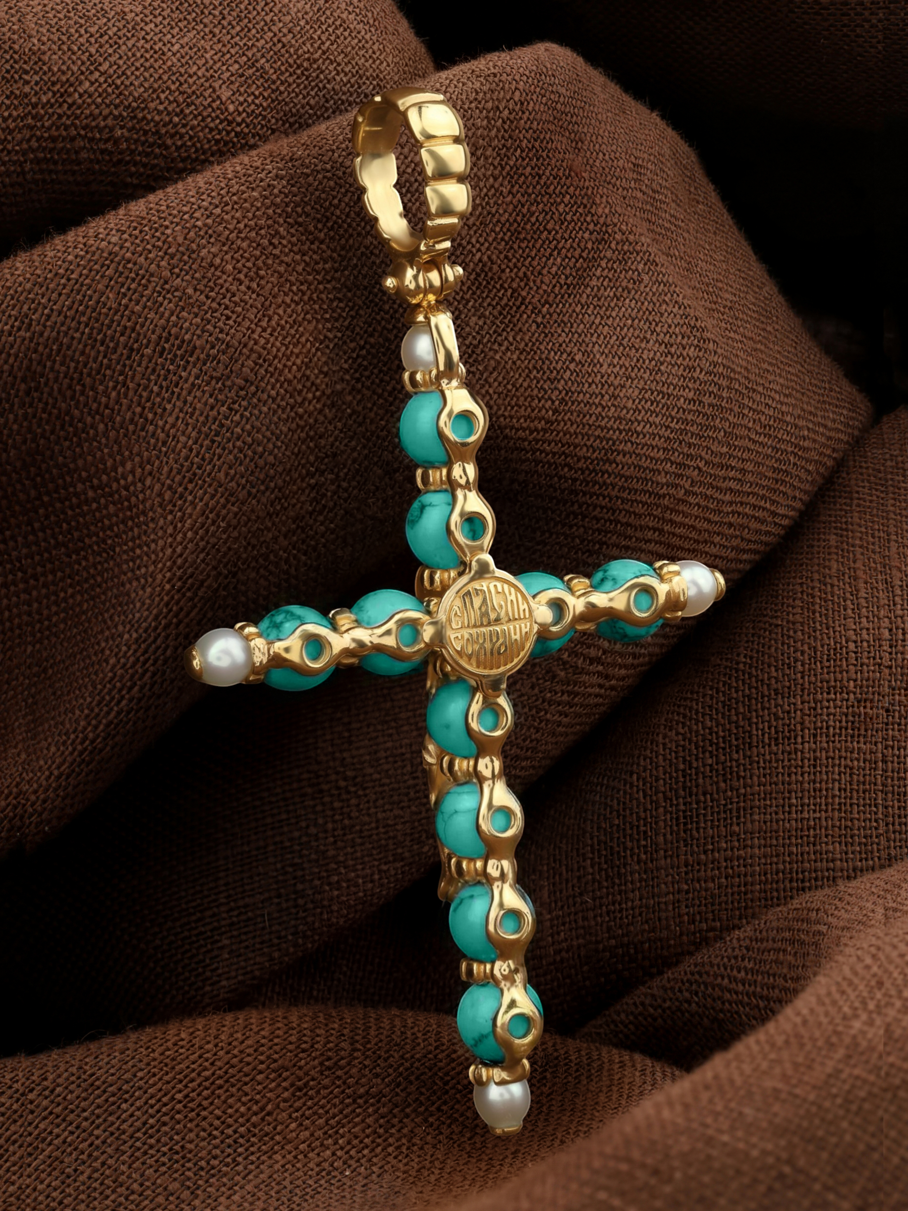 Крест из лимонного золота c жемчугом и бирюзой