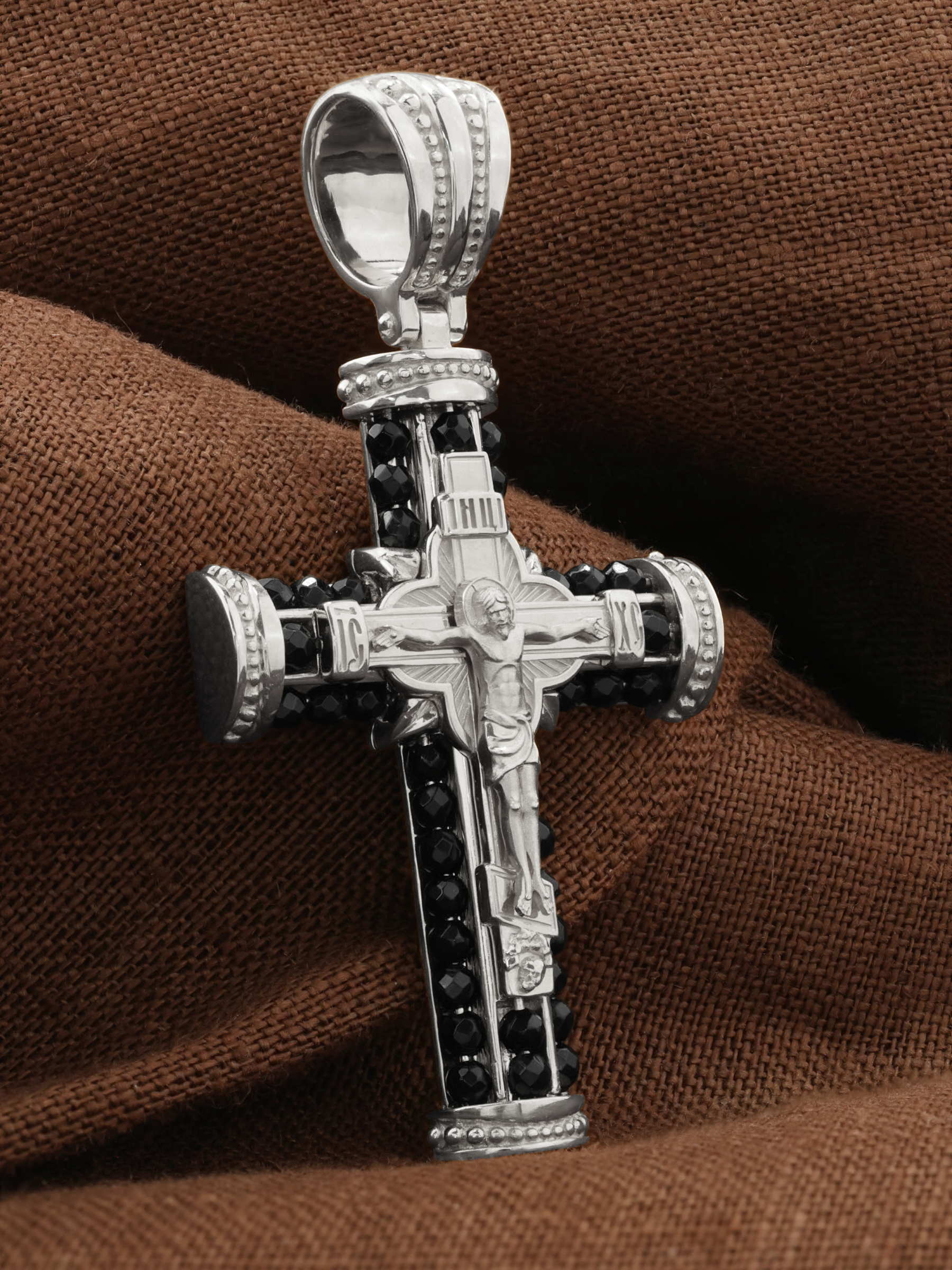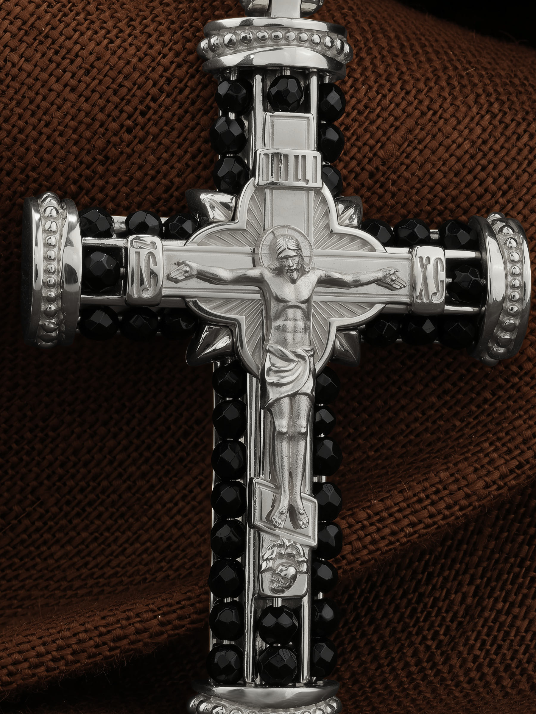На лицевой стороне креста изображено Распятие Господа и Спасителя нашего Иисуса Христа. Своими крестными страданиями Господь смыл наши грехи, покрыл наш долг перед Богом или, на языке Писания, нас «искупил». В Голгофе сокрыта непостижимая тайна бесконечной правды и любви Бога. Крест стал символом победы добра над злом, жизни над смертью, напоминанием бесконечной Божьей любви, предметом радости. Воплотившийся Сын Божий Своею кровью освятил крест и сделал его проводником Своей благодати, источником освящения верующих. На верхней табличке, выше головы Иисуса, расположена надпись, составленная Понтием Пилатом — «IНЦI». Она означает «Иисус Назорей, Царь Иудейский». Надпись «IC» «ХC», означает Иисус Христос, помещаются на разных сторонах поперечной перекладины креста. Христос в Своей Божественной любви, над которой смерть не властна и которая, страдая, и не страдает в обычном смысле, простирает к людям со Креста Свои объятия, в которые призывается и привлекается весь мир. Поэтому Тело Его не висит, а торжественно покоится на Кресте.