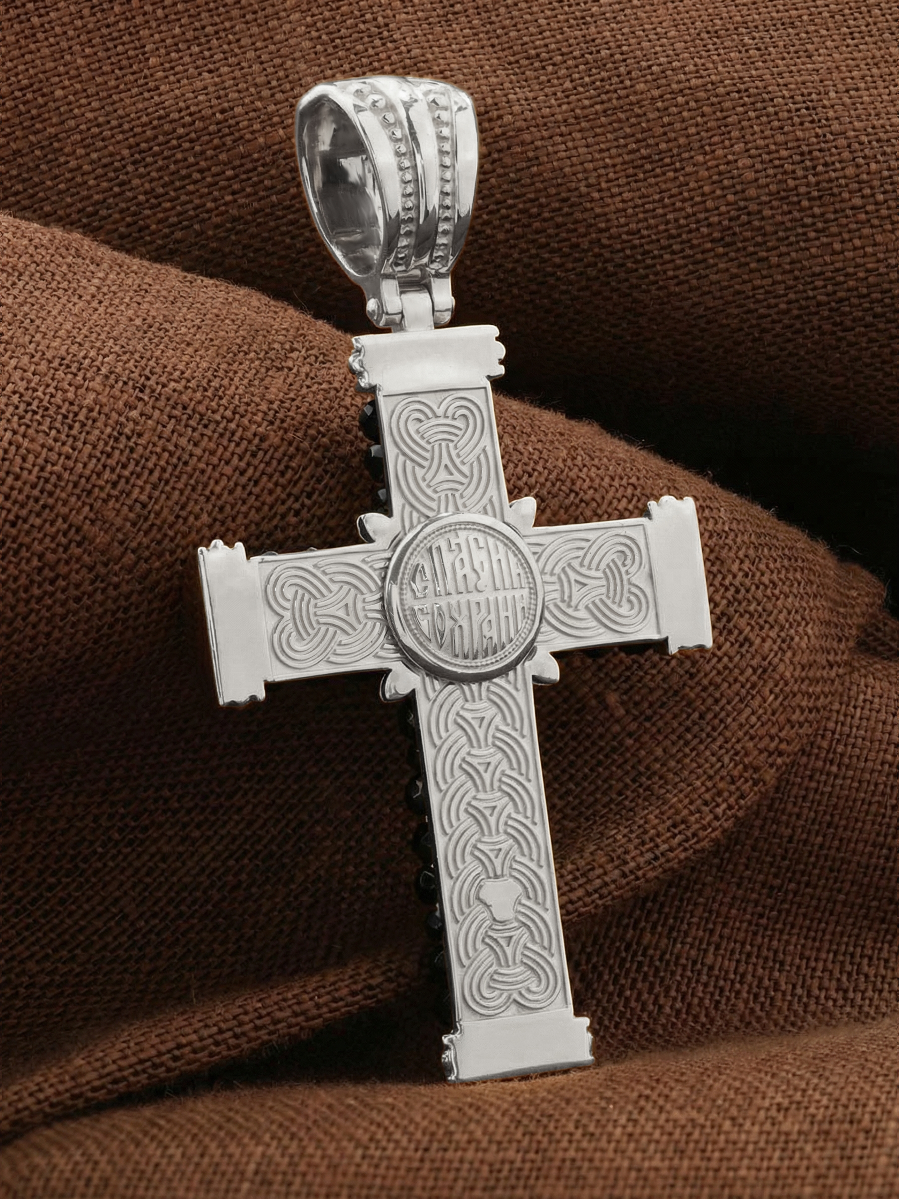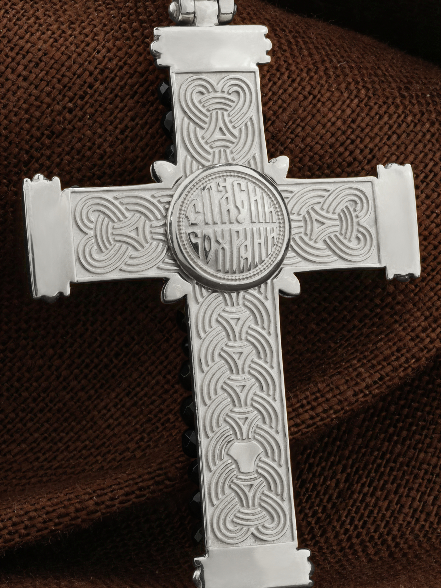 В центрально части оборотной стороны креста написана молитва: «Спаси и сохрани».