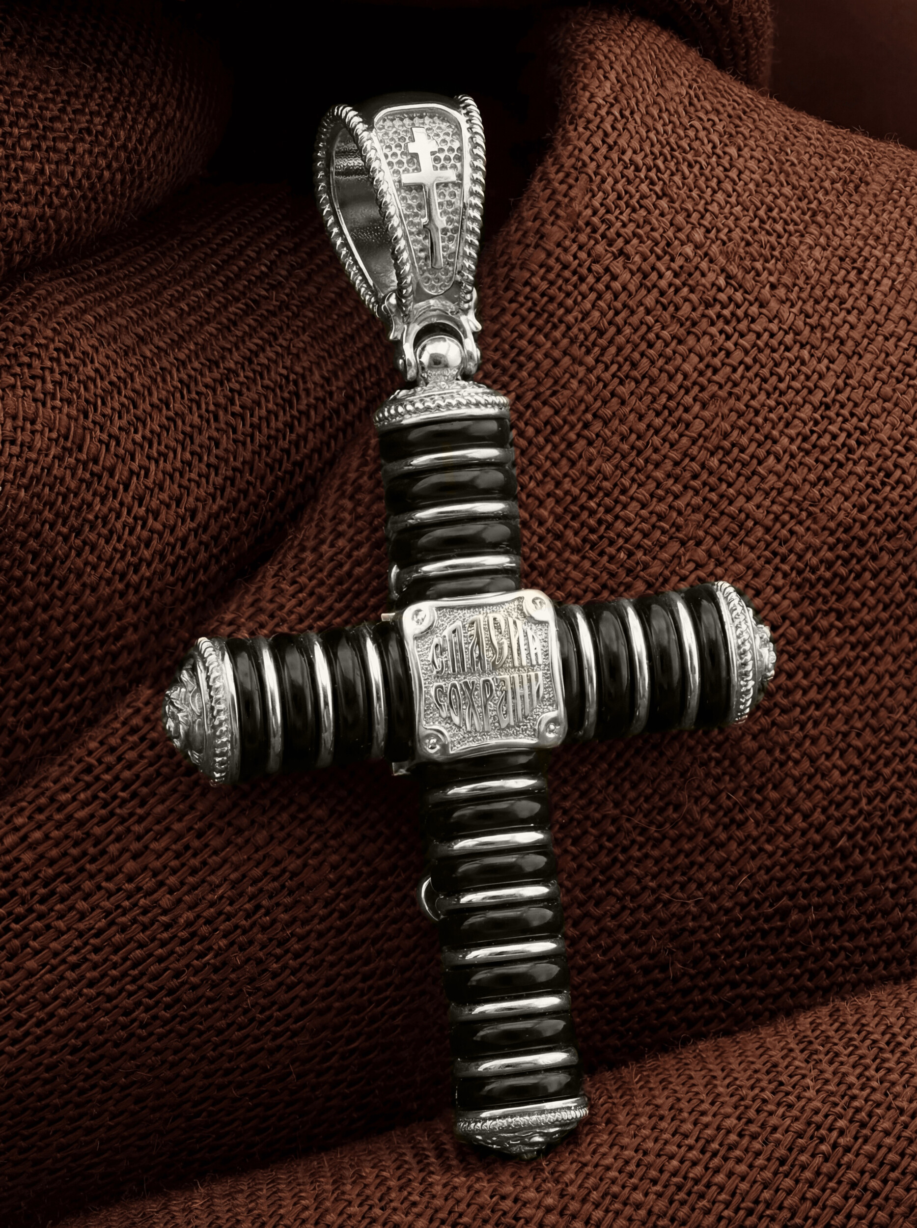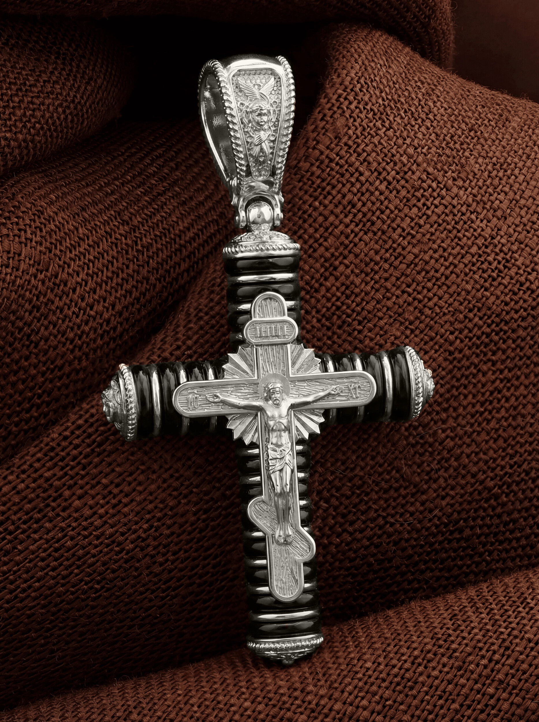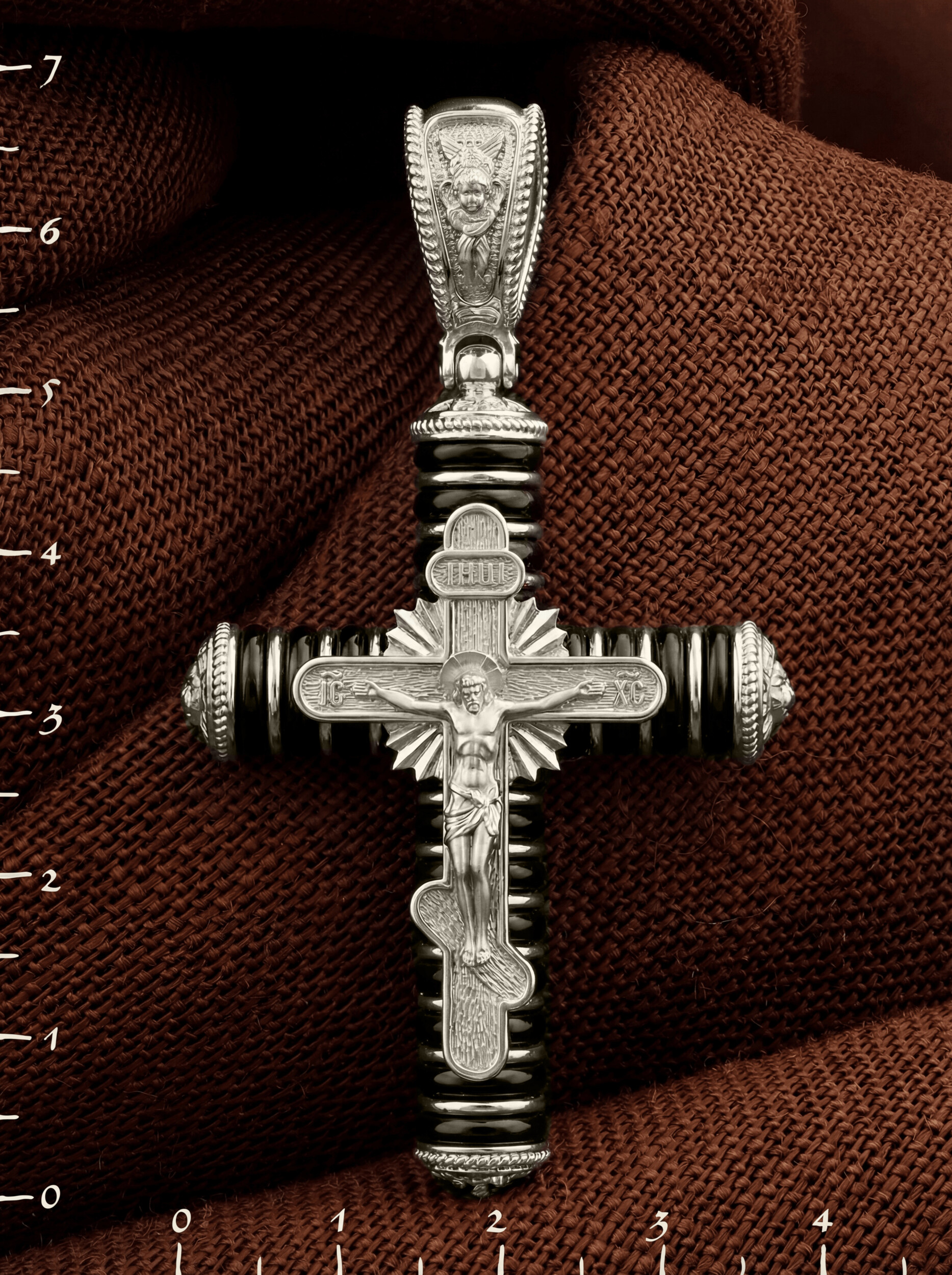 На лицевой стороне креста изображено Распятие Господа и Спасителя нашего Иисуса Христа. Своими крестными страданиями Господь смыл наши грехи, покрыл наш долг перед Богом или, на языке Писания, нас «искупил». В Голгофе сокрыта непостижимая тайна бесконечной правды и любви Бога. Крест стал символом победы добра над злом, жизни над смертью, напоминанием бесконечной Божьей любви, предметом радости. Воплотившийся Сын Божий Своею кровью освятил крест и сделал его проводником Своей благодати, источником освящения верующих. На верхней табличке, выше головы Иисуса, расположена надпись, составленная Понтием Пилатом — «IНЦI». Она означает «Иисус Назорей, Царь Иудейский». Надпись «IC» «ХC», означает Иисус Христос, помещаются на разных сторонах поперечной перекладины креста. Христос в Своей Божественной любви, над которой смерть не властна и которая, страдая, и не страдает в обычном смысле, простирает к людям со Креста Свои объятия, в которые призывается и привлекается весь мир. Поэтому Тело Его не висит, а торжественно покоится на Кресте. На кулонном кольце изображен шестикрылый Серафим. Серафим означает «Пламенный». Горя любовью к Богу, он зажигает огонь этой любви и в сердцах людей.