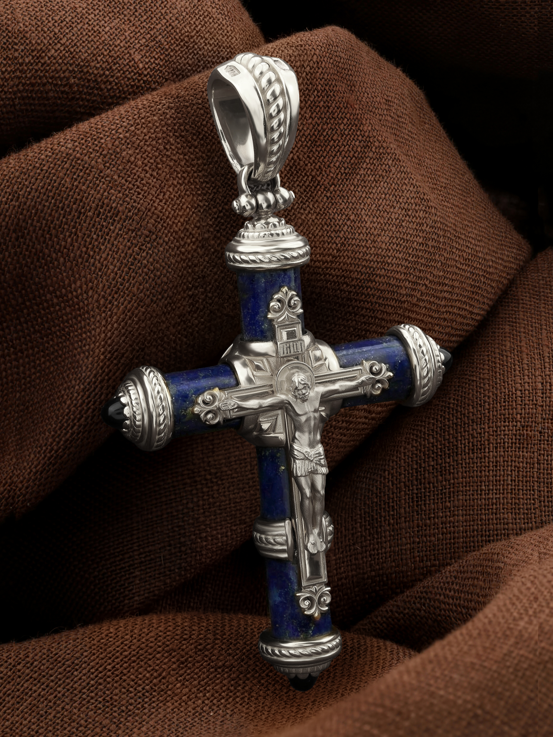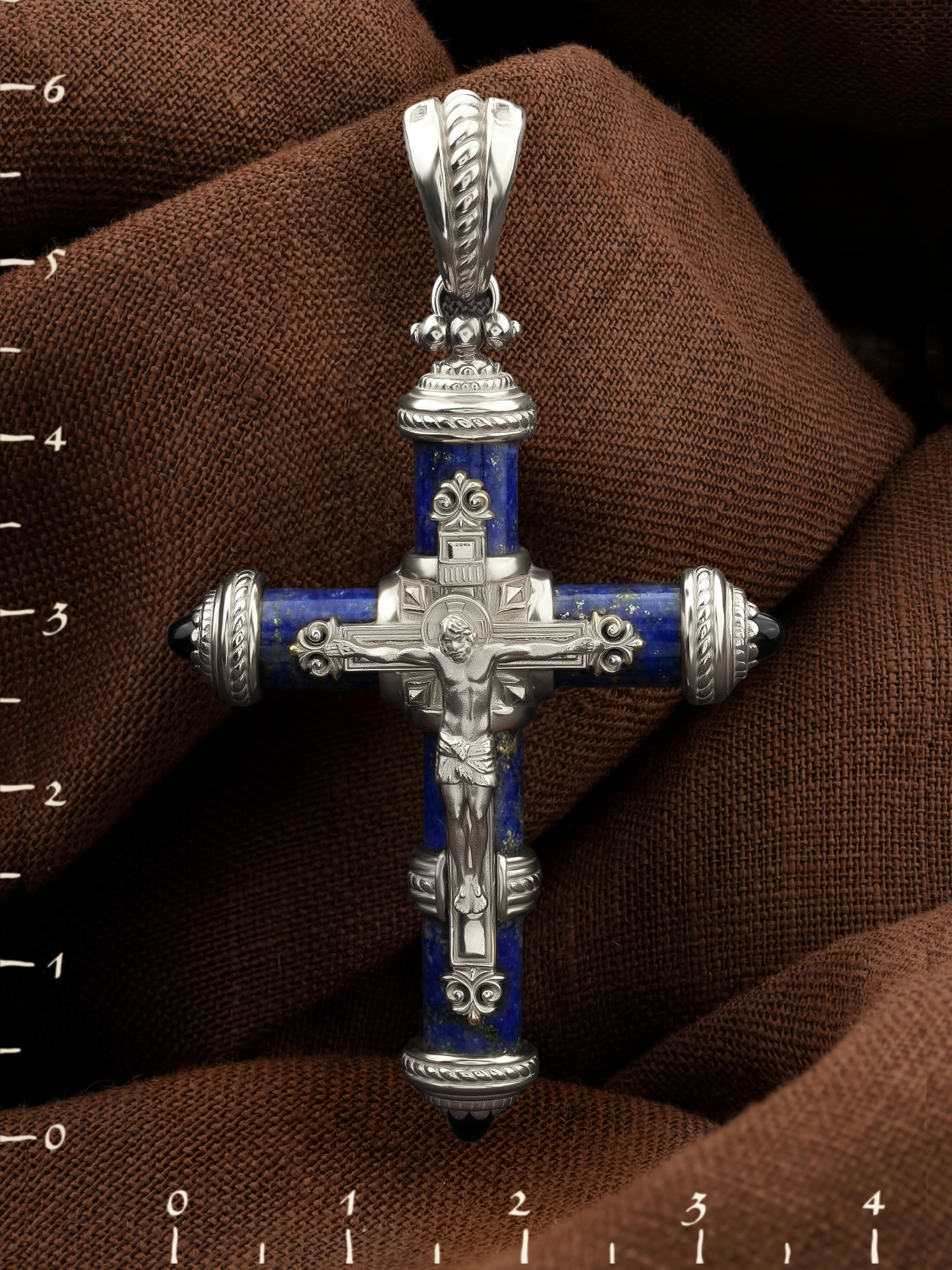 На лицевой стороне креста изображено Распятие Господа и Спасителя нашего Иисуса Христа. Своими крестными страданиями Господь смыл наши грехи, покрыл наш долг перед Богом или, на языке Писания, нас «искупил». В Голгофе сокрыта непостижимая тайна бесконечной правды и любви Бога. Крест стал символом победы добра над злом, жизни над смертью, напоминанием бесконечной Божьей любви, предметом радости. Воплотившийся Сын Божий Своею кровью освятил крест и сделал его проводником Своей благодати, источником освящения верующих. На верхней табличке, выше головы Иисуса, расположена надпись, составленная Понтием Пилатом — «IНЦI». Она означает «Иисус Назорей, Царь Иудейский». Надпись «IC» «ХC», означает Иисус Христос, помещаются на разных сторонах поперечной перекладины креста. Христос в Своей Божественной любви, над которой смерть не властна и которая, страдая, и не страдает в обычном смысле, простирает к людям со Креста Свои объятия, в которые призывается и привлекается весь мир. Поэтому Тело Его не висит, а торжественно покоится на Кресте.