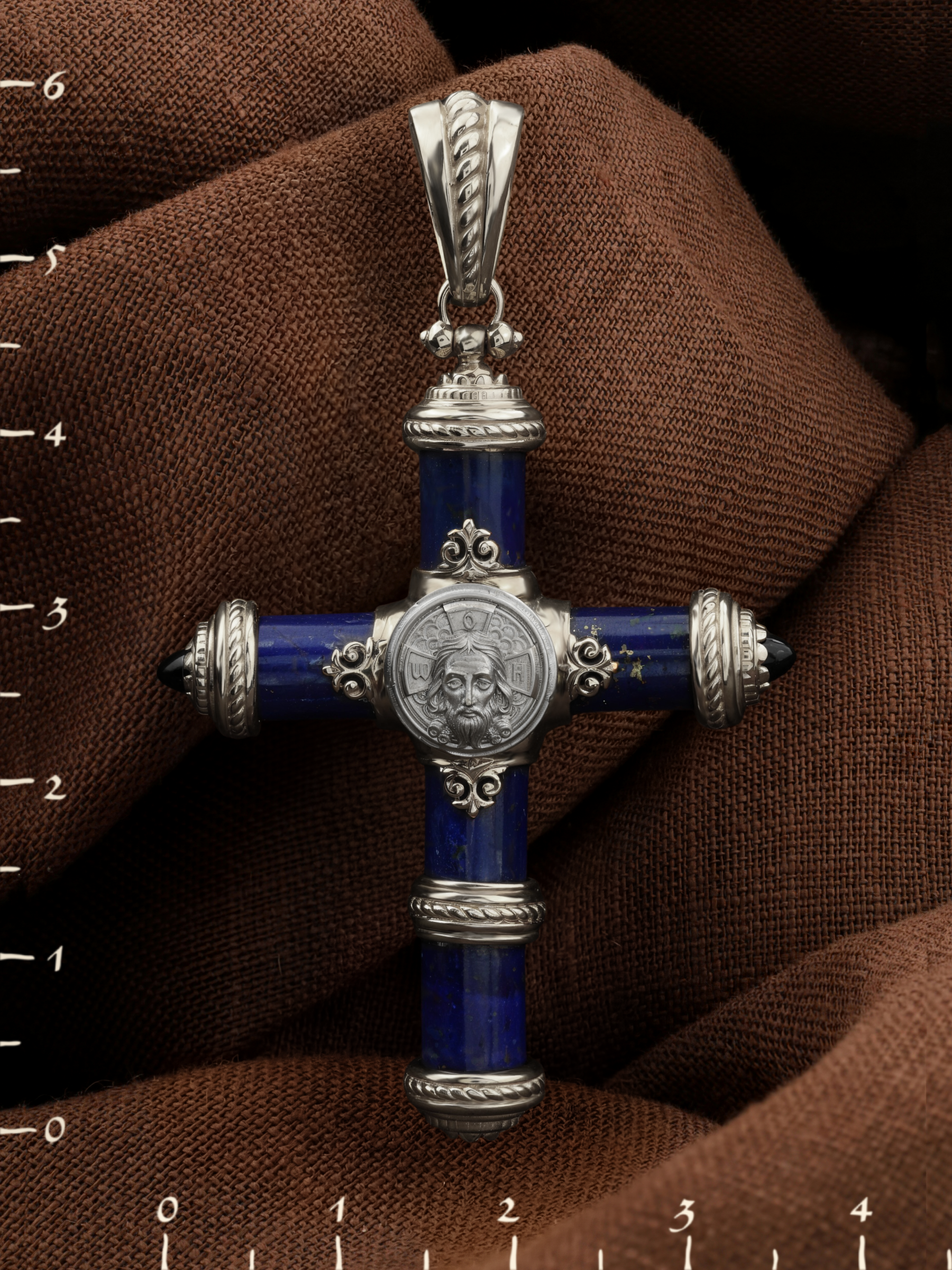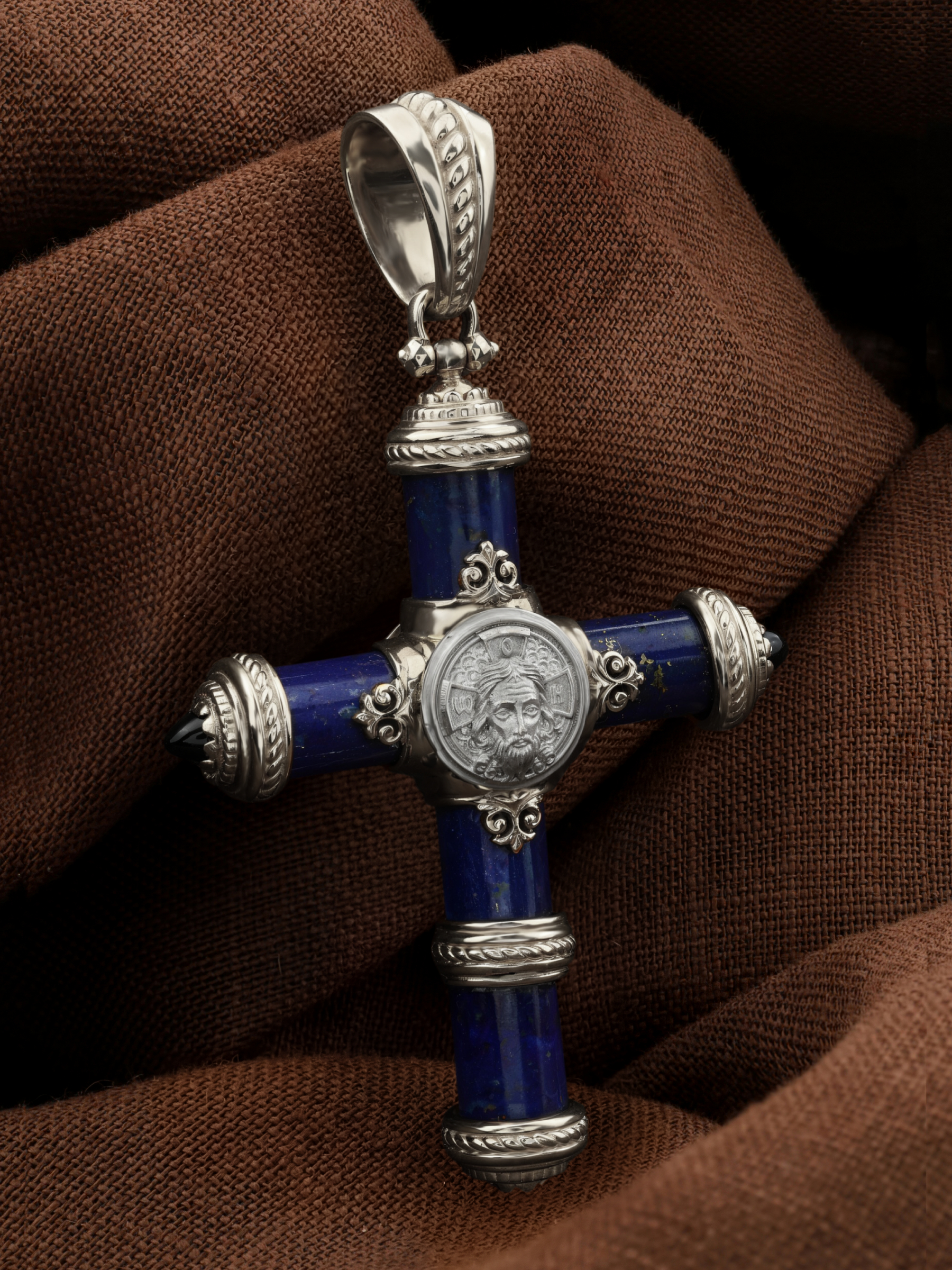 Крест из белого золота c ониксом и лазуритом