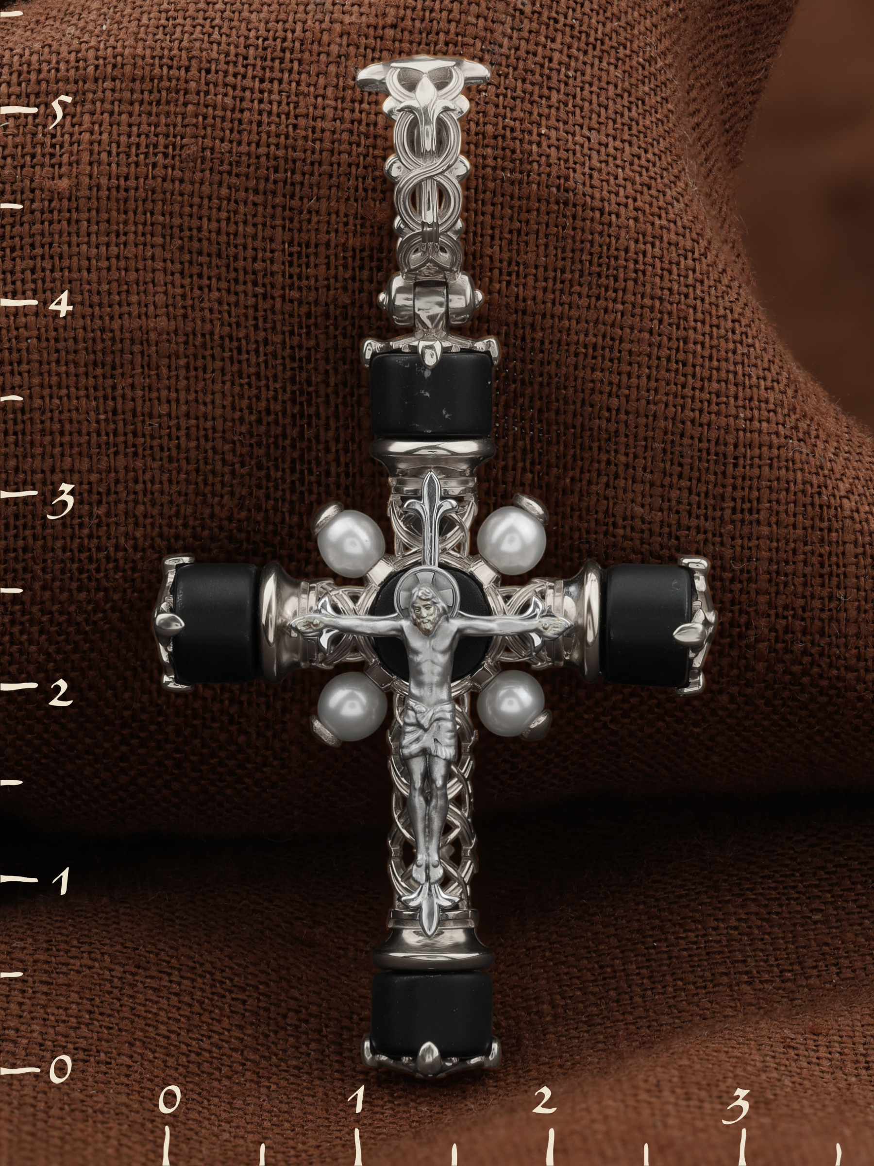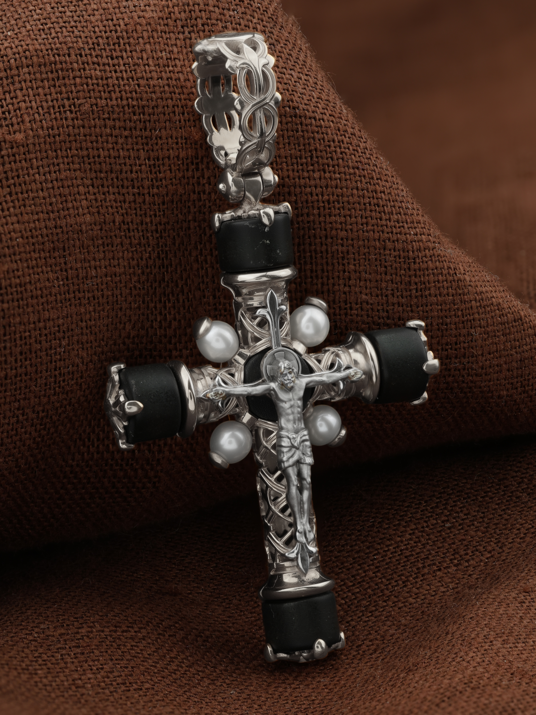 На лицевой стороне креста изображено Распятие Господа и Спасителя нашего Иисуса Христа. Своими крестными страданиями Господь смыл наши грехи, покрыл наш долг перед Богом или, на языке Писания, нас «искупил». В Голгофе сокрыта непостижимая тайна бесконечной правды и любви Бога. Крест стал символом победы добра над злом, жизни над смертью, напоминанием бесконечной Божьей любви, предметом радости. Воплотившийся Сын Божий Своею кровью освятил крест и сделал его проводником Своей благодати, источником освящения верующих. Господь сказал: кто хочет идти за Мною, отвергнись себя, и возьми крест свой, и следуй за Мною. (Мк. 8: 34). На православном кресте Христос не умирает, а свободно простирает руки, ладони Иисуса открыты, будто он хочет обнять все человечество, даря им свою любовь и открывая путь к вечной жизни.