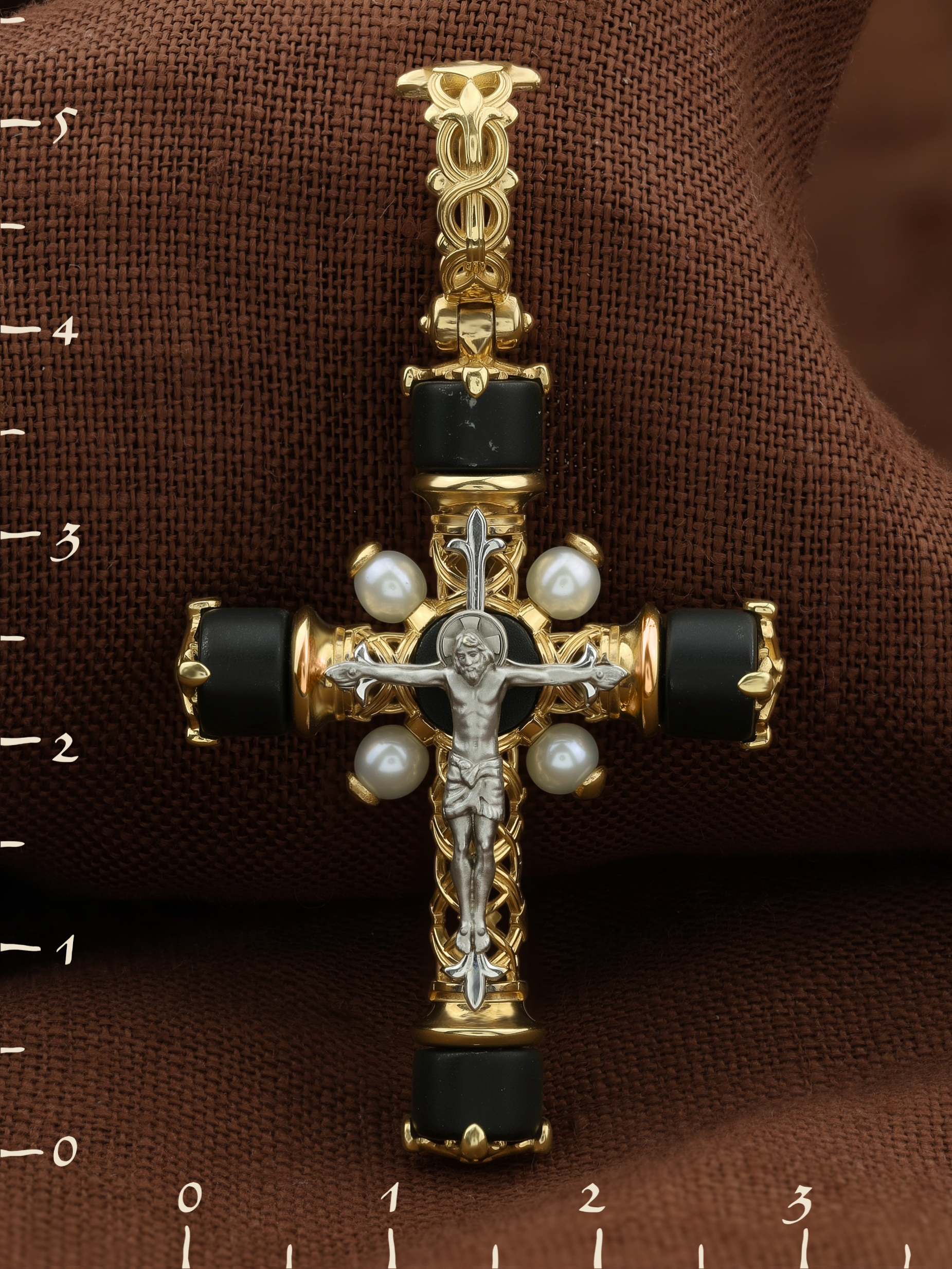 На лицевой стороне креста изображено Распятие Господа и Спасителя нашего Иисуса Христа. Своими крестными страданиями Господь смыл наши грехи, покрыл наш долг перед Богом или, на языке Писания, нас «искупил». В Голгофе сокрыта непостижимая тайна бесконечной правды и любви Бога. Крест стал символом победы добра над злом, жизни над смертью, напоминанием бесконечной Божьей любви, предметом радости. Воплотившийся Сын Божий Своею кровью освятил крест и сделал его проводником Своей благодати, источником освящения верующих. Господь сказал: кто хочет идти за Мною, отвергнись себя, и возьми крест свой, и следуй за Мною. (Мк. 8: 34). На православном кресте Христос не умирает, а свободно простирает руки, ладони Иисуса открыты, будто он хочет обнять все человечество, даря им свою любовь и открывая путь к вечной жизни.
