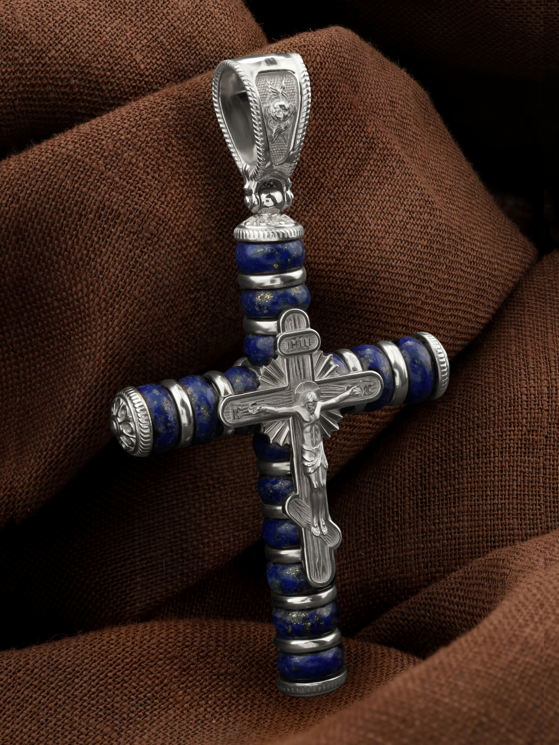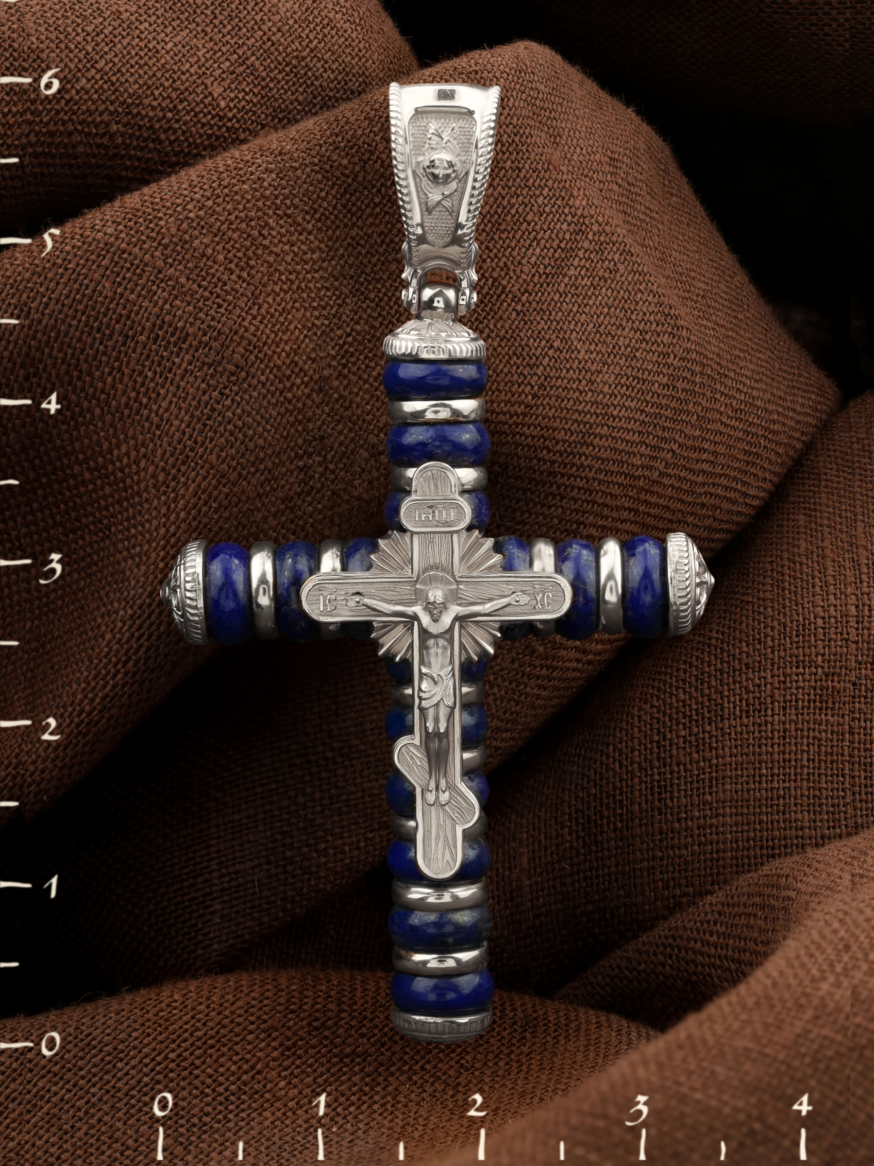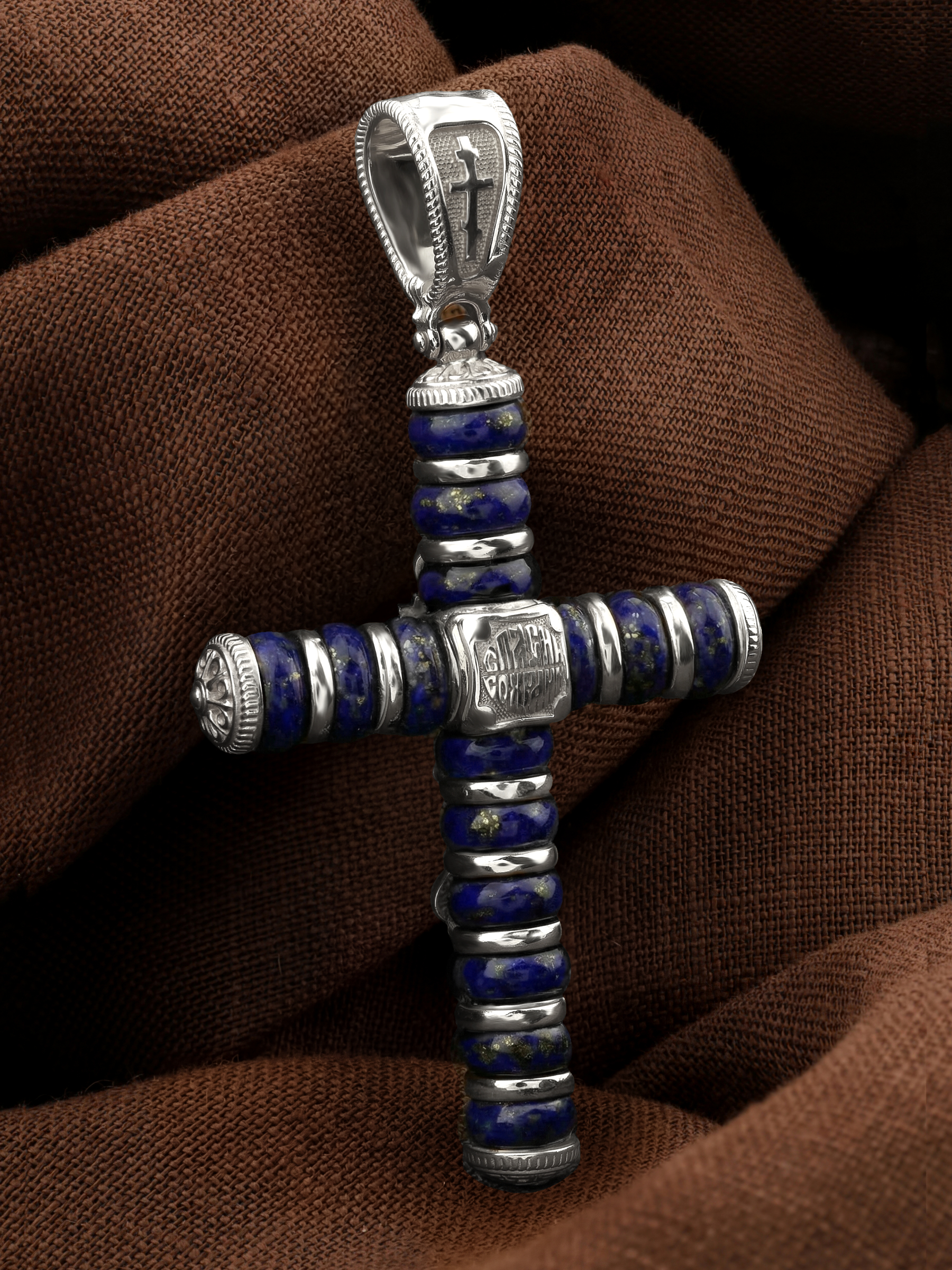 На лицевой стороне креста изображено Распятие Господа и Спасителя нашего Иисуса Христа. Своими крестными страданиями Господь смыл наши грехи, покрыл наш долг перед Богом или, на языке Писания, нас «искупил». В Голгофе сокрыта непостижимая тайна бесконечной правды и любви Бога. Крест стал символом победы добра над злом, жизни над смертью, напоминанием бесконечной Божьей любви, предметом радости. Воплотившийся Сын Божий Своею кровью освятил крест и сделал его проводником Своей благодати, источником освящения верующих. Господь сказал: кто хочет идти за Мною, отвергнись себя, и возьми крест свой, и следуй за Мною. (Мк. 8: 34). На верхней табличке, выше головы Иисуса, расположена надпись, составленная Понтием Пилатом — «IНЦI». Она означает «Иисус Назорей, Царь Иудейский». Надпись «IC» «ХC», означает Иисус Христос, помещается на разных сторонах поперечной перекладины креста. На православном кресте Христос не умирает, а свободно простирает руки, ладони Иисуса открыты, будто он хочет обнять все человечество, даря им свою любовь и открывая путь к вечной жизни. На кулонном кольце изображен шестикрылый Ангел Серафим.