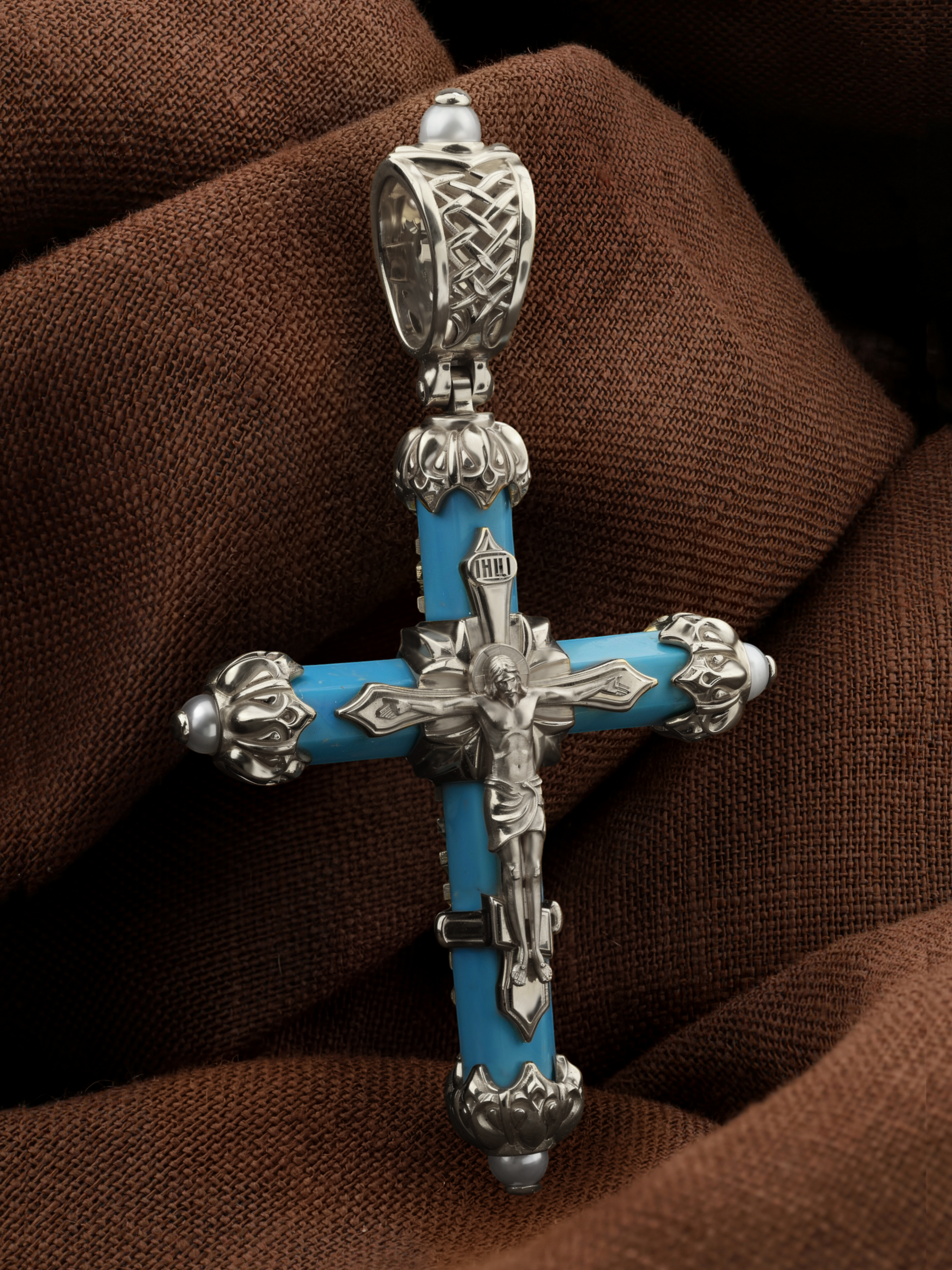 Крест из белого золота c жемчугом и бирюзой