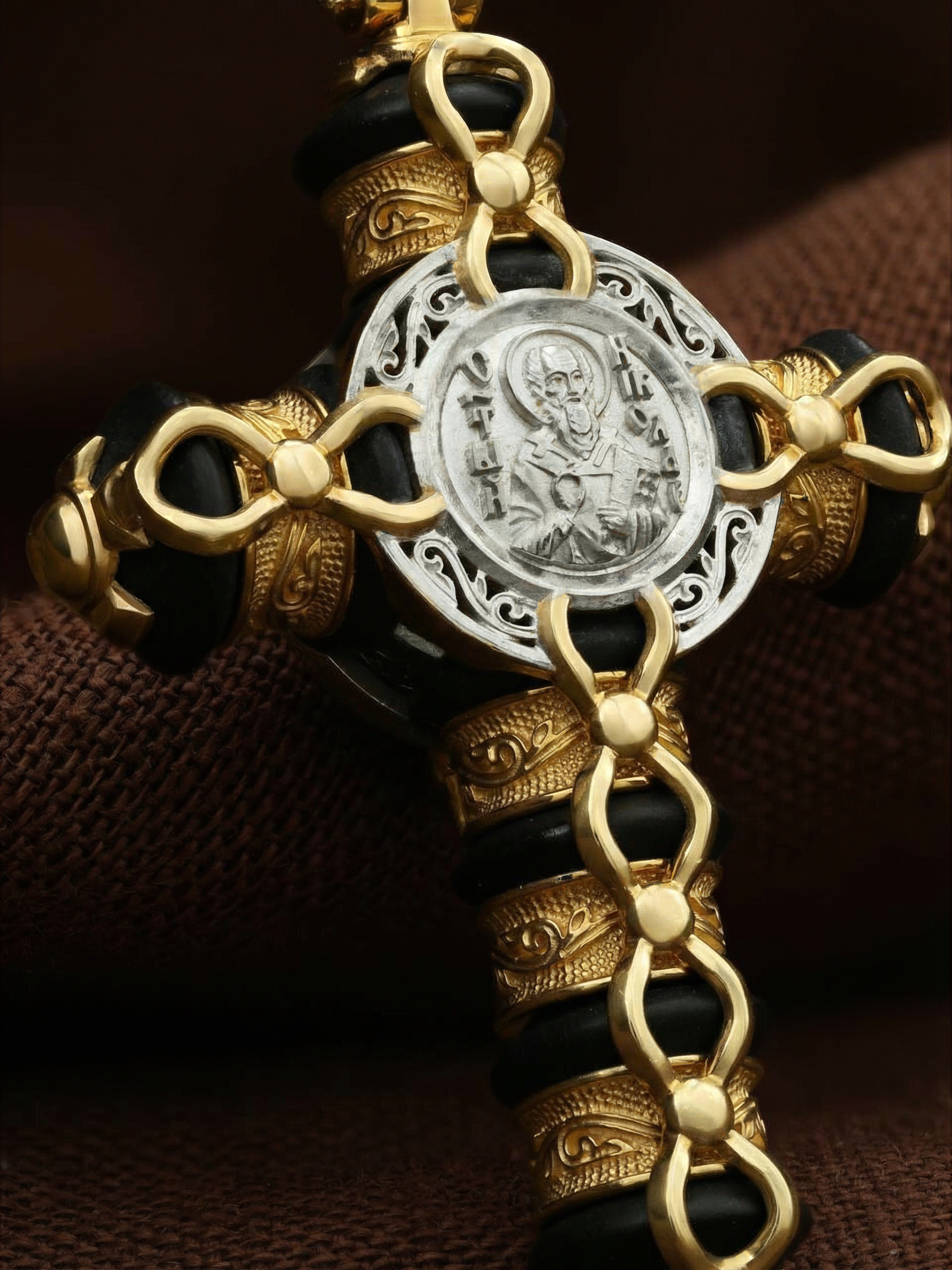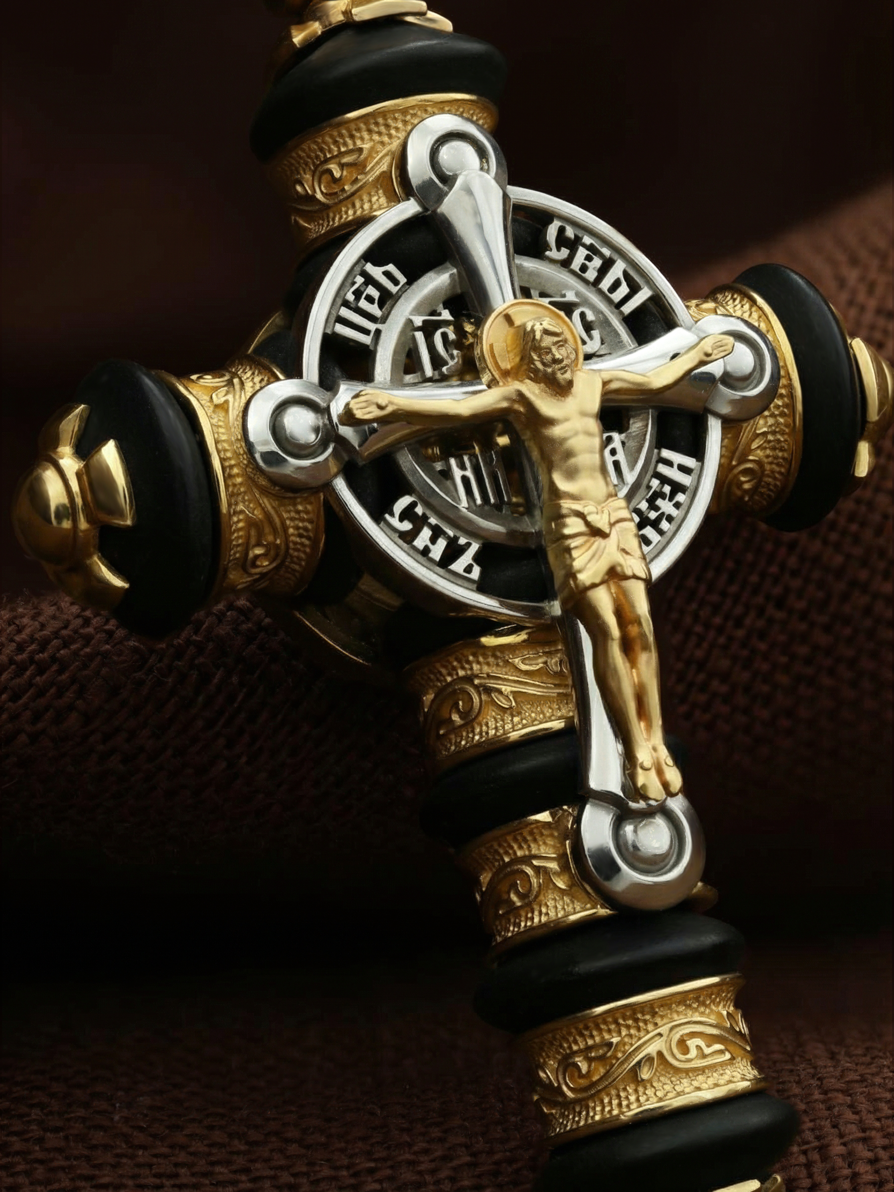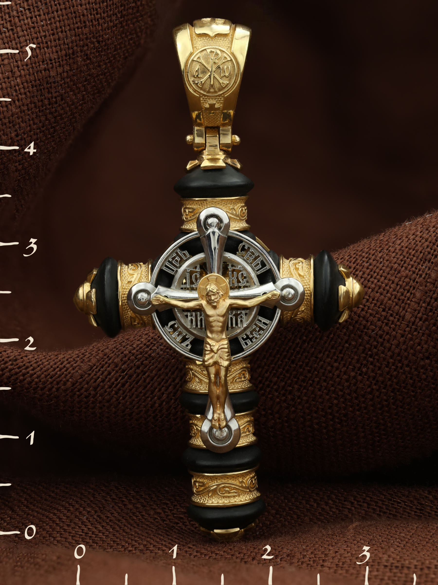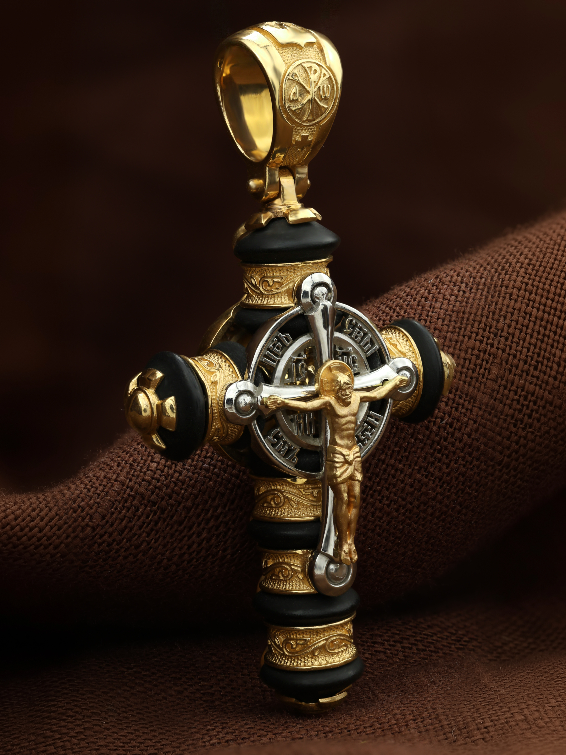 На лицевой стороне креста изображено Распятие Господа и Спасителя нашего Иисуса Христа. Христос, подвергнутый на кресте мучительной казни, своими страданиями искупил нас от древнего греха и даровал нам жизнь вечную. Воплотившийся Сын Божий Своею кровью освятил крест и сделал его проводником Своей благодати, источником освящения верующих. Над вершиной Распятия помещена надпись «Царь Славы». Распятие сопровождается каноническими надписями. Надпись «IС ХС» означает Иисус Христос помещается на разных сторонах поперечной перекладины креста. Рядом помещены надпись –«НИКА», что означает победитель и словосочетание «СЫН БОЖИЙ», что означает божественную природу Иисуса Христа. На православном кресте Христос не умирает, а свободно простирает руки, ладони Иисуса открыты, будто он хочет обнять все человечество, даря им свою любовь и открывая путь к вечной жизни. На кулонном кольце помещен крест Константина — монограмма, известная как «Хи-Ро» («хи» и «ро» — первые две буквы имени Христа по-гречески). Монограмма стала первым общепринятым символом христианства — как знак победы и спасения.