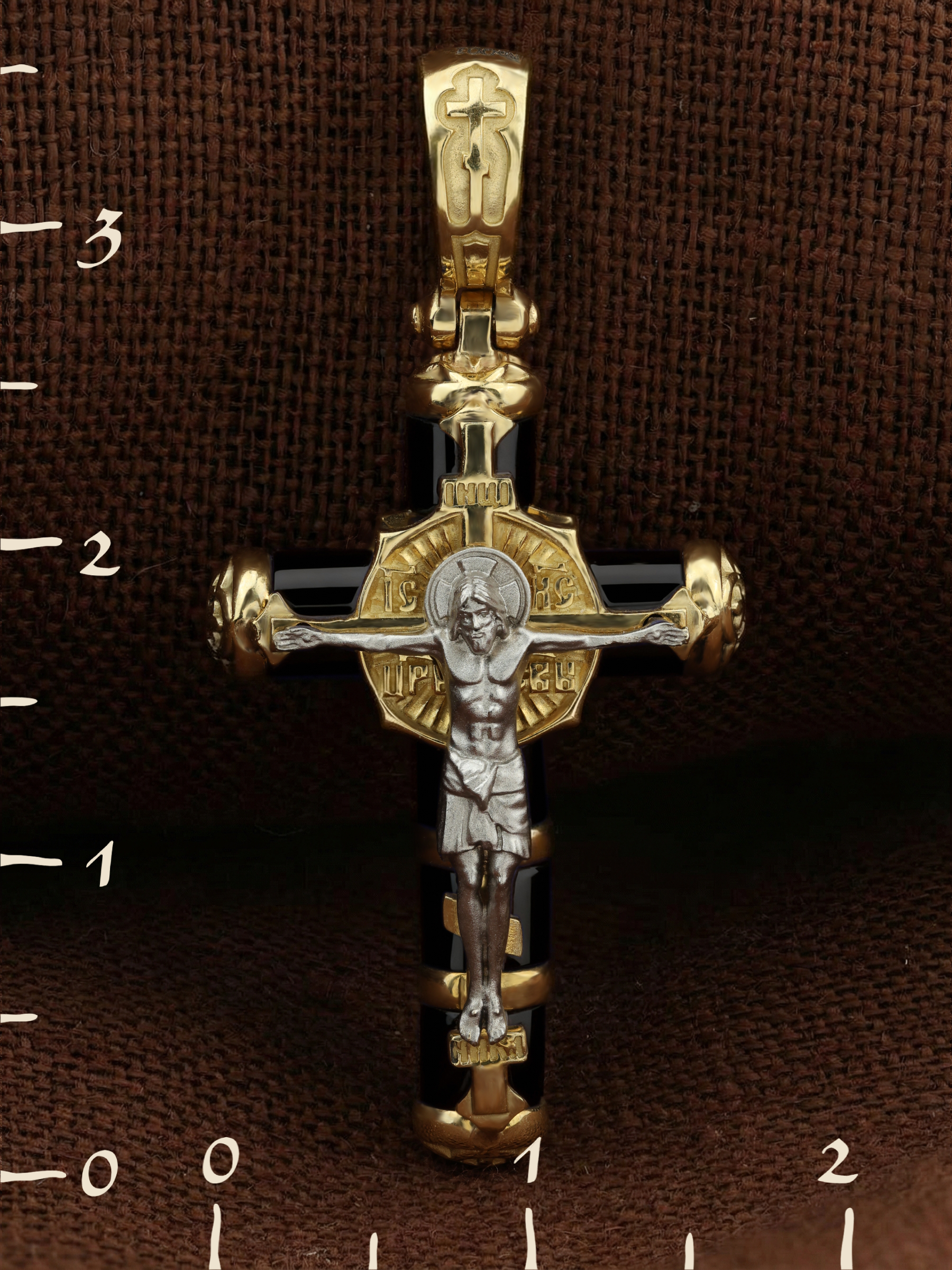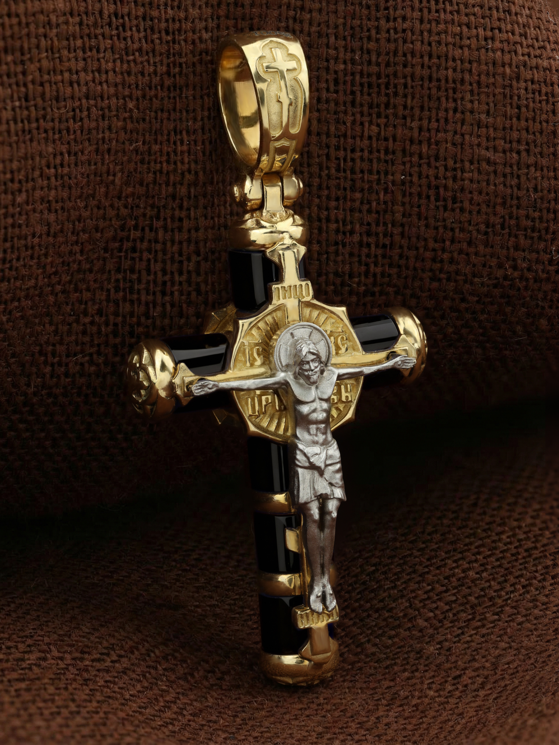 На лицевой стороне креста изображено Распятие Господа и Спасителя нашего Иисуса Христа, отдавшего Себя на смерть, для искупления грехов мира. Крест является символом жертвенной любви всеблагого Бога к падшим людям, всепобеждающим духовным оружием христиан, основанием и средоточием церковной жизни. Верхняя перекладина символизирует титло — табличку, на которой, согласно Евангелию, было начертано: Иисус Назорей Царь Иудейский (IНЦI). Надпись «IС» « ХС» означает Иисус Христос и размещена над поперечной перекладиной. Слева от Распятия изображена Пресвятая Богородица, справа — апостол и евангелист Иоанн Богослов, один из ближайших учеников Иисуса Христа. Возвышение, на котором стоит Крест, символизирует гору Голгофу, на которой произошло Распятие. Под подножием Креста изображена покоящаяся голова (череп) Адама. Под Распятием помещено изображение Духа Святого в виде голубя.
