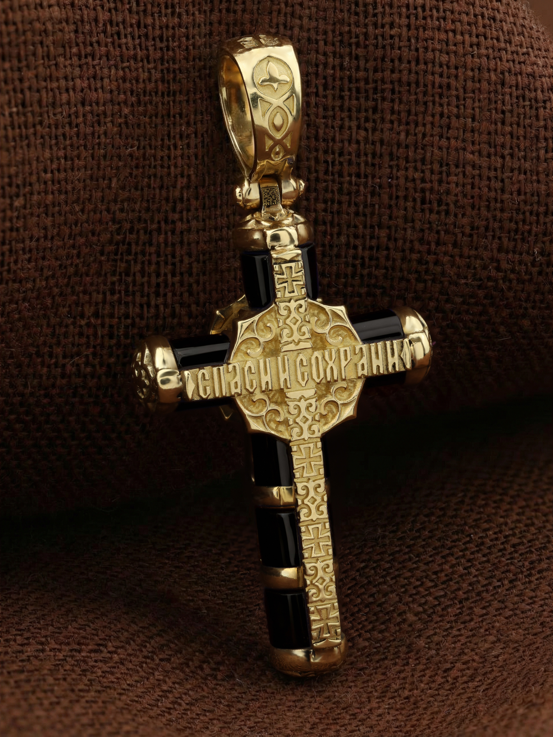 На оборотной стороне креста помещена молитва: «Спаси и сохрани». Крест украшен орнаментом.