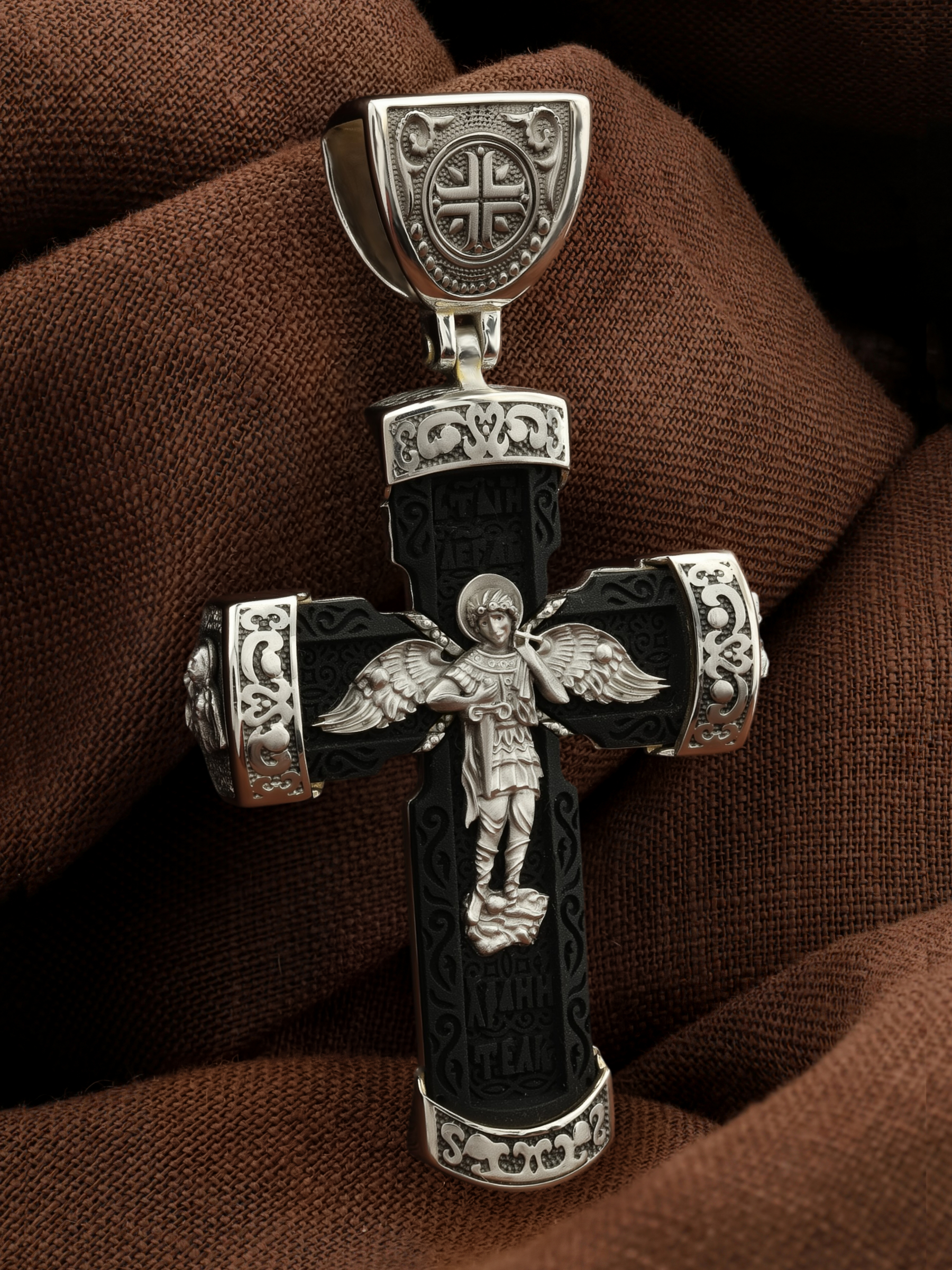 В центре оборота креста изображен Ангела Хранителя с традиционными атрибутами в руках: крестом, которым он осеняет человека, и мечом для прогнания бесов. По Православному учению, каждому, принявшему святое крещение, дается Господом Ангел Хранитель, который сопровождает человека всю его жизнь, помогая в добрых делах и охраняя от нападок злых духов. Святые отцы утверждают, что только верующий человек имеет рядом с собой Ангела Хранителя: «Тем, которые сподобились крещения и возносятся на высоту добродетелей, даны от Бога Ангелы, заботящиеся о них и содействующие им. В этом уверяет нас Господь, когда говорит, что есть Ангелы Хранители у всякого, кто верует в Него» (преп. Анастасий Синаит). Но Ангел Хранитель пребывает с христианином, если только мы не прогоним его греховными делами, поскольку «как дым разгоняет пчел, так и грех прогоняет от нас Ангела Хранителя» (свт. Василий Великий). Но и после завершения земного пути Ангел Хранитель не покидает христианина, а помогает душе преодолеть воздушные мытарства на пути в Царство Небесное.
