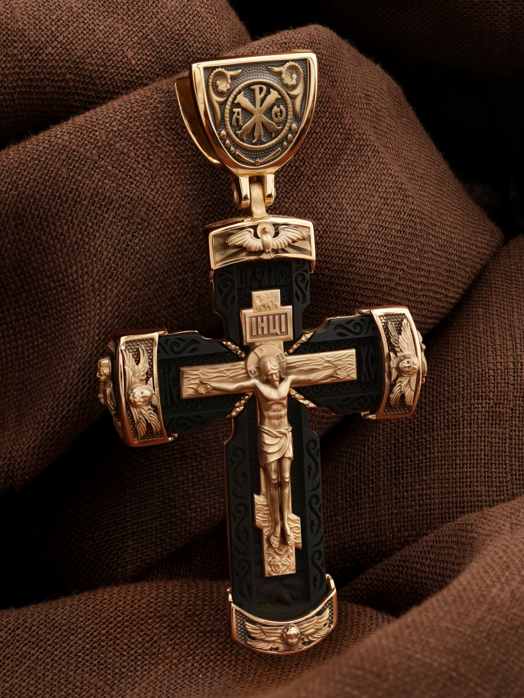 На лицевой стороне креста изображено Распятие, потому что это орудие казни Иисус Христос сделал орудием победы над грехом и смертью. Своими страданиями Он искупил грехи человечества, умерев и сошествовав во ад, победил сатану, освободил души праведников от вечной смерти и открыл им небесные врата рая. Жертва Христа сделала возможным спасение для каждого человека. На православном кресте Христос не умирает, а свободно простирает руки, ладони Иисуса открыты, будто он хочет обнять все человечество, даря им свою любовь и открывая путь к вечной жизни.