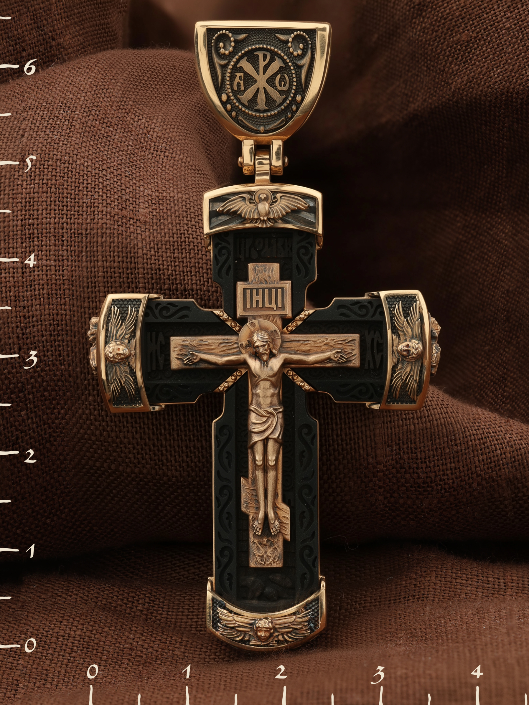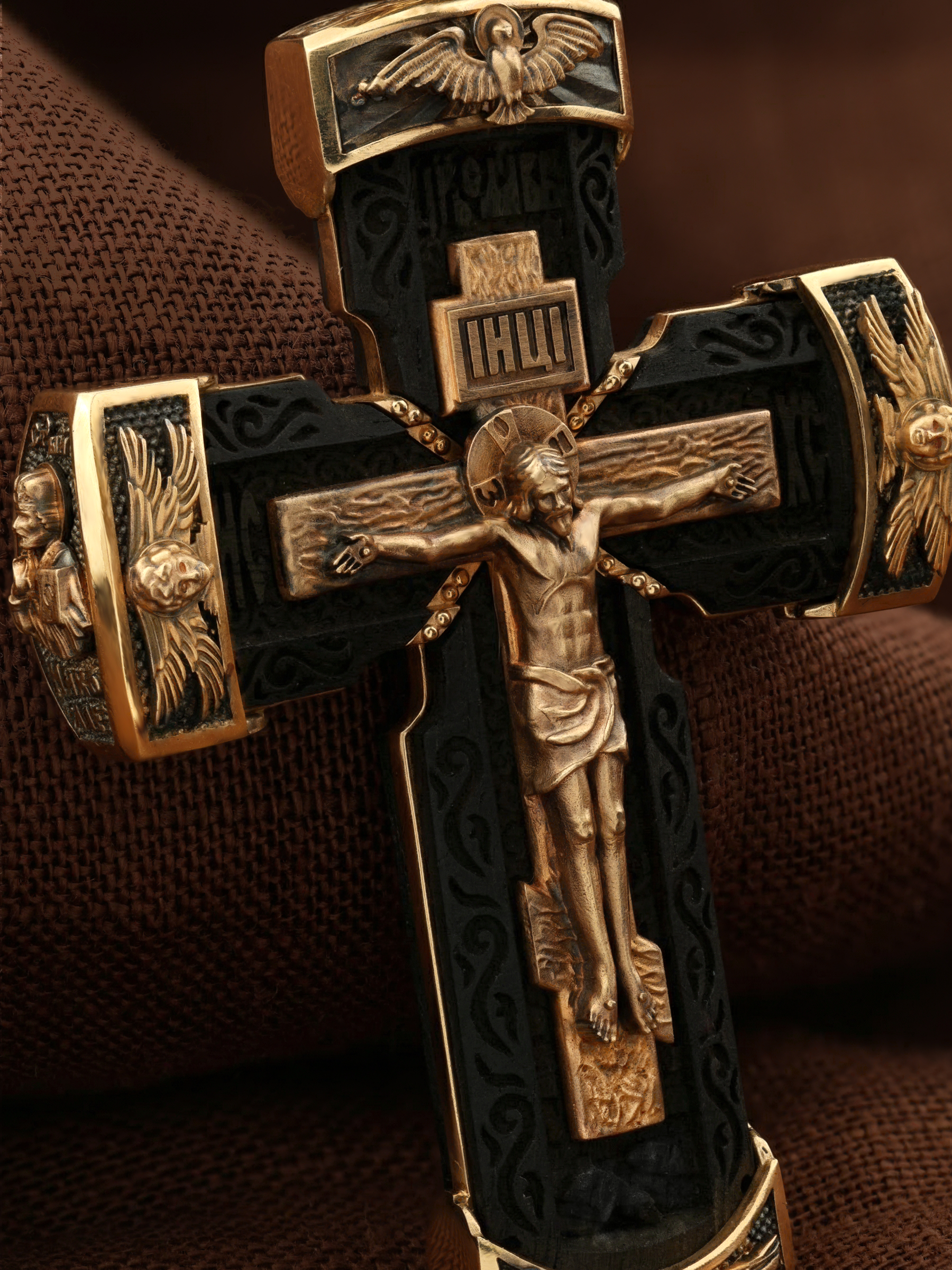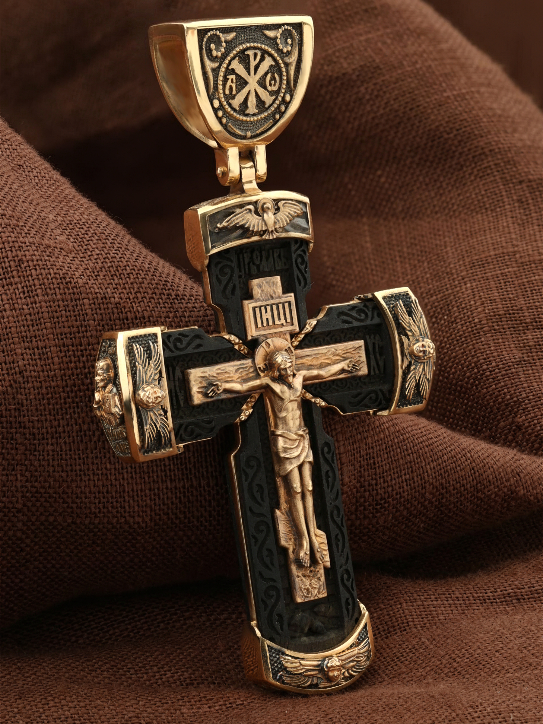 На лицевой стороне креста изображено Распятие, потому что это орудие казни Иисус Христос сделал орудием победы над грехом и смертью. Своими страданиями Он искупил грехи человечества, умерев и сошествовав во ад, победил сатану, освободил души праведников от вечной смерти и открыл им небесные врата рая. Жертва Христа сделала возможным спасение для каждого человека. На православном кресте Христос не умирает, а свободно простирает руки, ладони Иисуса открыты, будто он хочет обнять все человечество, даря им свою любовь и открывая путь к вечной жизни.