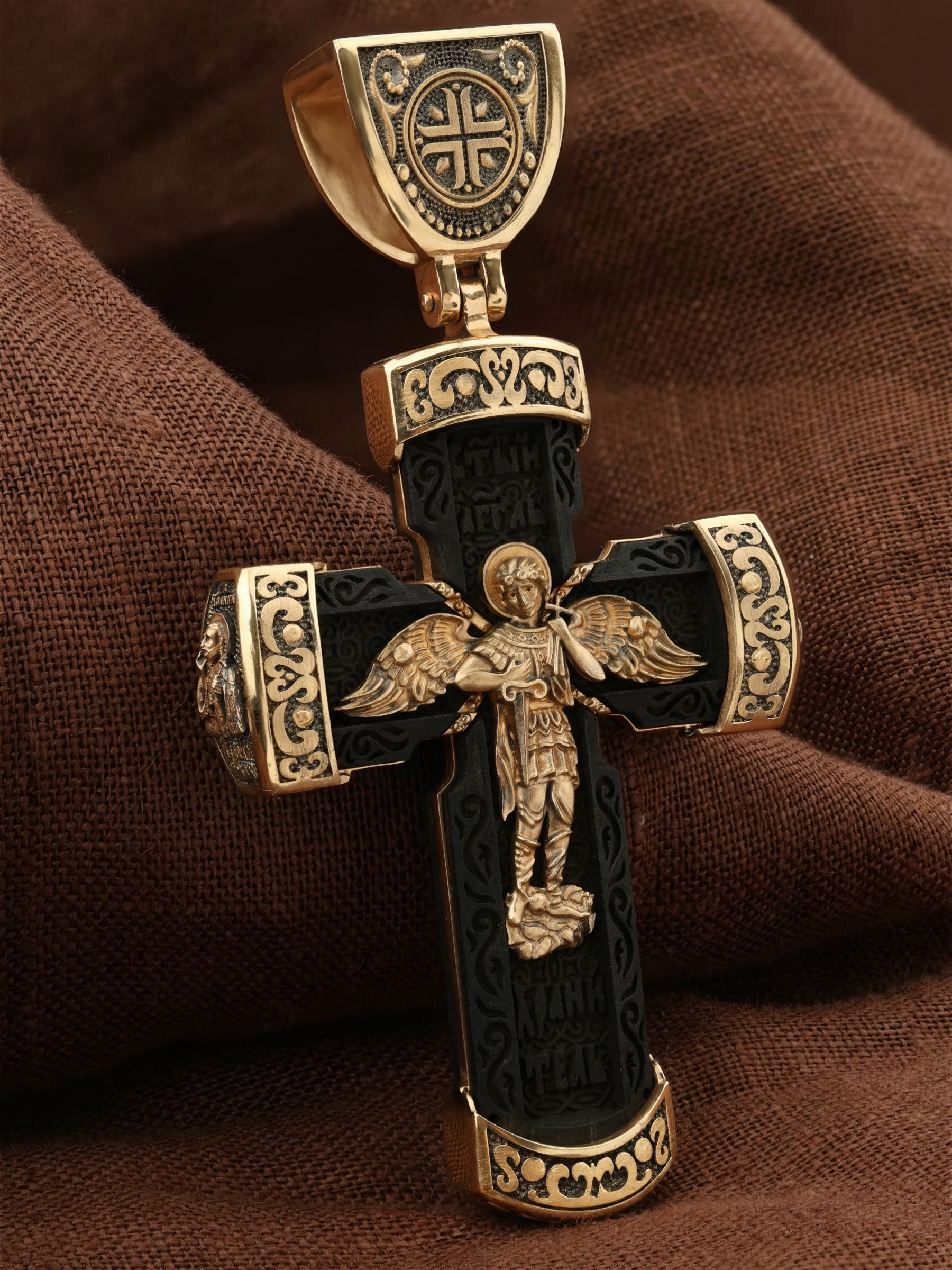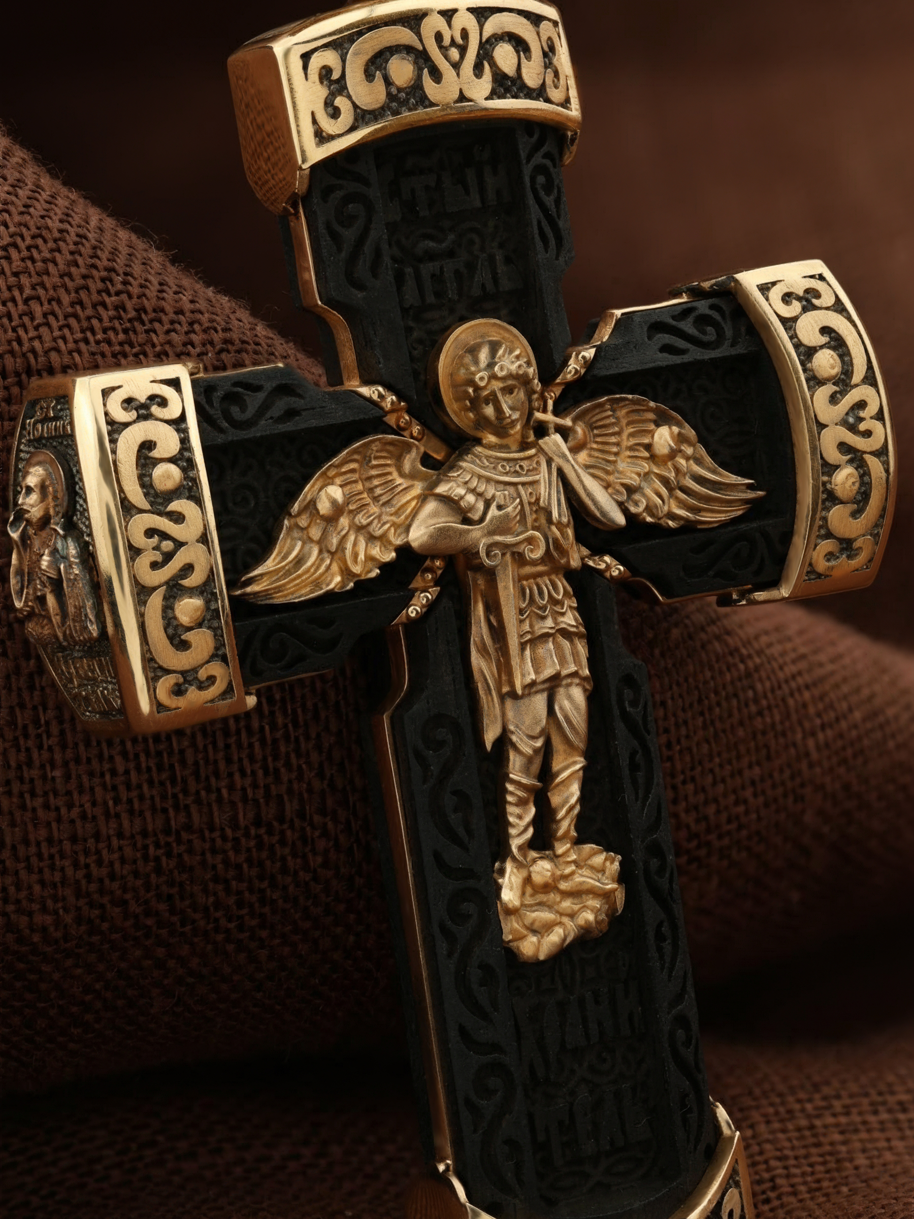 В центре оборота креста изображен Ангела Хранителя с традиционными атрибутами в руках: крестом, которым он осеняет человека, и мечом для прогнания бесов. По Православному учению, каждому, принявшему святое крещение, дается Господом Ангел Хранитель, который сопровождает человека всю его жизнь, помогая в добрых делах и охраняя от нападок злых духов. Святые отцы утверждают, что только верующий человек имеет рядом с собой Ангела Хранителя: «Тем, которые сподобились крещения и возносятся на высоту добродетелей, даны от Бога Ангелы, заботящиеся о них и содействующие им. В этом уверяет нас Господь, когда говорит, что есть Ангелы Хранители у всякого, кто верует в Него» (преп. Анастасий Синаит). Но Ангел Хранитель пребывает с христианином, если только мы не прогоним его греховными делами, поскольку «как дым разгоняет пчел, так и грех прогоняет от нас Ангела Хранителя» (свт. Василий Великий). Но и после завершения земного пути Ангел Хранитель не покидает христианина, а помогает душе преодолеть воздушные мытарства на пути в Царство Небесное.