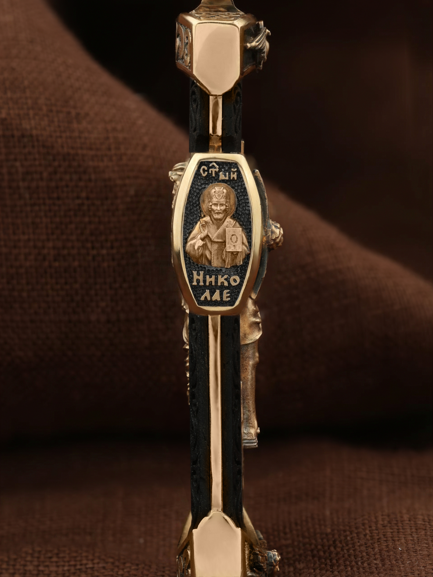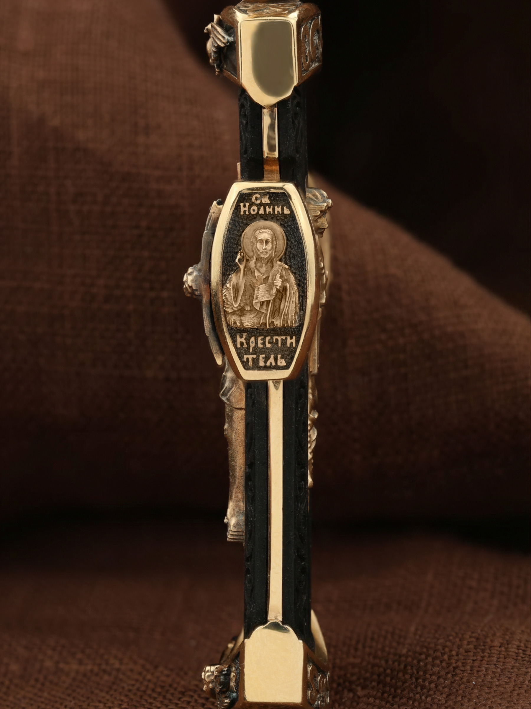 На торце изделия с левой стороны помещена икона Святого Николая Чудотворца — самый почитаемый в Православной Церкви, которого еще называют Николай Угодник за то, что он угодил своей жизнью Богу. Николай Чудотворец, помощник в делах, покровитель учащихся, утешитель обиженных и нуждающихся, целитель самых страшных и тяжелых недугов, предстатель и молитвенник за людей перед Богом. Также Святитель Николай Чудотворец известен своими молитвами за путешественников, когда непрестанный ветер и бушующие волны утихают и корабль заходит в спокойную гавань. На торце изделия с правой стороны — икона Святого Иоанна Крестителя. Святой Иоанн был последним пророком Израиля. Он призывал к покаянию, предвозвещая приближение Царствия Небесного (Мф. 3, 2), и удостоился стать Крестителем Христа. Иисус Христос говорит о нем: «Сей есть о котором написано: «Вот, Я посылаю Ангела Моего пред лицем Твоим, который приготовит путь Твой пред Тобою» (Лк. 7, 27). И еще: «Из рожденных женами нет ни одного пророка больше Иоанна Крестителя» (Лк. 7, 28).