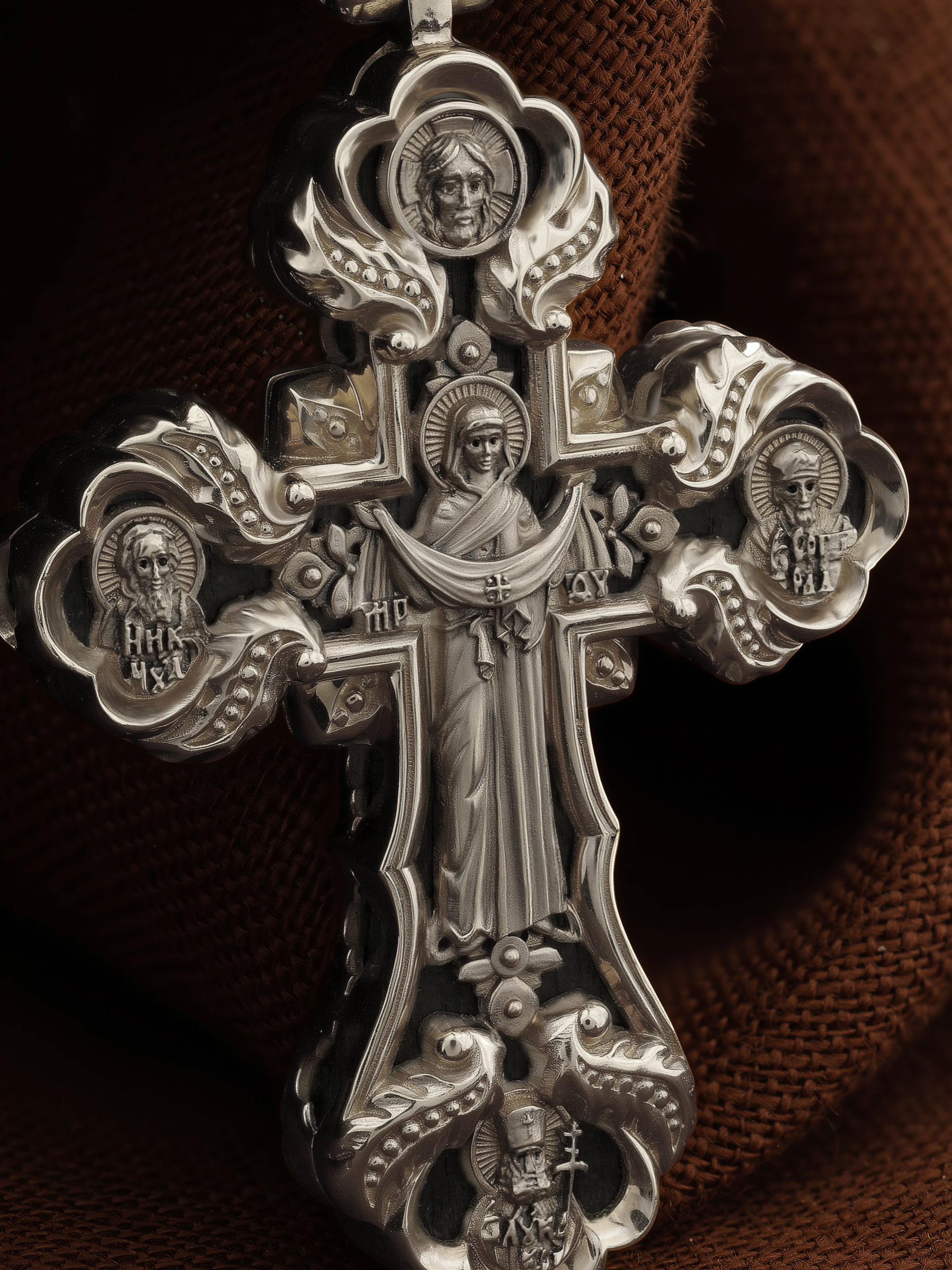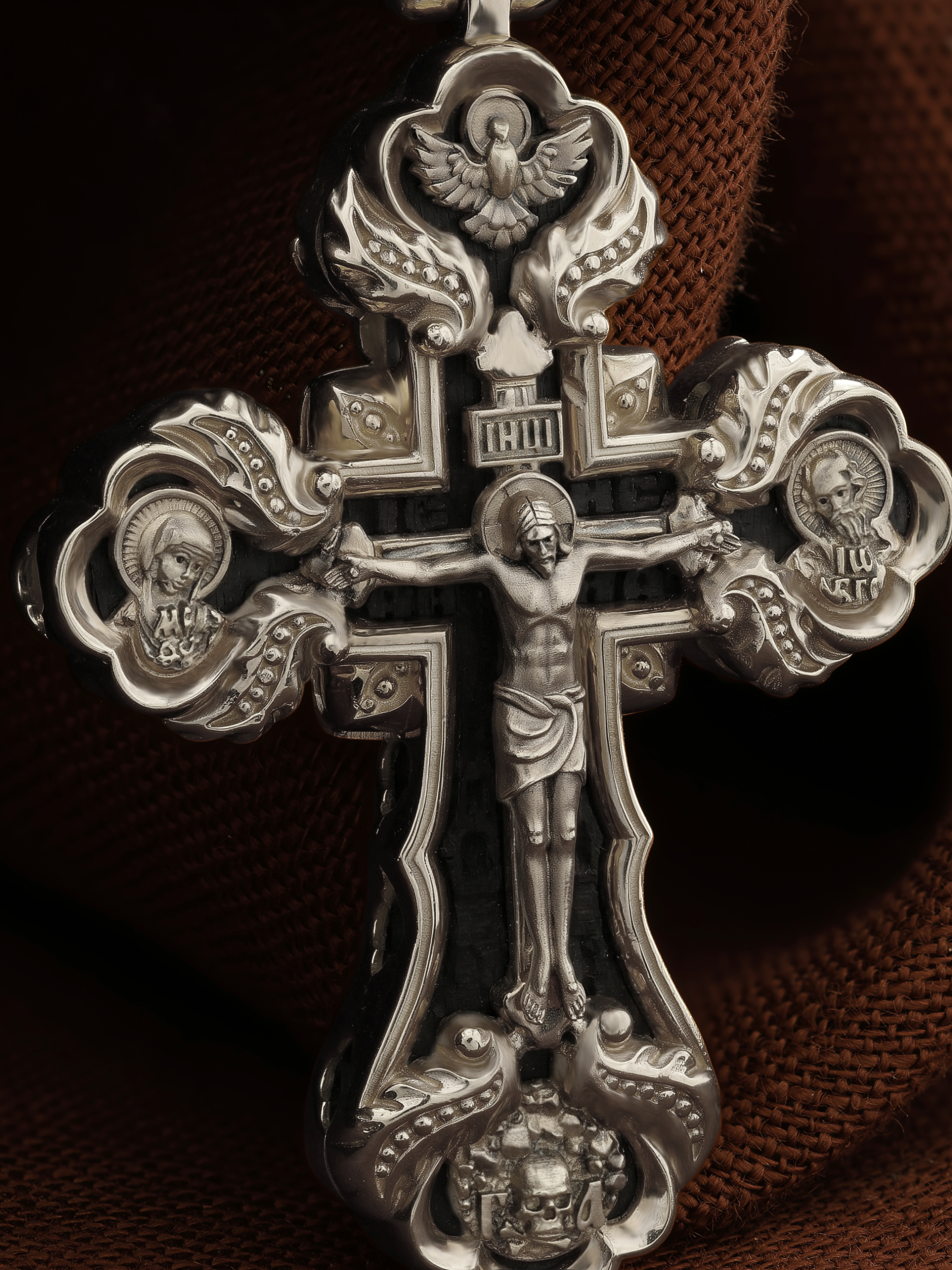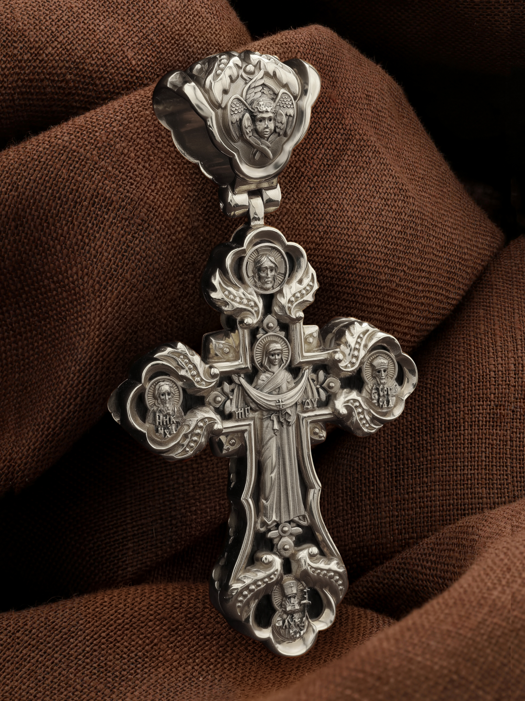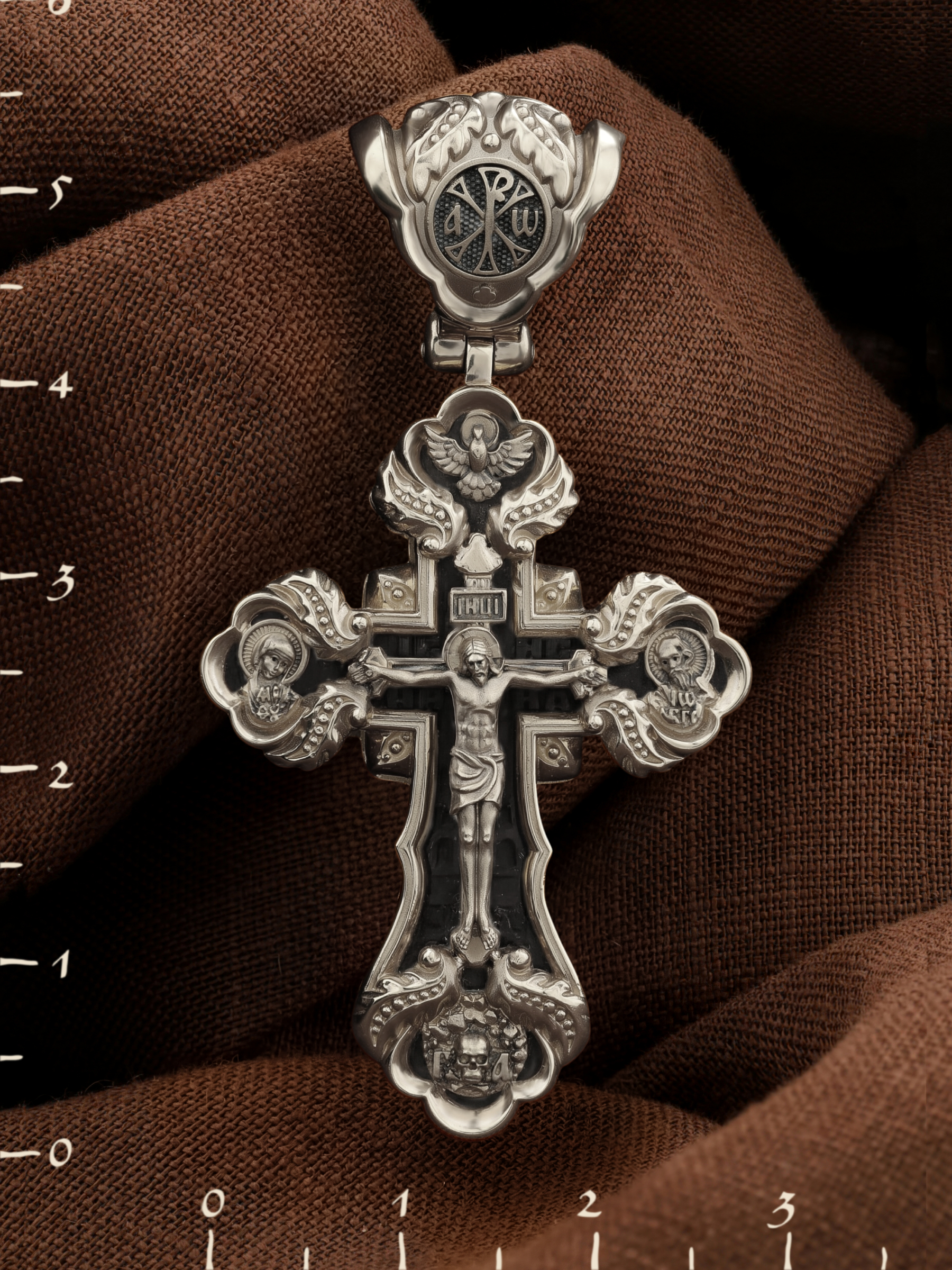 На лицевой стороне креста изображено Распятие Господа и Спасителя нашего Иисуса Христа. Крест- символ спасения и искупления рода человеческого, знамение победы над смертью и адом. Иисус Христос, как искупительная жертва освобождения человечества от власти греха, умер крестной смертью и в третий день воскрес. На верхней табличке, выше головы Иисуса, расположена надпись, составленная Понтием Пилатом — «ИНЦИ». Она означает «Иисус Назорей, Царь Иудейский». Над перекладиной написано сокращенно имя Спасителя «IC» «XC» — Иисус Христос. Ниже перекладины написано слово «НИКА» (греч. — Победитель). Крест стоит на горе камней, символизирующих Голгофу. В ее основании различается череп и надписи «Г.А.» — это голова Адама. Слева от Распятия помещен лик Пречистой Богородицы, скорой помощницы и заступницы рода Христианского. Слева изображен апостол и евангелист Иоанн Богослов, один из ближайших учеников Иисуса Христа. Над Распятием — изображение Духа Святого в виде голубя, сходящего с Небес. На кулонном кольце помещен крест.