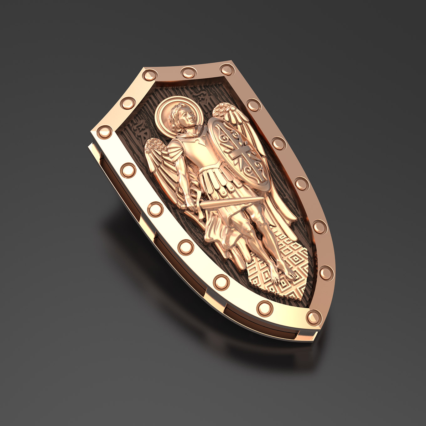 На лицевой стороне образка изображение Архангела Михаила — верного служителя Божия, который низринул с Неба возгордившегося денницу с другими павшими духами. В Православии его называют Архистратигом, что означает глава святого воинства Ангелов и Архангелов. Образок сделан в виде воинского щита. Архангел Михаил изображен в воинственном виде с огненным мечом в правой руке и щитом в левой. Архангел почитается как покровитель воинов и всех верных Богу и ведущих борьбу против сил зла, борец против ересей, а также защитник душ умерших, страж райских врат. С древних времен прославлен своими чудесами Архангел Михаил на Руси. Примеров явления и помощи Архистратига Михаила в русской истории бессчетно. Архангел Михаил не перестает ратоборствовать за славу Творца и Господа всяческих, за дело спасения рода человеческого, за церковь и чад ее. И, согласно, Откровению Иоанна Богослова во время последней битвы небесных и дьявольских сил Михаил и его ангелы опять низвергнут Люцифера вместе с его войском: «Михаил и Ангелы его воевали против дракона, и дракон и ангелы его воевали [против них], но не устояли, и не нашлось уже для них места на небе. И низвержен был великий дракон, древний змий, называемый диаволом и сатаною, обольщающий всю вселенную, низвержен на землю, и ангелы его низвержены с ним» (Откр.12:7−9).