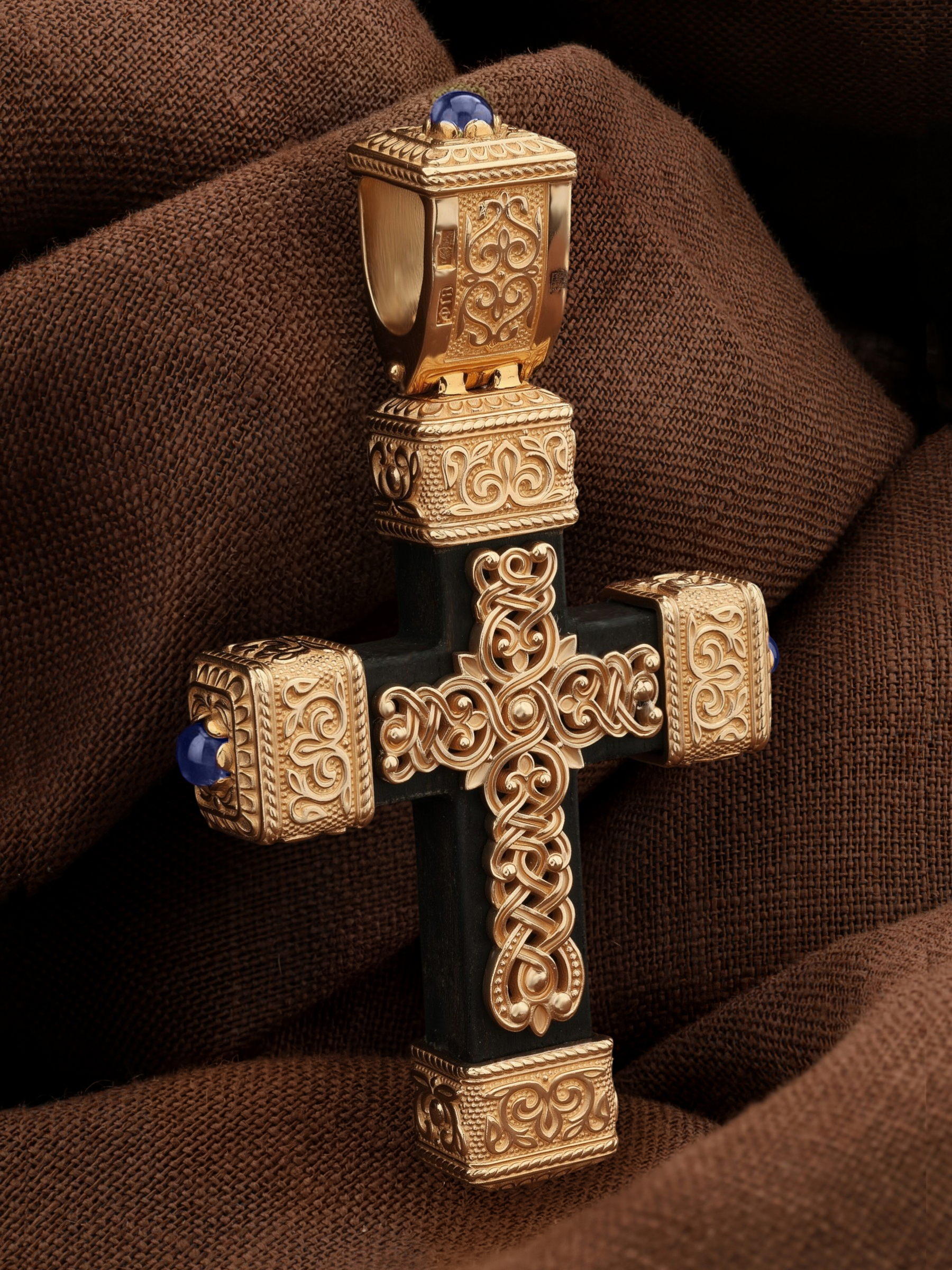 Крест из золота c эмалью, сапфиром и эбеновым деревом