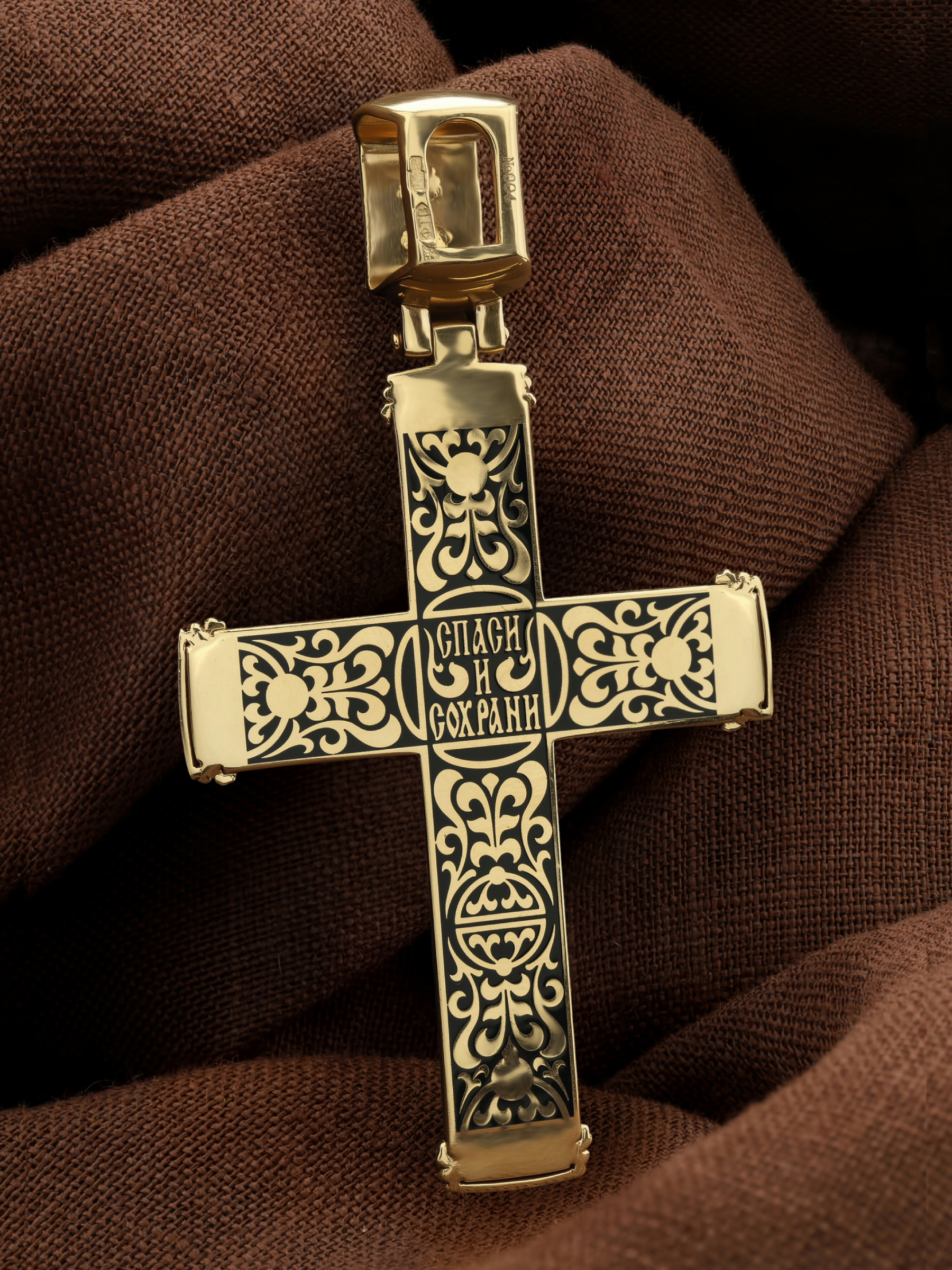 На оборотной стороне креста написана молитва: «Спаси и сохрани». Крест украшен орнаментом.