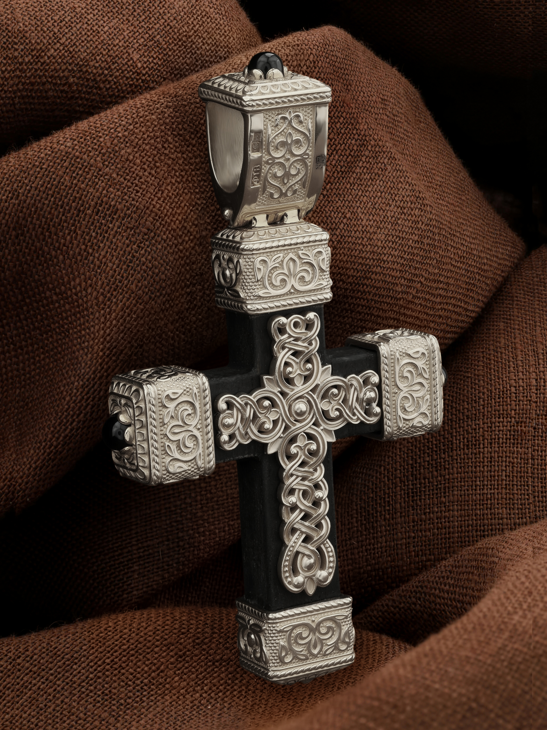 Крест из белого золота c эмалью, ониксом и эбеновым деревом