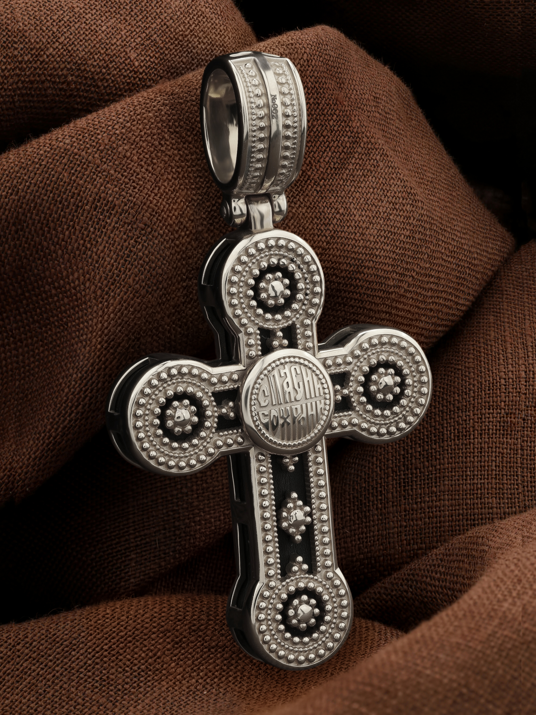 В центрально части оборотной стороны креста написана молитва: «Спаси и сохрани».