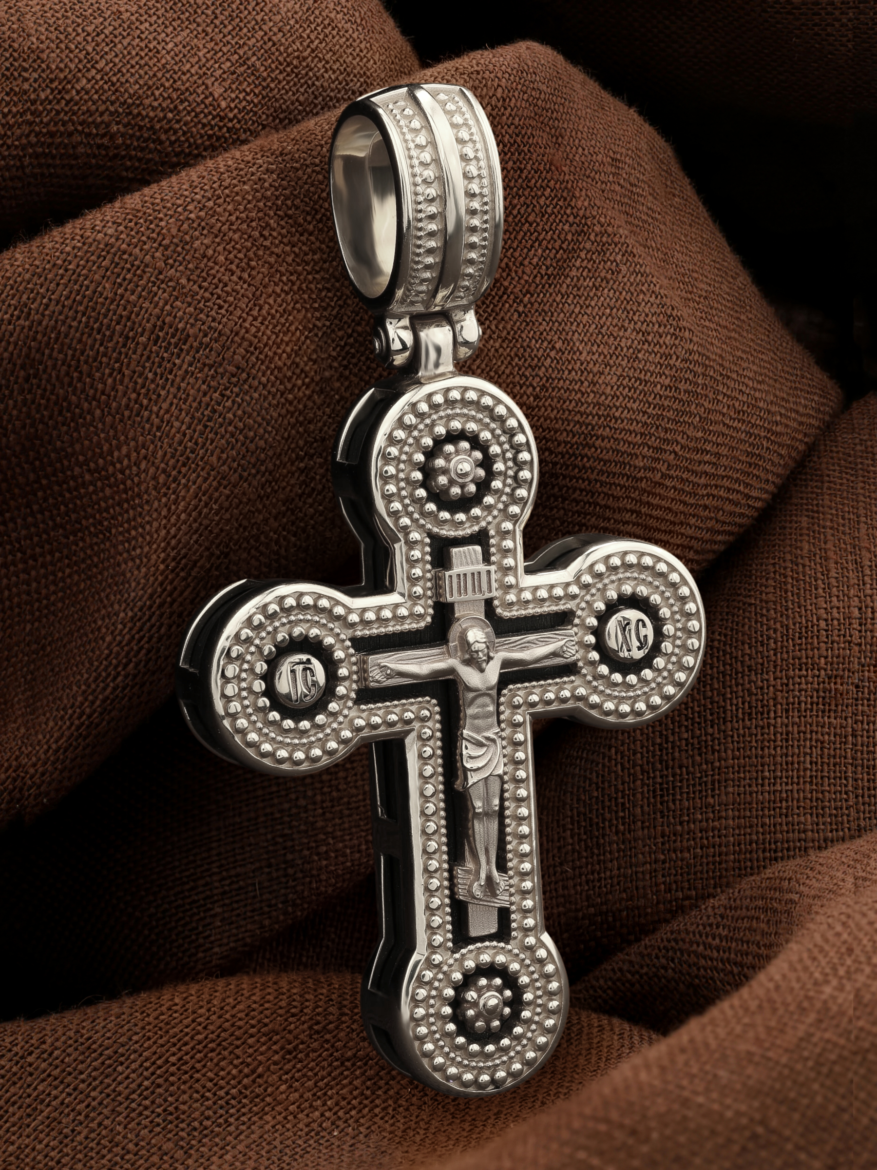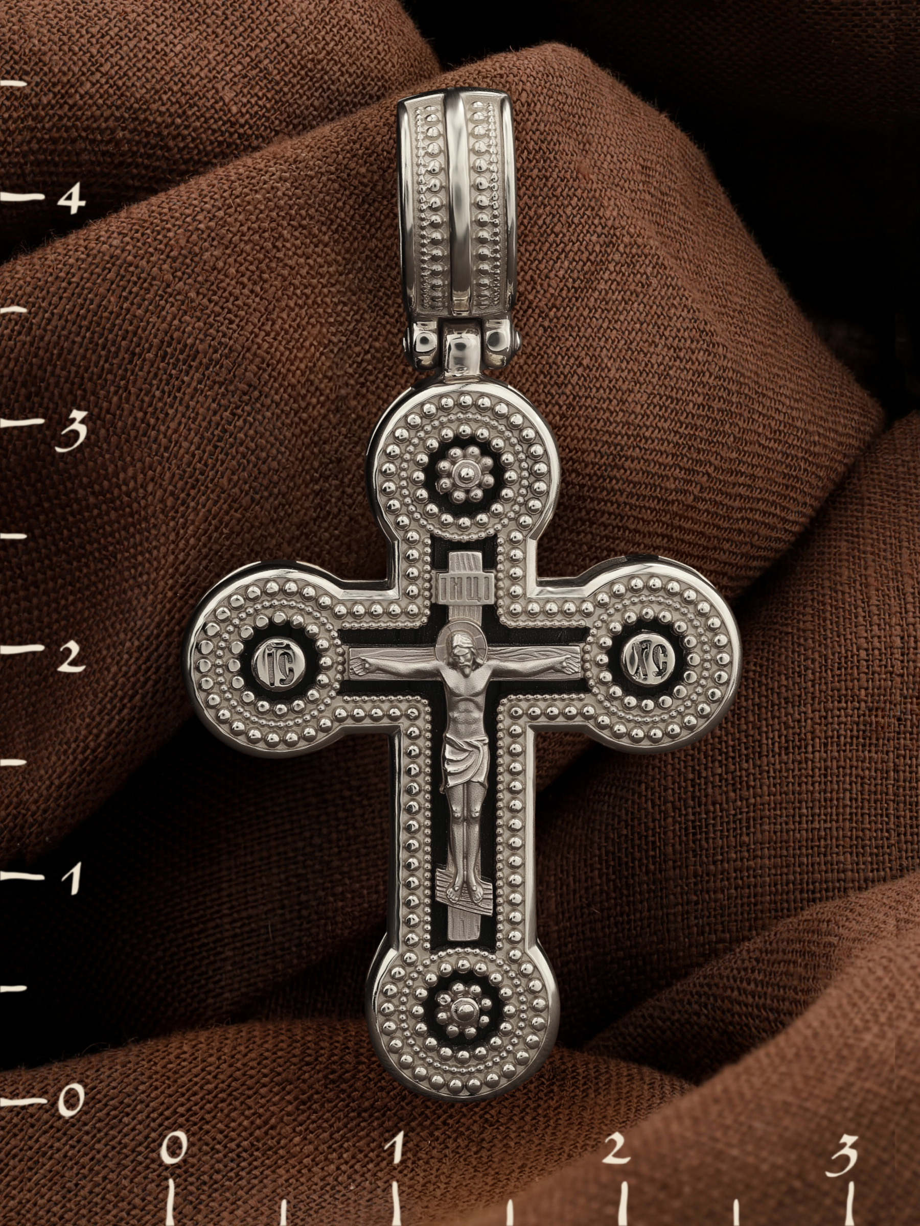 На лицевой стороне креста изображено Распятие Господа и Спасителя нашего Иисуса Христа. Своими крестными страданиями Господь смыл наши грехи, покрыл наш долг перед Богом или, на языке Писания, нас «искупил». В Голгофе сокрыта непостижимая тайна бесконечной правды и любви Бога. Крест стал символом победы добра над злом, жизни над смертью, напоминанием бесконечной Божьей любви, предметом радости. Воплотившийся Сын Божий Своею кровью освятил крест и сделал его проводником Своей благодати, источником освящения верующих. На верхней табличке, выше головы Иисуса, расположена надпись, составленная Понтием Пилатом — «IНЦI». Она означает «Иисус Назорей, Царь Иудейский». Надпись «IC» «ХC», означает Иисус Христос, помещаются на разных сторонах поперечной перекладины креста. Христос в Своей Божественной любви, над которой смерть не властна и которая, страдая, и не страдает в обычном смысле, простирает к людям со Креста Свои объятия, в которые призывается и привлекается весь мир. Поэтому Тело Его не висит, а торжественно покоится на Кресте