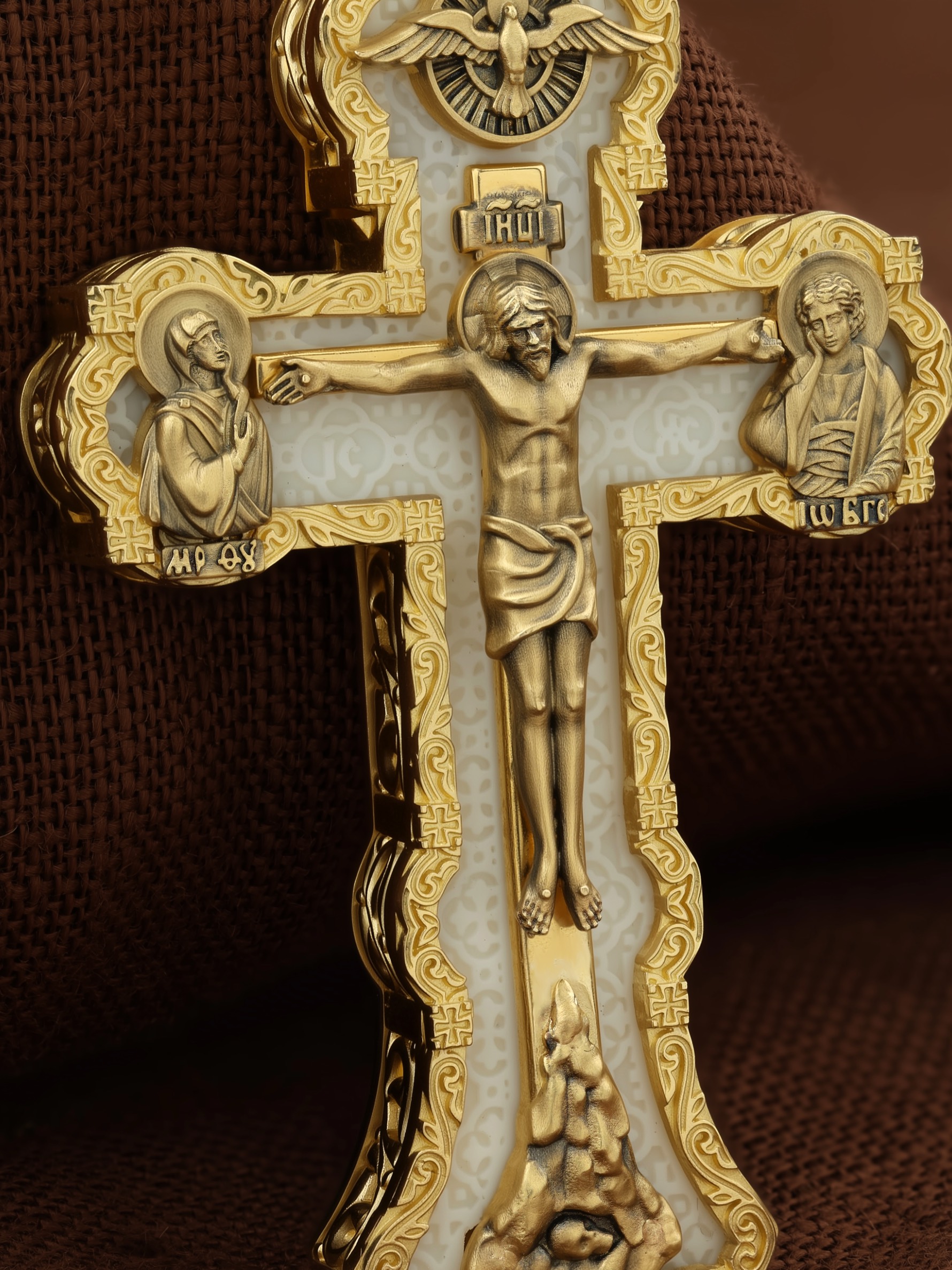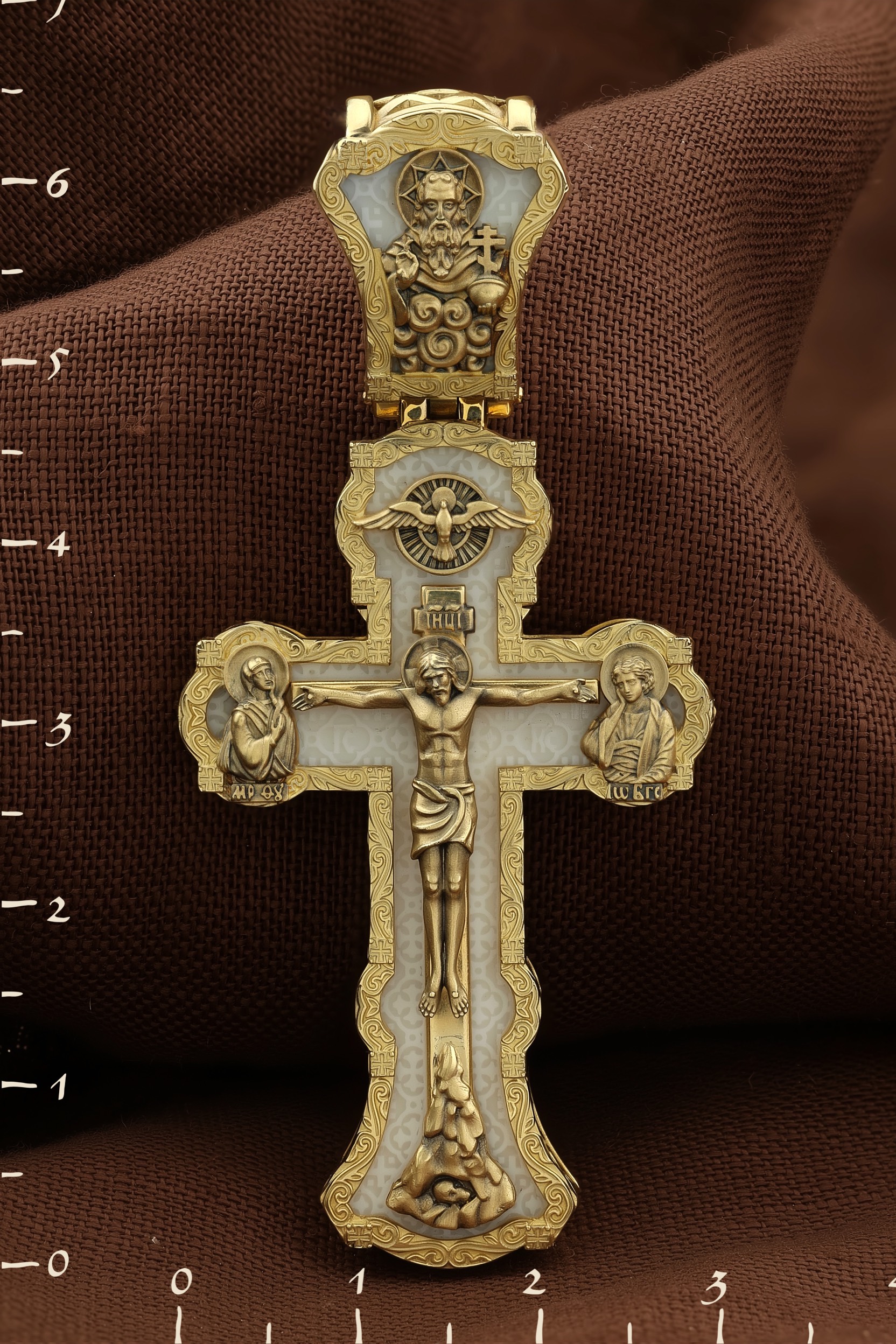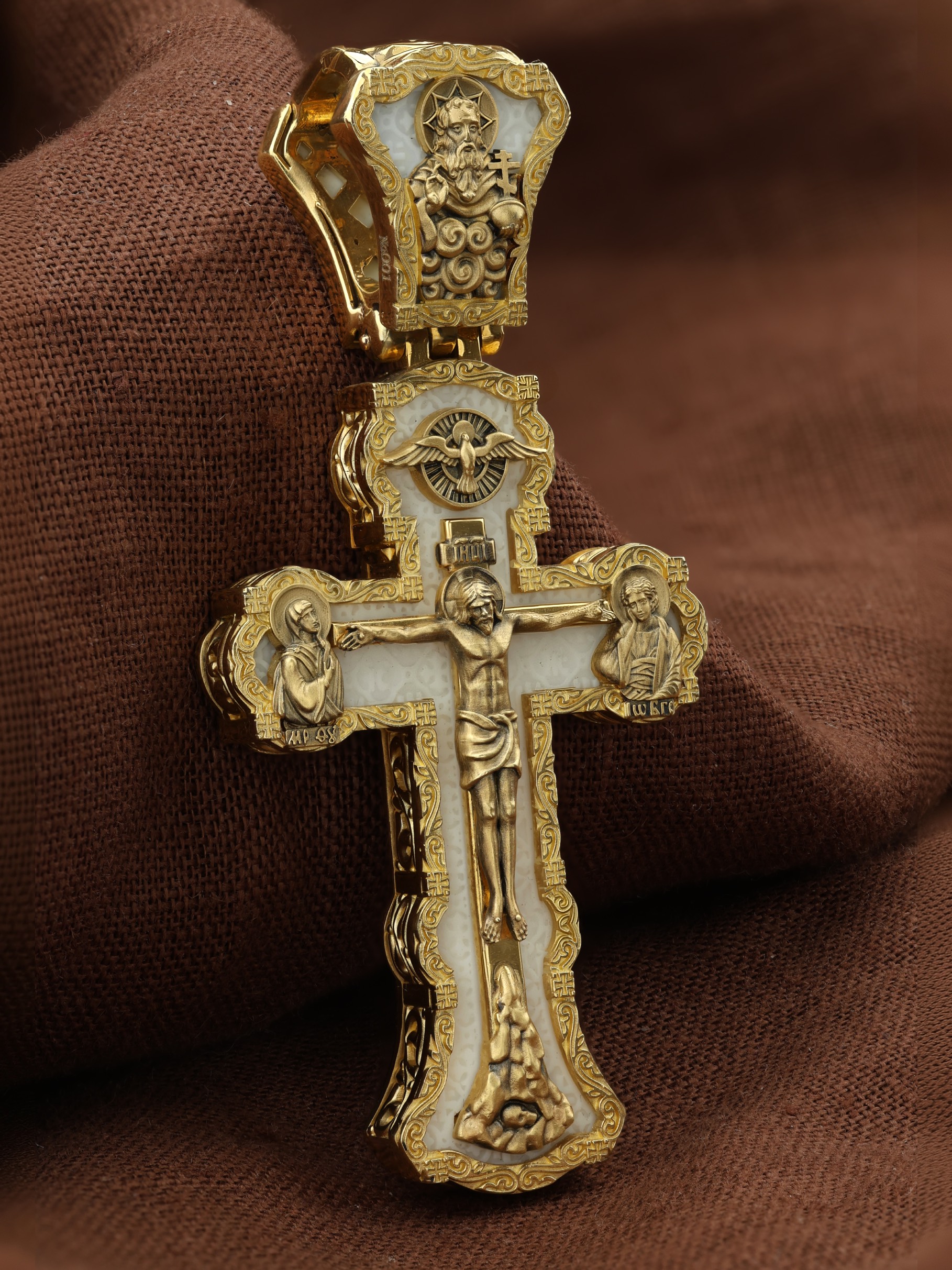 На лицевой стороне креста изображено Распятие Господа и Спасителя нашего Иисуса Христа. Христос, подвергнутый на кресте мучительной казни, своими страданиями искупил нас от древнего греха и даровал нам жизнь вечную. Без Распятия не было бы Воскресения Христова, и поэтому Крест из орудия казни обратился в святыню, в которой действует Благодать Божия. Через крестную жертву Бог раскрывает нам Свою безмерную любовь и призывает к ответной любви. На верхней табличке, выше головы Иисуса, расположена надпись, составленная Понтием Пилатом на трех языках — «IНЦI». Она означает «Иисус Назорей, Царь Иудейский». Надпись «IС ХС» означает Иисус Христос и помещается на разных сторонах поперечной (большой) перекладины креста. Крест стоит на горе камней, символизирующих Голгофу. В ее основании различается череп– это голова Адама. У Креста стоят оплакивающие Господа Божия Матерь и апостол Иоанн Богослов. Из всех апостолов об одном лишь Иоанне Богослове говорится, что он стоял на Голгофе у креста Спасителя, не заботясь о собственной безопасности. Он услышал обращенные к Ней с высоты Креста слова Распятого Господа: «Жено, се сын Твой» и к нему: «Се Мати твоя». С этого времени Иоанн взял Матерь Божию к себе, и Она жила в его доме до самой смерти. Над Распятием — изображение Духа Святого в виде голубя, сходящего с Небес. На кулонном кольце изображен Бог Отец.