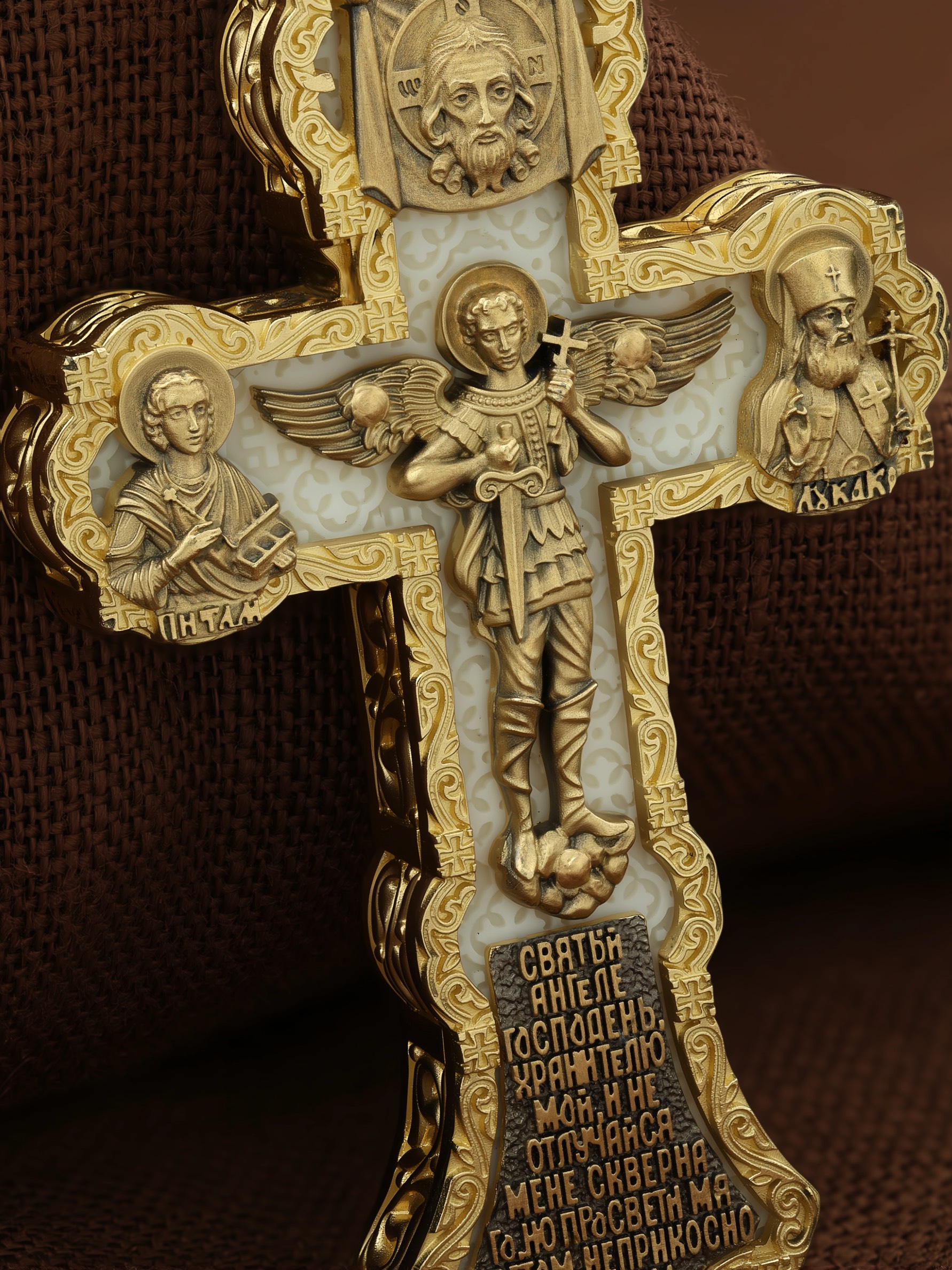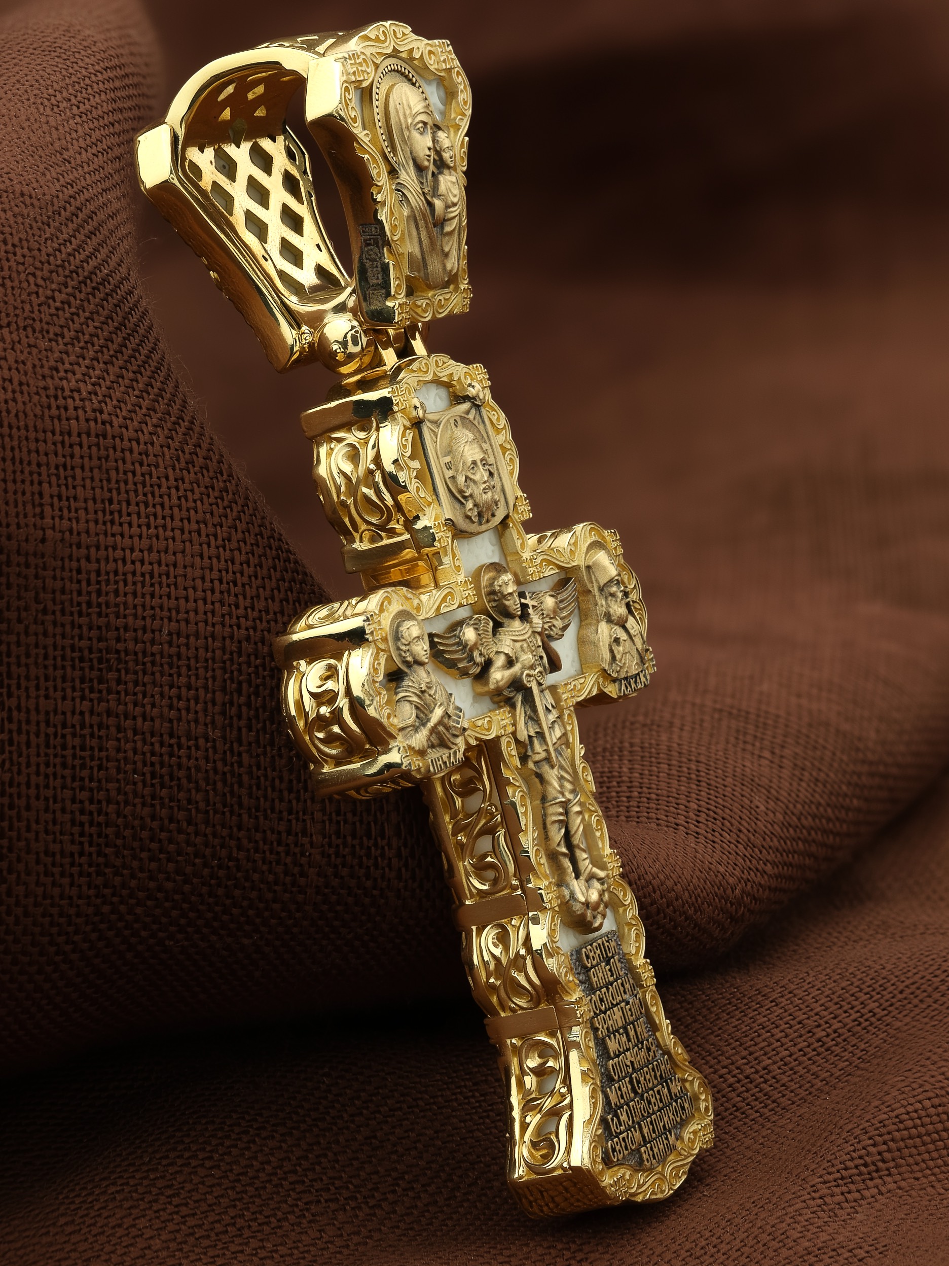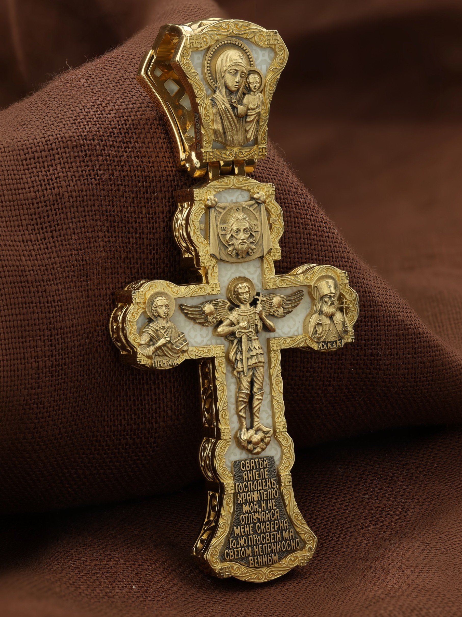 На центральной части оборотной стороны креста изображен Святой Ангел-Хранитель в виде прекрасного юноши держащего в правой руке крест, а в левой — мечь. Ангел-Хранитель — это Ангел приставляемый Богом к человеку при крещении для охраны и помощи в добрых делах. Невидимо пребывая при нас постоянно, он, руководствуя нас ко спасению, не только по нашему желанию таинственно наставляет нас на все доброе и полезное, не только возносит наши молитвы к Богу, но еще и сам от себя охраняют и защищают нас от врагов видимых и невидимых и ходатайствует за нас пред Богом. Ниже образа написана молитва: «Святый Ангеле Господень, Хранитель мой, не отлучайся мене скверного, но просвети мя светом неприкосновенным.» Выше образа изображен Спас Нерукотворный — образ Господа и Спасителя нашего Иисуса Христа, чудесно отпечатавшийся на плате, котором Христос вытер свой лик. Слева — Свя¬той ве¬ли¬ко¬му¬че¬ник и це¬ли¬тель Пан¬те-ле¬и¬мон. Господь даровал удивительную силу его молитве. Ею он исцелял любые болезни, воскрешал мертвых. Справа — Святитель Лука (Войно-Ясенецкий). На кулонном кольце изображена Казанская икона Божией Матери — одна из самых любимых на Руси.