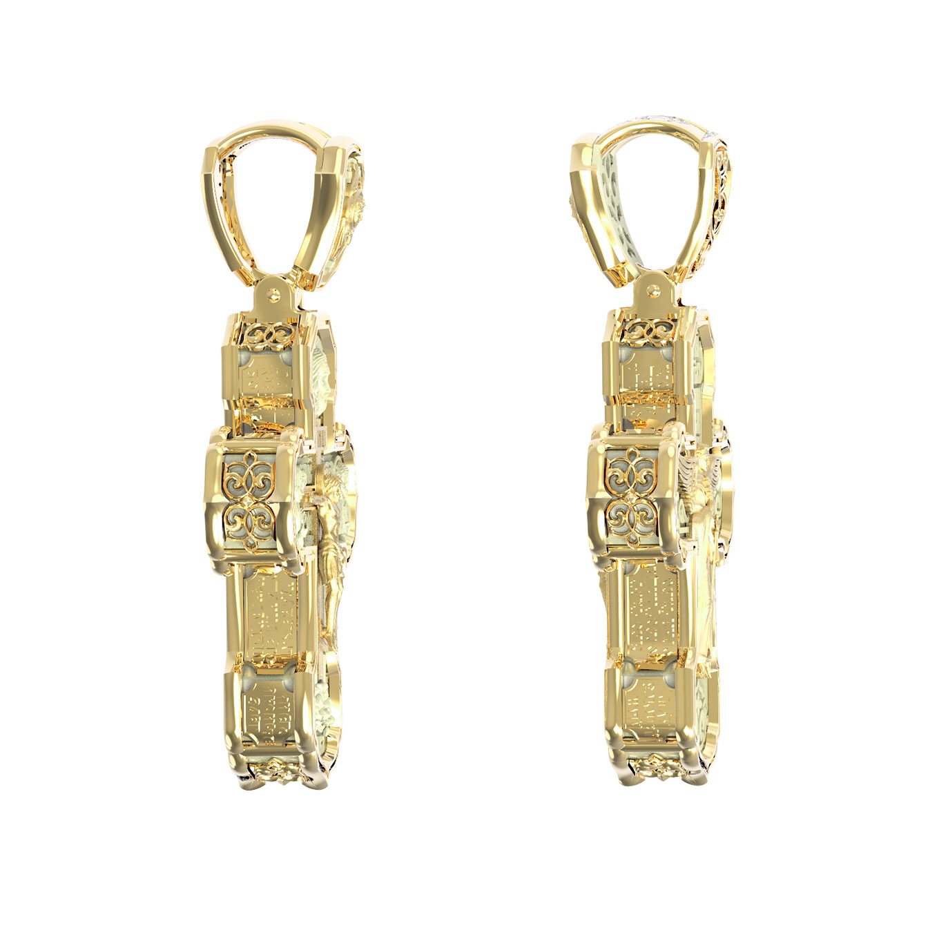 На лицевой стороне креста изображено Распятие Господа и Спасителя нашего Иисуса Христа. Крест- символ спасения и искупления рода человеческого, знамение победы над смертью и адом. Иисус Христос, как искупительная жертва освобождения человечества от власти греха, умер крестной смертью и в третий день воскрес. На верхней табличке, выше головы Иисуса, расположена надпись, составленная Понтием Пилатом — «IНЦI». Она означает «Иисус Назорей, Царь Иудейский». Надпись «IС» « ХС» означает Иисус Христос и помещается на разных сторонах поперечной (большой) перекладины креста. Рядом расположена надпись «Сын Божий». Выше Распятия изображен Нерукотворный образ Господа и Спасителя нашего Иисуса Христа. Слева от Распятия изображена Пресвятая Богородица, справа — апостол и евангелист Иоанн Богослов, один из ближайших учеников Иисуса Христа. Крест стоит на горе камней, символизирующих Голгофу. В ее основании различается череп — это голова Адама. Вдоль креста изображены копие сотника Лонгина и трость с губкой и буквы «К» и «Т». Надпись «МЛРБ» — «место лобное рай бысть» означает, что место лобное стало раем и помещаются в нижней части креста. Рядом — слово «НИКА», что означает «победитель». На православном кресте Христос не умирает, а свободно простирает руки, ладони Иисуса открыты, будто он хочет обнять все человечество, даря им свою любовь и открывая путь к вечной жизни. На кулонном кольце изображен шестикрылый Серафим.