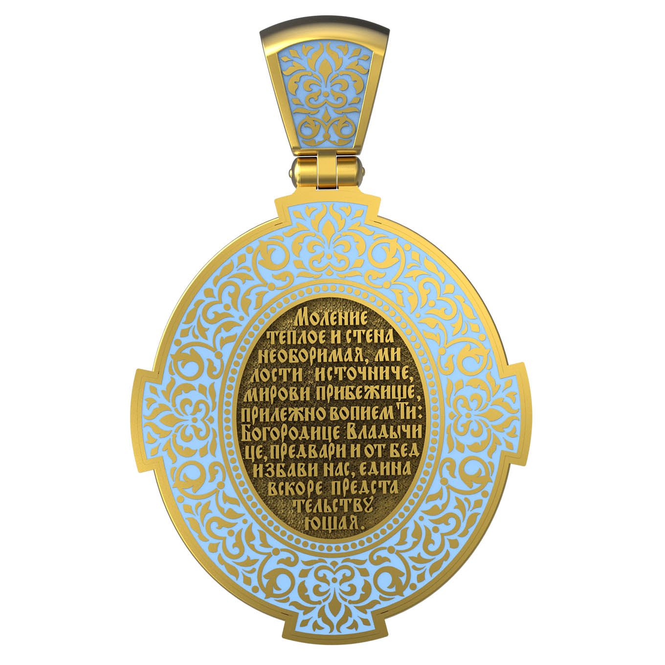 На лицевой стороне образка изображена Владимирская икона Божией Матери — одна из самых чтимых святынь Русской православной церкви. По преданию, икона была написана Святым апостолом и евангелистом Лукой во время земной жизни Богородицы. Дева Мария, увидев Свое изображение, молвила: «Отныне ублажат Мя вси роди. Благодать Рождшегося от Меня и Моя с сим образом да будет». Образ написан в лирическом иконографическом типе «Умиление». Младенец припал щекой к щеке Матери и тянется к ней правой рукой, другой нежно обнимая за шею. Икона вплоть до V века находилась в Иерусалиме, затем была перевезена в Византию. На Русь икона была привезена в 1131 г. За прошедшие столетия святыня неоднократно переезжала из Владимира в Москву и обратно, не раз спасая страну от захватчиков. Русская Православная Церковь установила троекратное празднование Владимирской иконе Божьей Матери. Каждый из дней празднования связан с избавлением русского народа от порабощения иноплеменниками по молитвам ко Пресвятой Богородице. В последующие века у иконы происходили многие важные исторические события: подписание актов, принятие присяги значимых государственных деятелей и возведение на престол. На кулонном кольце изображен Спас Нерукотворный — образ Господа и Спасителя нашего Иисуса Христа, чудесно отпечатавшийся на плате, котором Христос вытер свой лик.