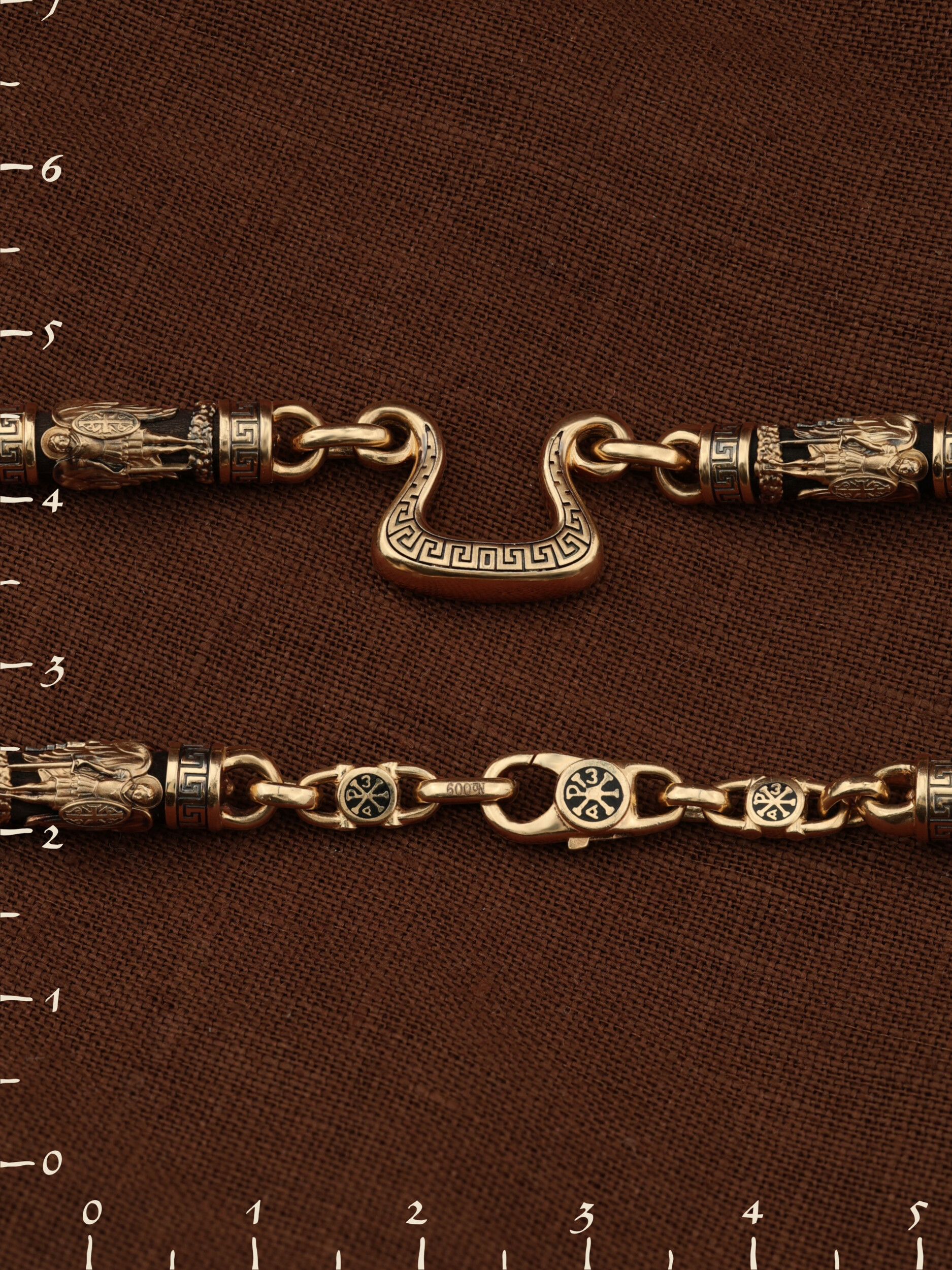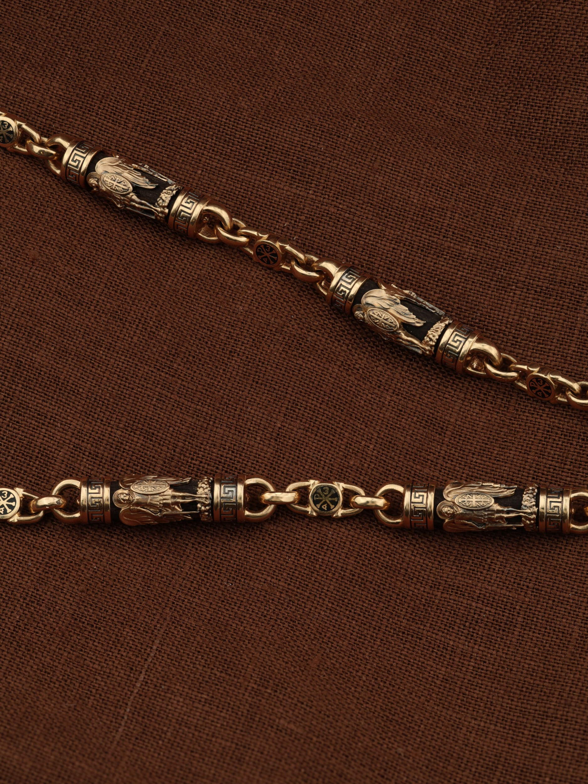 На звеньях цепи изображена Хризма — монограмма имени Христа, которая состоит из двух начальных греческих букв имени — Х (хи) и Р (ро), скрещённых между собой. По краям монограммы помещены греческие буквы a и w. Такое употребление этих букв восходит к тексту Апокалипсиса: «Аз есмь Альфа и Омега, начало и конец, говорит Господь, Который есть и был и грядет, Вседержитель.» (Откр. 1:8; см. также Откр. 22:13). Также на звеньях изображен Святой Ангел-Хранитель в виде прекрасного юноши держащего в правой руке мечь, а в левой — щит. Ангел-Хранитель — это Ангел приставляемый Богом к человеку при крещении для охраны и помощи в добрых делах. Он невидимо находится при человеке на протяжении всей его жизни, если человек сохраняет в себе любовь к Богу и истинную веру перед Ним. Ангел-Xранитель делают для нас все, что служит к истинному нашему благу и спасению. Невидимо пребывая при нас постоянно, он, руководствуя нас ко спасению, не только по нашему желанию таинственно наставляет нас на все доброе и полезное, не только возносит наши молитвы к Богу, но еще и сам от себя охраняют и защищают нас от врагов видимых и невидимых и ходатайствует за нас пред Богом. Ангел-Хранитель так любит нас, как никто на земле любить не может. Одного лишь каждому из нас он желает — спасения души; к этому он направляет все свои заботы. И если видит нас также заботящимися о спасении, радуется, если же видит нас пребывающими в нерадении о душе своей, скорбит. Но и самый великий грешник может примириться со своим Ангелом-Хранителем посредством искреннего раскаяния в грехах и оставления их навсегда. В таком случае, по слову Писания, великая радость бывает для всех ангелов на небесах (Лк. 15:10). Цепь украшена орнаментом.
