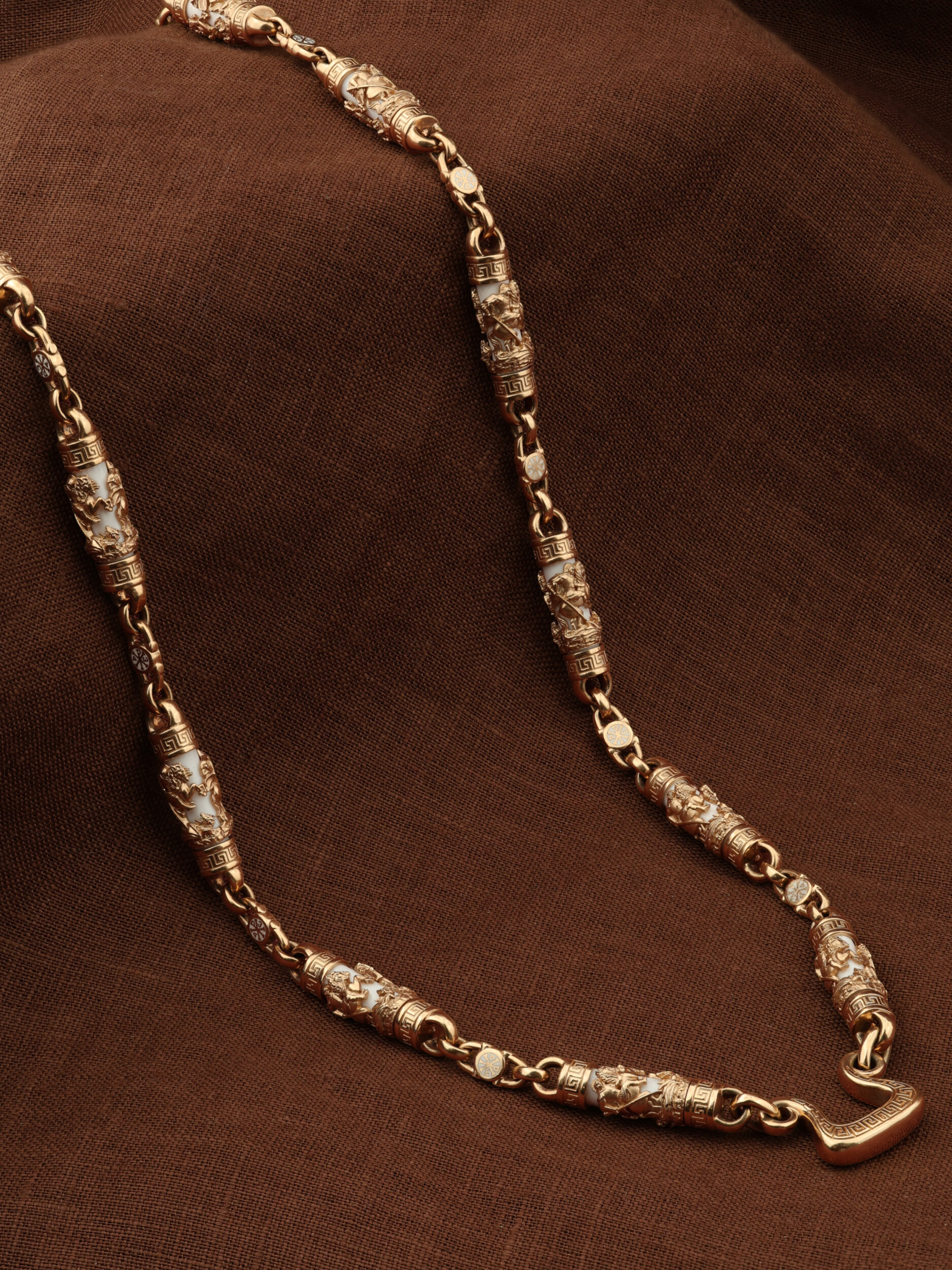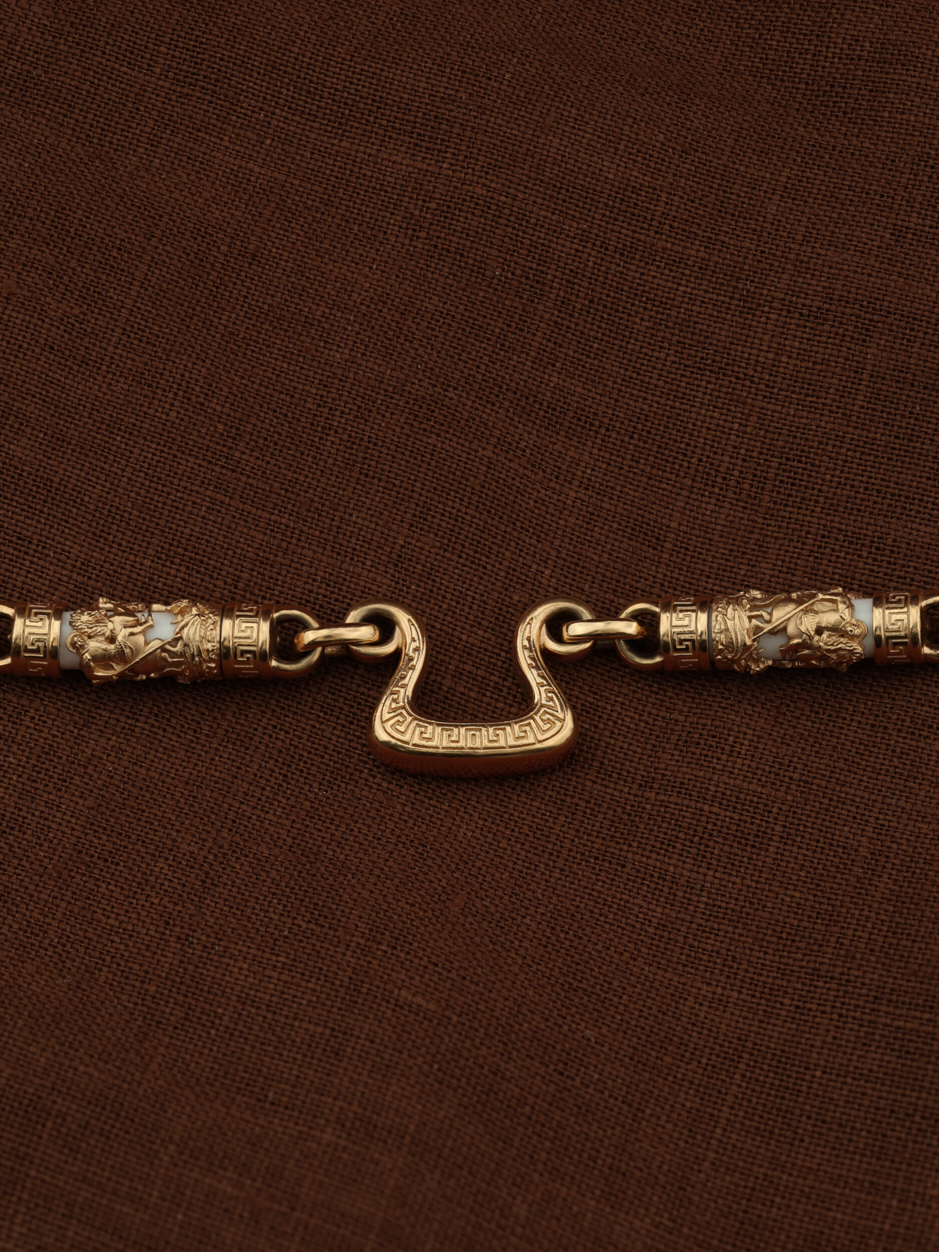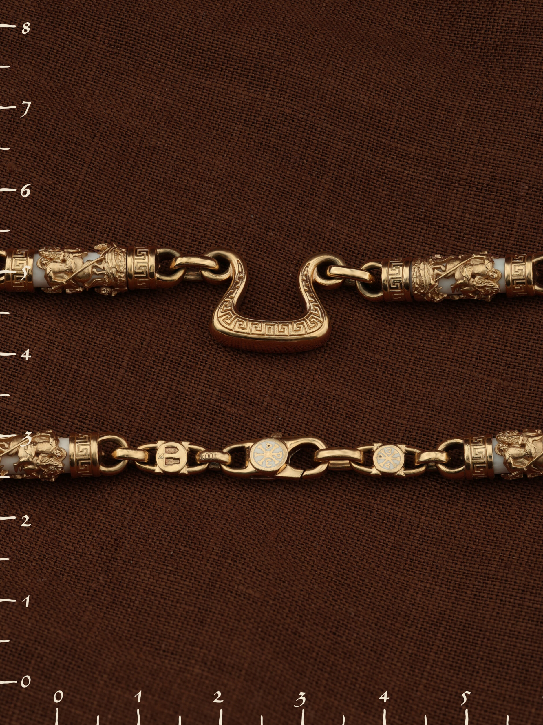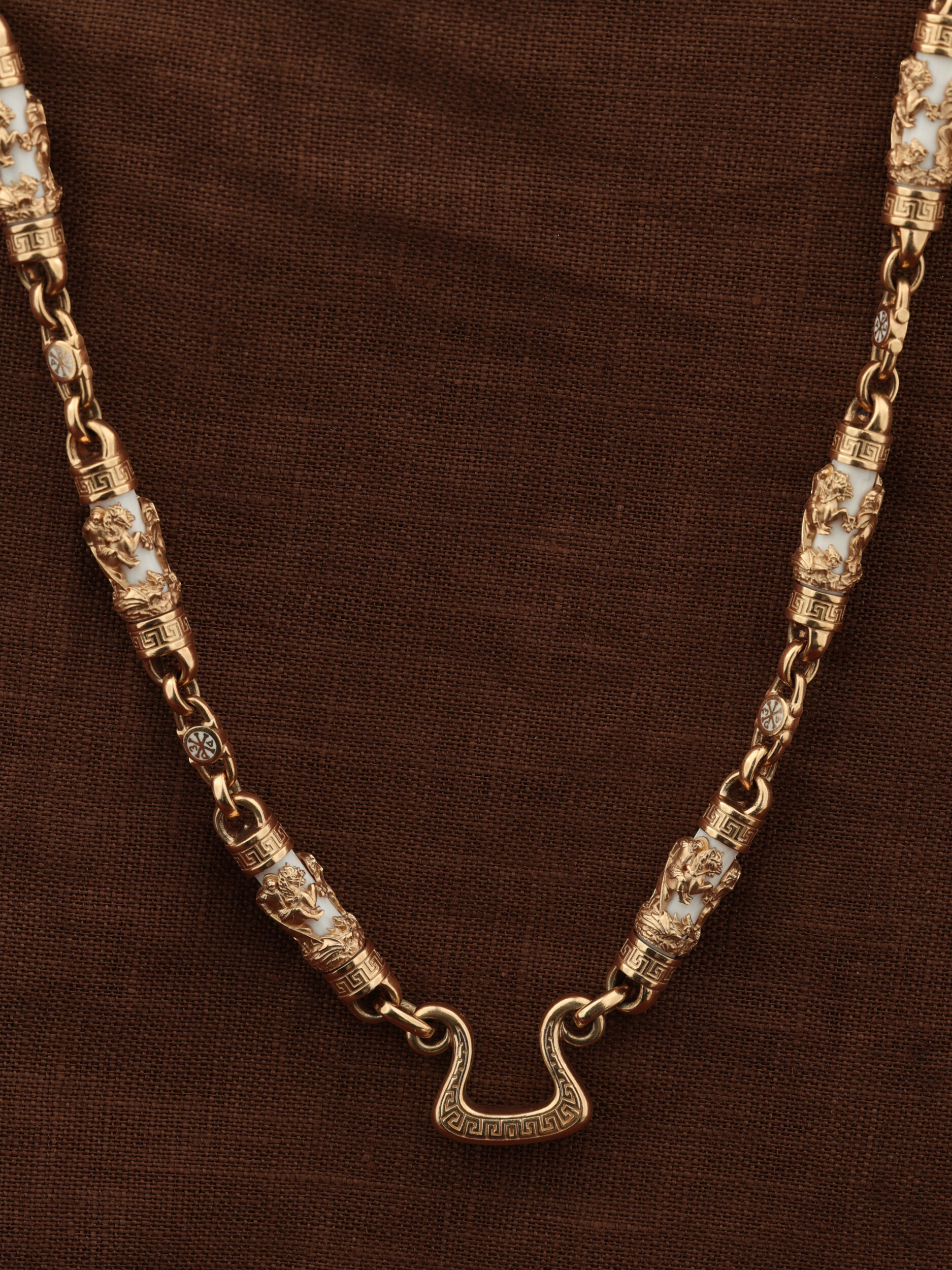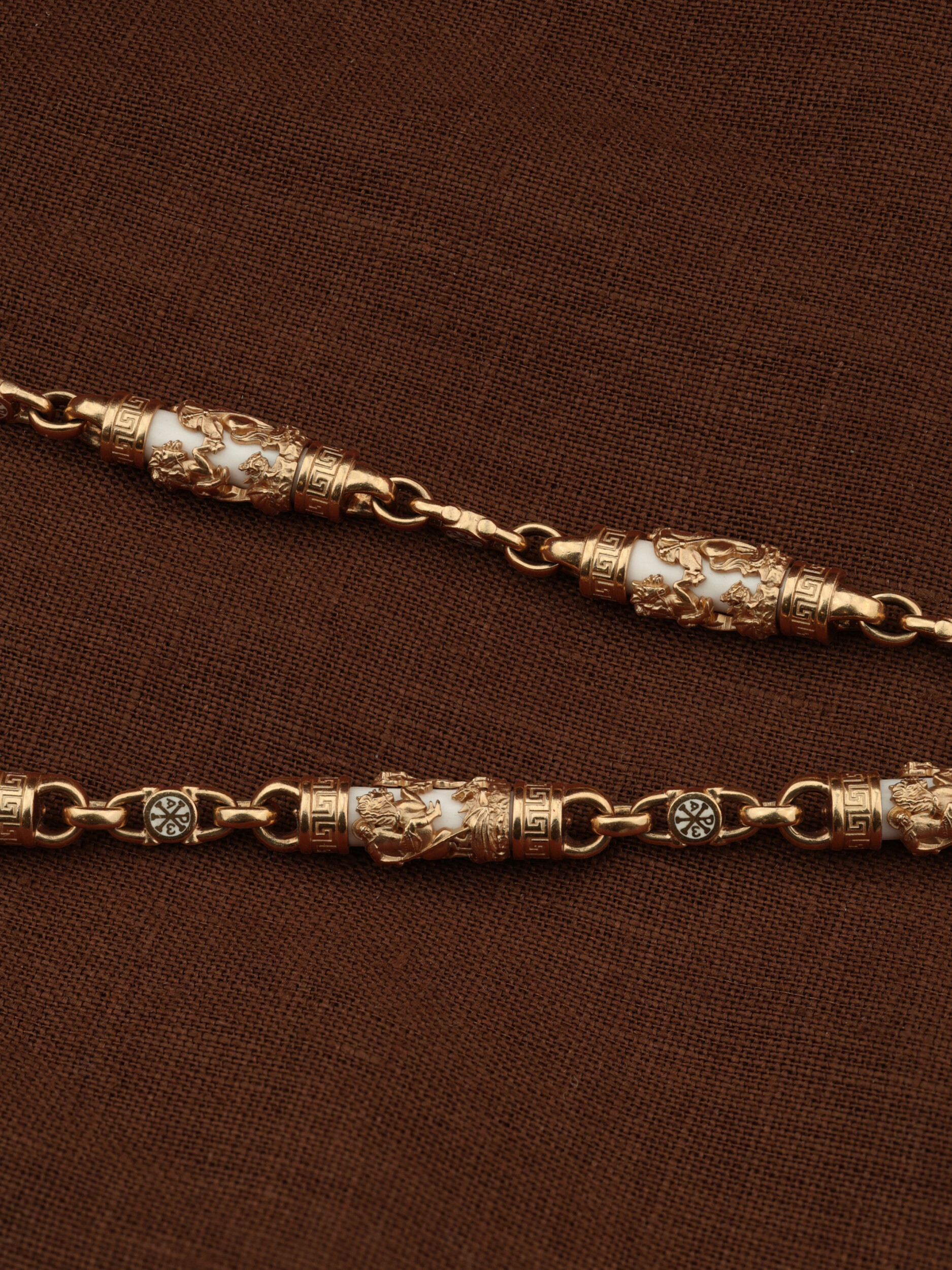 На звеньях цепи изображена Хризма — монограмма имени Христа, которая состоит из двух начальных греческих букв имени — Х (хи) и Р (ро), скрещённых между собой. По краям монограммы помещены греческие буквы a и w. Такое употребление этих букв восходит к тексту Апокалипсиса: «Аз есмь Альфа и Омега, начало и конец, говорит Господь, Который есть и был и грядет, Вседержитель.» (Откр. 1:8; см. также Откр. 22:13). Также на звеньях цепи помещено изображен святого великомученика Георгия Победоносца — одного из самых почитаемых и удивительных святых. Георгий родился в Каппадокии (Малая Азия) в семье богатых и знатных горожан. Юношей поступил на службу к римскому императору Диоклетиану, за отличное знание военного дела и проявленную в боях и походах храбрость был приближен к императору и удостоен высокого воинского звания. Во время начавшихся гонений на христиан, перешел на сторону гонимых и, отвергнув человеческий страх, стал ярым проповедником учения Христа. Мучители подвергли опального воеводу жесточайшим восьмидневным пыткам и казнили его (обезглавили) в возрасте около тридцати лет в 303 году. На Руси он известен как Юрий или Егорий, заступник для верующих, чья жизнь имеет какое-либо отношение к военным делам, помощник в крестьянском труде. На цепи Георгий изображен как воитель, сидящий на вздыбленном коне и поражающий копьем огнедышащего змея. Змей символизирует собою сатанинские силы. Молитвами вознесенными к Всевышнему и своей непреклонной верой он смог одолеть чудовище. Святой убил змея, спас царскую дочь, принесенную в жертву, и жителей города, их души от влияния дьявола, породив в них надежду и веру в Господа, призывая людей принять христианскую веру. Цепь украшена орнаментом.