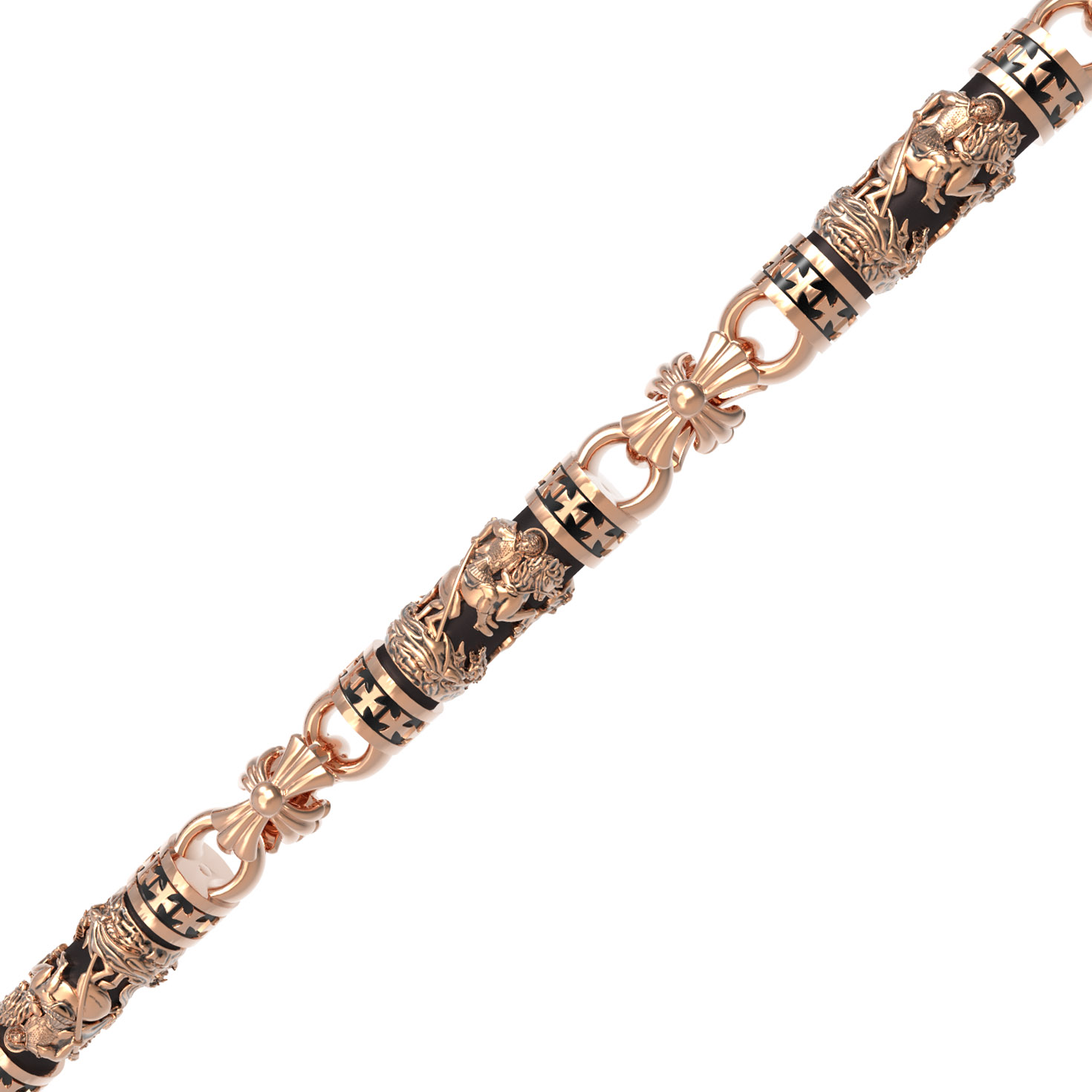 На звеньях цепи помещено изображение святого великомученика Георгия Победоносца — одного из самых почитаемых и удивительных святых. Георгий родился в Каппадокии (Малая Азия) в семье богатых и знатных горожан. Юношей поступил на службу к римскому императору Диоклетиану, за отличное знание военного дела и проявленную в боях и походах храбрость был приближен к императору и удостоен высокого воинского звания. Во время начавшихся гонений на христиан, перешел на сторону гонимых и, отвергнув человеческий страх, стал ярым проповедником учения Христа. Мучители подвергли опального воеводу жесточайшим восьмидневным пыткам и казнили его (обезглавили) в возрасте около тридцати лет в 303 году. На Руси он известен как Юрий или Егорий, заступник для верующих, чья жизнь имеет какое-либо отношение к военным делам, помощник в крестьянском труде. На цепи Георгий изображен как воитель, сидящий на вздыбленном коне и поражающий копьем огнедышащего змея. Змей символизирует собою сатанинские силы. Молитвами вознесенными к Всевышнему и своей непреклонной верой он смог одолеть чудовище. Святой убил змея, спас царскую дочь, принесенную в жертву, и жителей города, их души от влияния дьявола, породив в них надежду и веру в Господа, призывая людей принять христианскую веру.. На замке цепи изображена Хризма — монограмма имени Христа, которая состоит из двух начальных греческих букв имени — Х (хи) и Р (ро), скрещённых между собой. По краям монограммы помещены греческие буквы a и w. Такое употребление этих букв восходит к тексту Апокалипсиса: «Аз есмь Альфа и Омега, начало и конец, говорит Господь, Который есть и был и грядет, Вседержитель.» (Откр. 1:8; см. также Откр. 22:13).