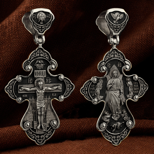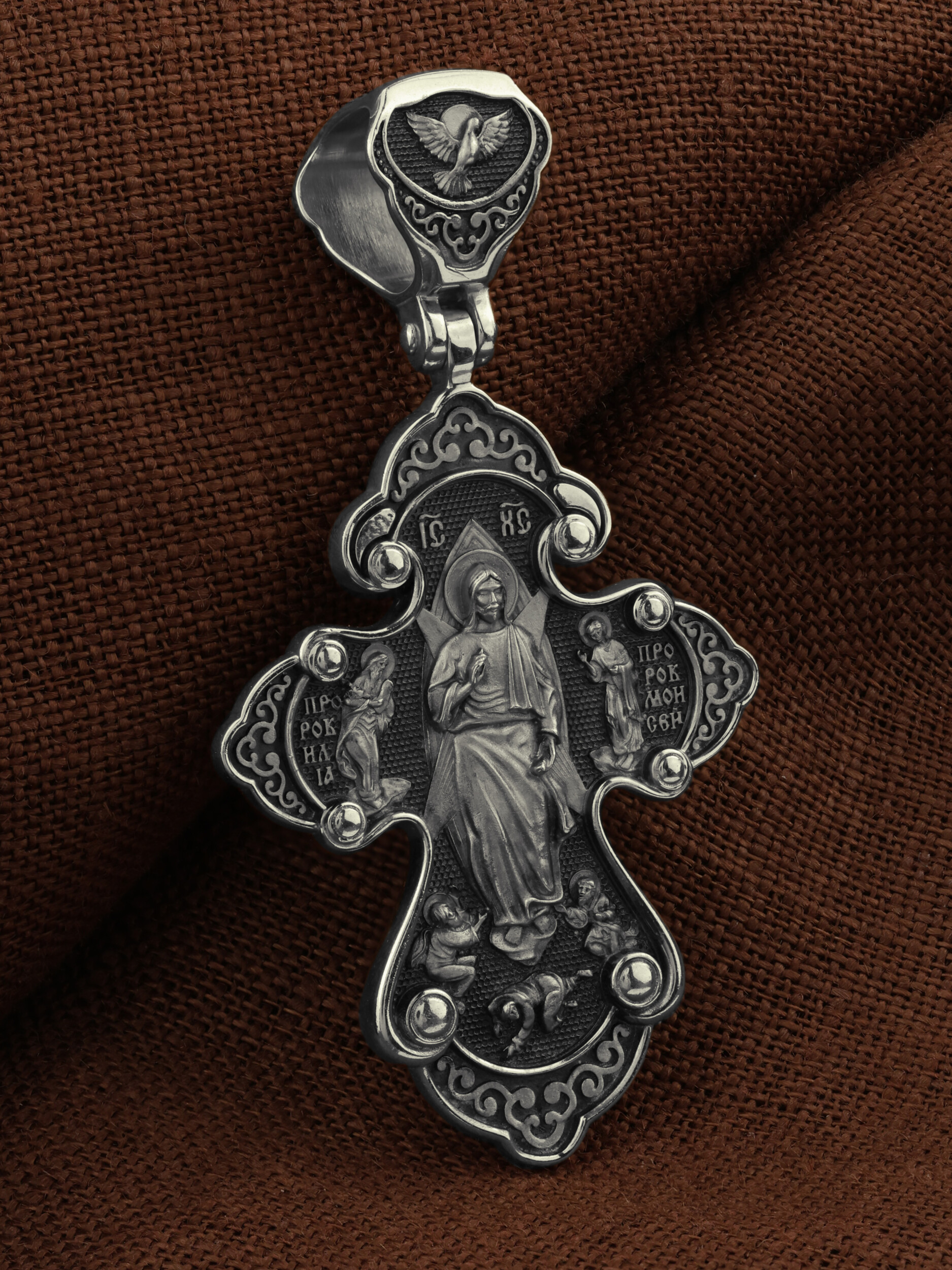 На оборотной стороне креста изображена икона «Преображение Господне». Иисус Христос вместе со своими учениками Петром, Яковом и Иоанном взошел на гору Фавор для молитвы. Пока Господь молился, ученики заснули, а проснувшись увидели, что Иисус преобразился — «лицо Его просияло, а одежды сделались ослепительно белыми». Рядом с Сыном Божьим они увидели ветхозаветных пророков — Моисея и Илию, которые беседовали с Ним о грядущих искупительных страданиях. Увидев такую картину, апостолов охватила неземная благодать, они захотели, чтобы это состояние продолжалось все время. А через некоторое время сверху сошло облако, которое скрыло Иисуса, Илию и Моисея от взора учеников и они услышали из облака Божий глас: « Сей есть Сын Мой возлюбленный, в Котором Мое благоволение. Его слушайте!» (Мф. 17,1−13). В страхе и почтении Петр, Иоанн и Иаков повалились на землю. Вскоре к ним подошел Иисус Христос в своей обычной одежде и сказал им, чтобы больше никто из людей, до Его Воскрешения, не знал о том, что произошло на этой горе. На кулонном кольце изображен парящий голубь — символ Святого Духа и Его благодати.