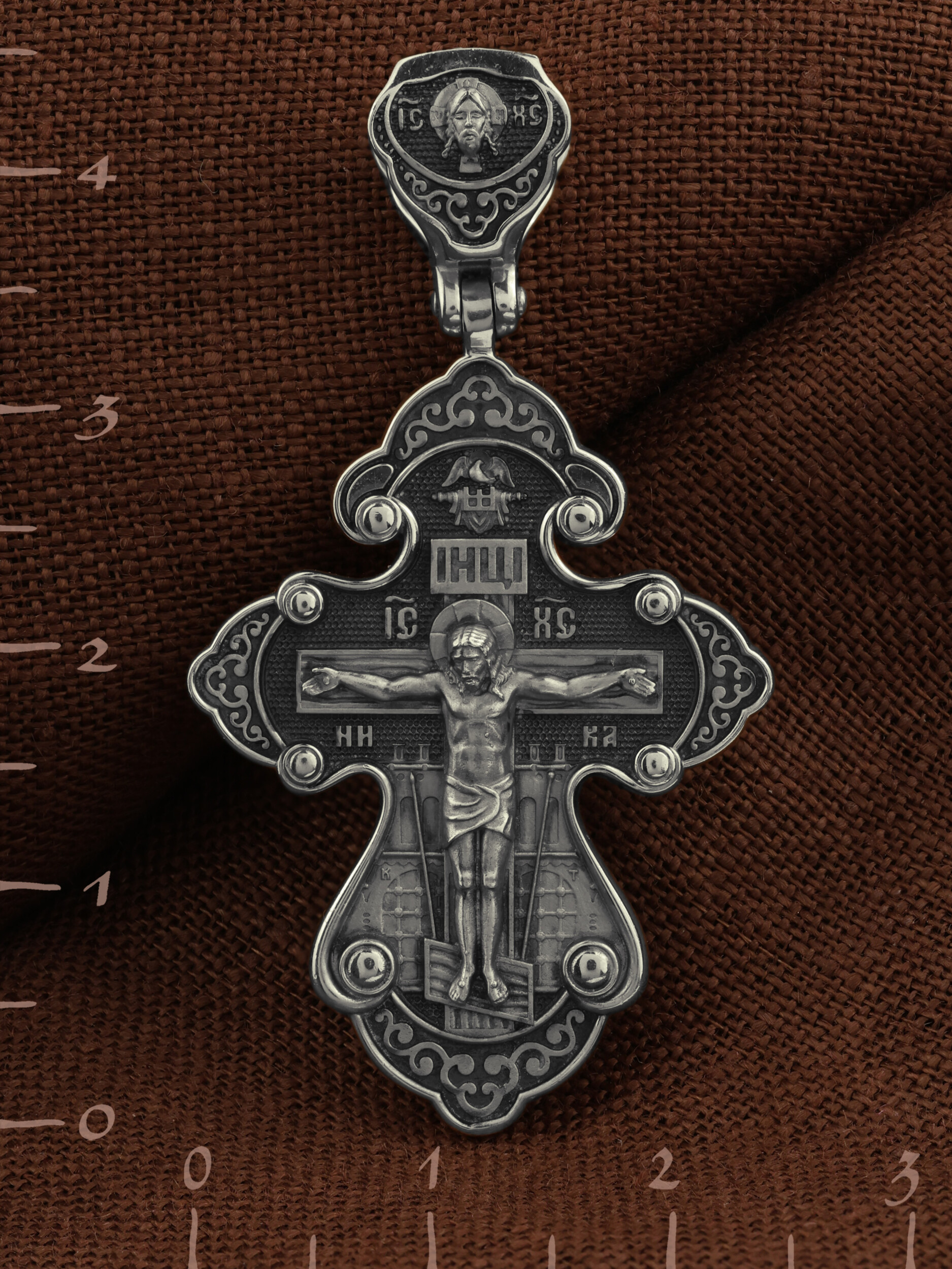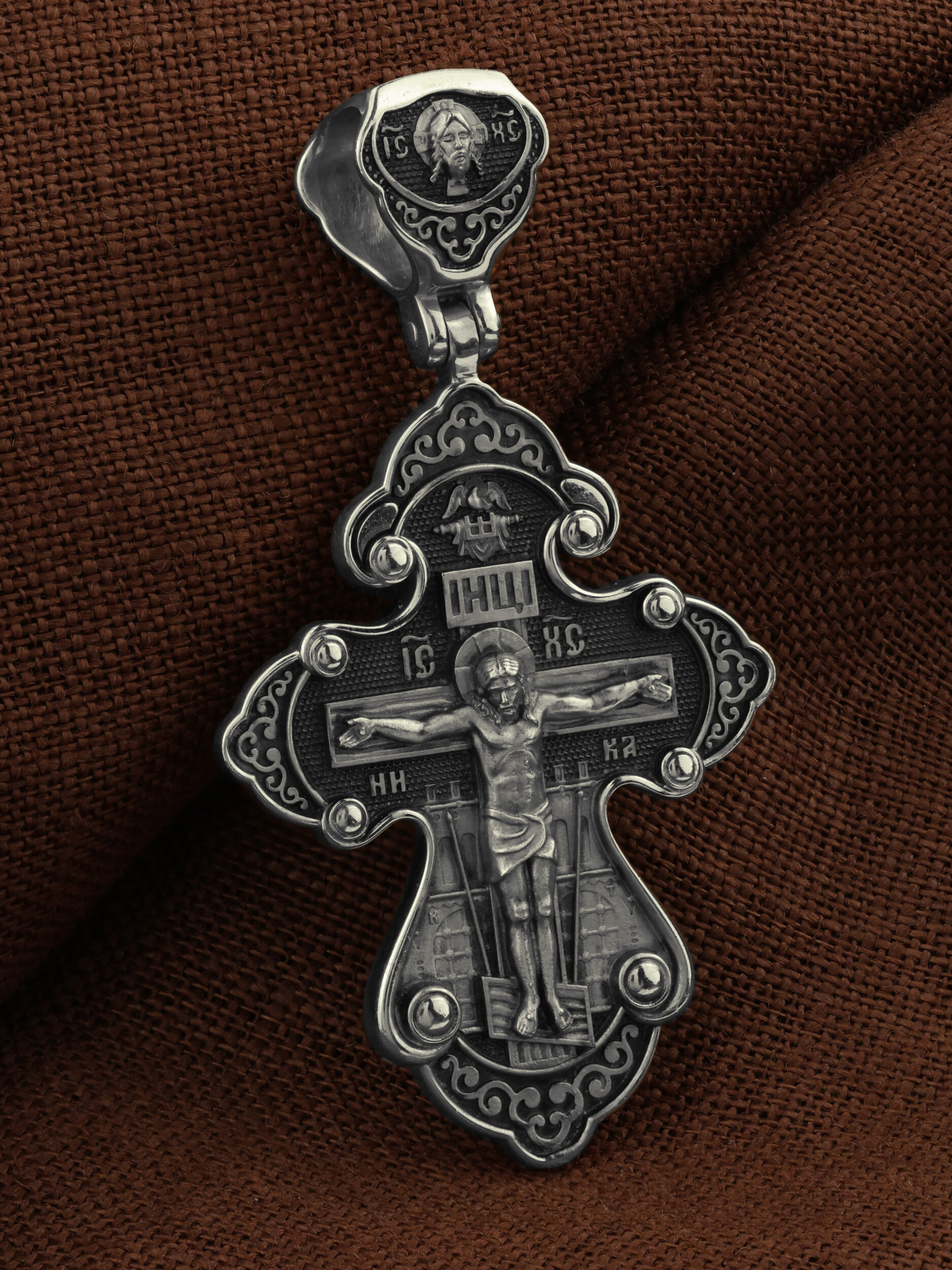На лицевой стороне креста изображено Распятие Господа и Спасителя нашего Иисуса Христа, отдавшего Себя на смерть, для искупления грехов мира. Крест является символом жертвенной любви Всеблагого Бога к падшим людям, всепобеждающим духовным оружием христиан, основанием и средоточием церковной жизни. Господь сказал: кто хочет идти за Мною, отвергнись себя, и возьми крест свой, и следуй за Мною. (Мк. 8: 34). На верхней табличке, выше головы Иисуса, расположена надпись, составленная Понтием Пилатом — «IНЦI». Она означает «Иисус Назорей, Царь Иудейский». Надпись «IC» «ХC», означает Иисус Христос, помещается на разных сторонах поперечной перекладины креста. Рядом — слово «НИКА», что означает «победитель». За крестом высится Иерусалимская стена, в знак того, что Господь был распят вне стен города. На кулонном кольце изображен Нерукотворный образ Господа и Спасителя нашего Иисуса Христа, чудесно отпечатавшийся на плате, котором Христос вытер свой лик.