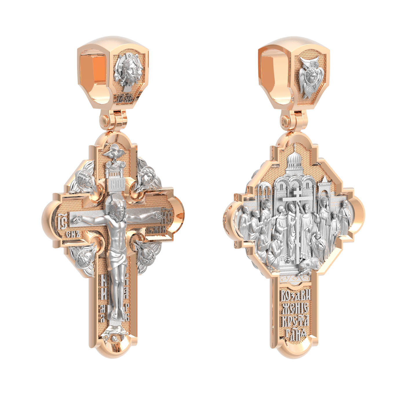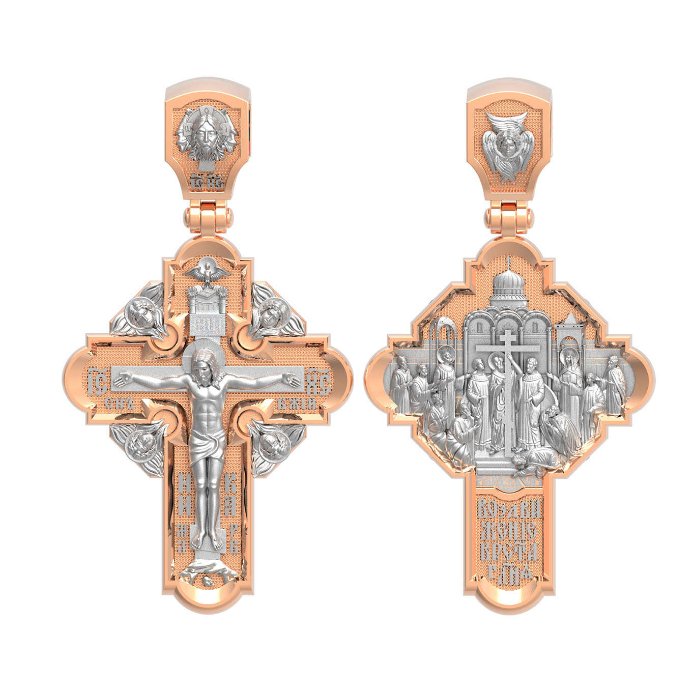 На оборотной стороне креста изображена икона Воздвижение Честного и Животворящего Креста Господня. Равноапостольный царь Константин пожелал построить храмы Божии на священных для христиан местах в Палестине и найти Крест, на котором был распят Спаситель. Исполнить желание царя взялась, с великою радостью, его мать, св. равноапостольная царица Елена. Крест был обретен в 326 году около горы Голгофы в Иерусалиме. C VII века с этим днём стали соединять память о возвращении Животворящего Креста из Персии византийским императором Ираклием (629). Праздник называется Воздвижением Креста, потому что и при обретении, и при возвращении Креста патриарх Макарий поднимал (Воздвигал) крест три раза, чтобы все могли его видеть. Народ же, видя Крест Спасителя, кланялся и восклицал: «Господи, помилуй!». Св. равноапостольные цари Константин и Елена, над местом страданий, погребения и воскресения Иисуса Христа построили обширный и великолепный храм в честь Воскресения Христова. На кулонном кольце изображен шестикрылый Ангел — Серафим.